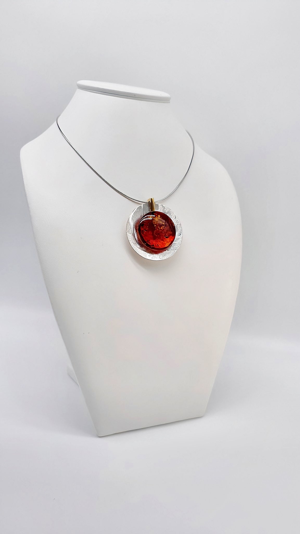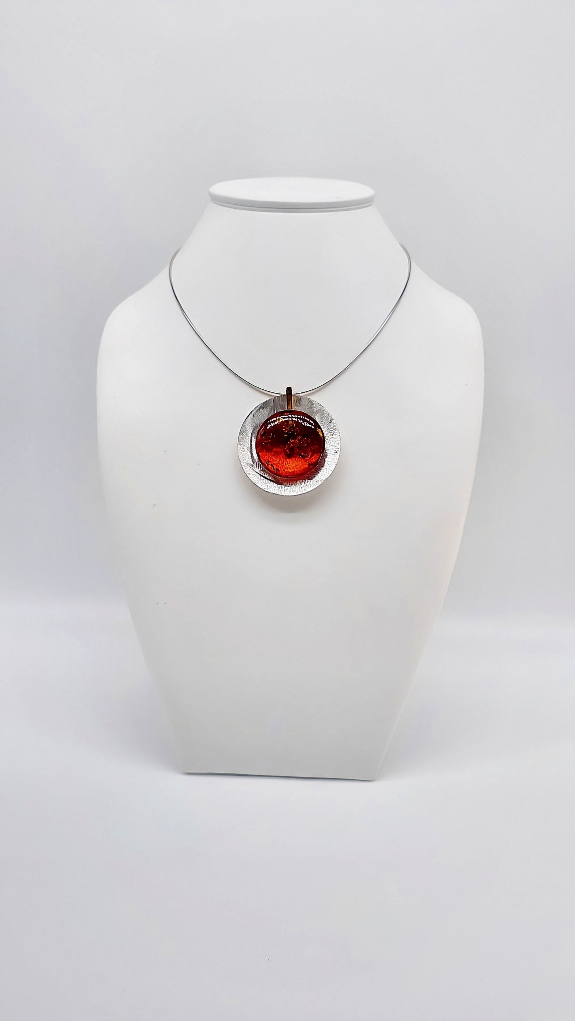 This modern pendant combines the captivating depth of amber with the cool elegance of silver. The round amber is artfully embedded in a brushed silver setting that beautifully reflects the light and highlights the stone's natural beauty. The pendant is lightweight and comfortable to wear, making it perfect for everyday wear as well as special occasions. A unique piece of jewelry that adds a special touch of elegance and sophistication to any outfit.