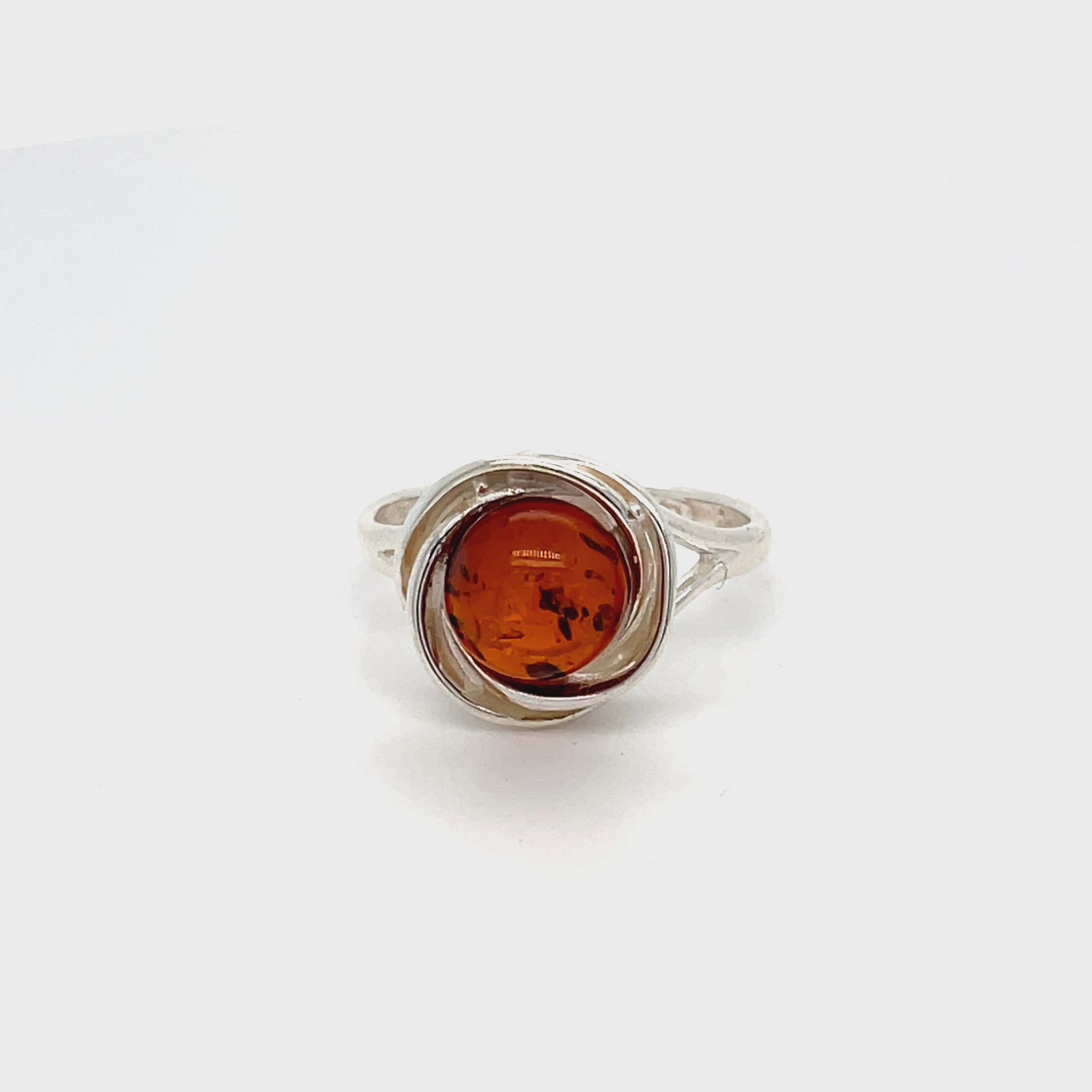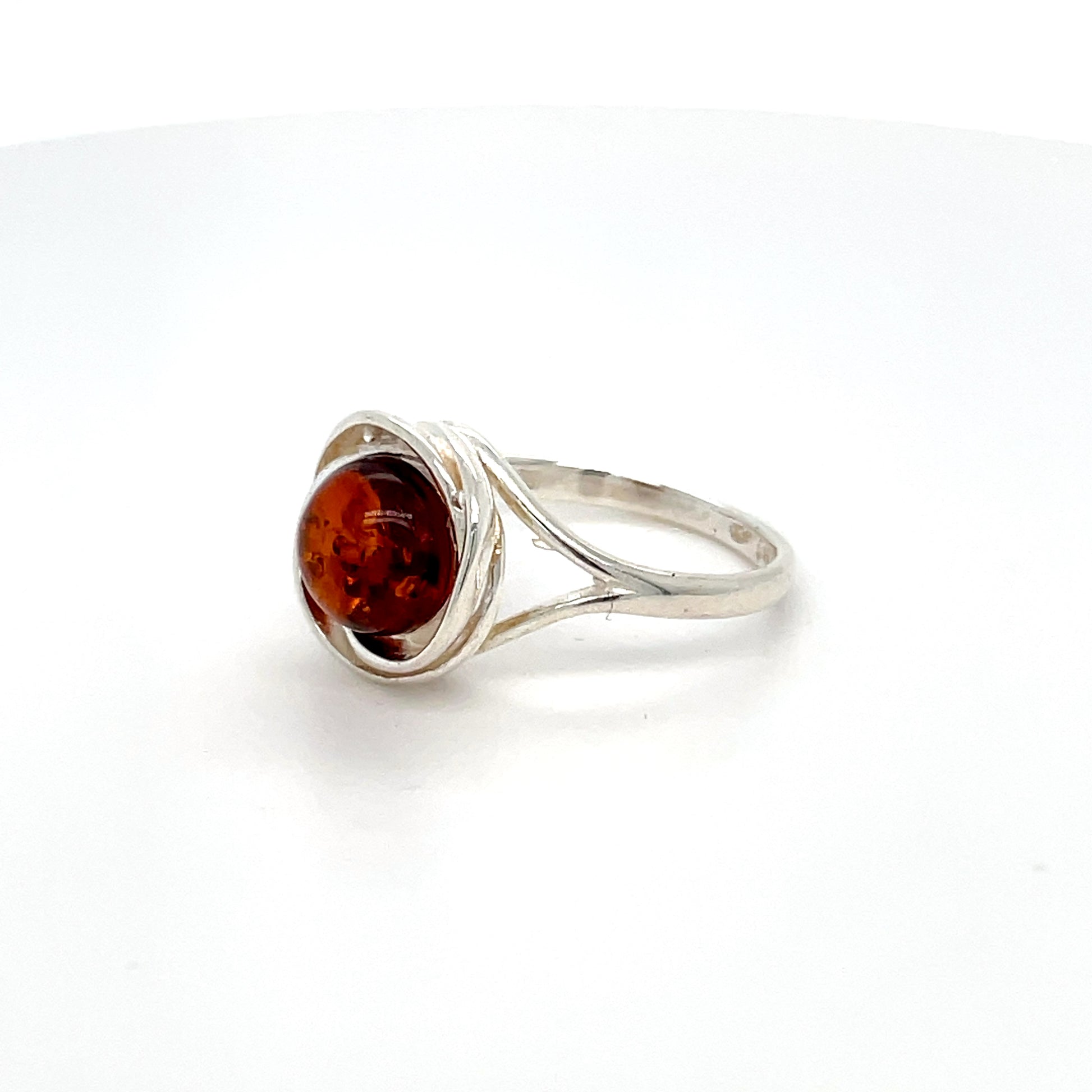 Der rund gefasste Bernstein wirkt wie ein leuchtender Mittelpunkt und verleiht dem Ring eine harmonische, sanfte Ausstrahlung.