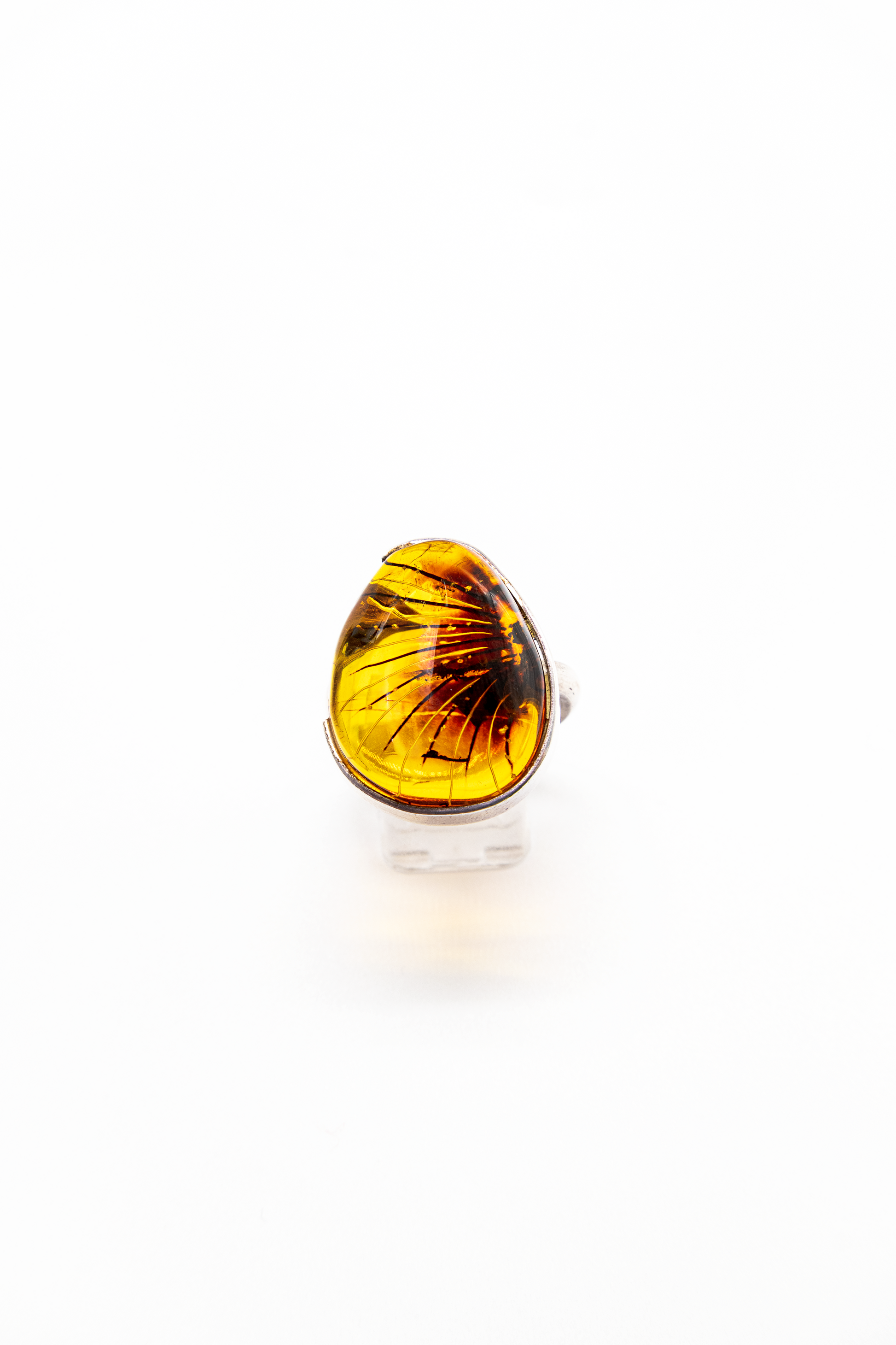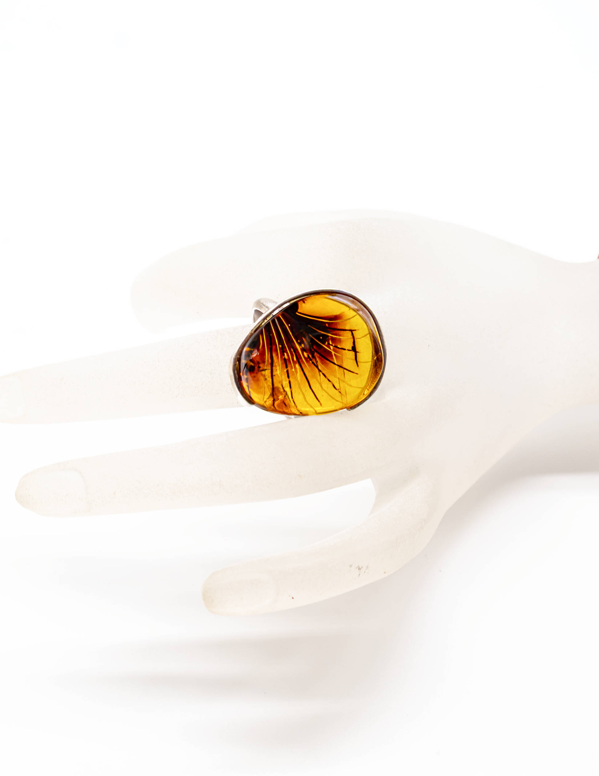 Der Ring ist ein handgefertigtes Einzelstück, dessen individueller Bernstein durch seine einzigartige Struktur sofort ins Auge fällt.
