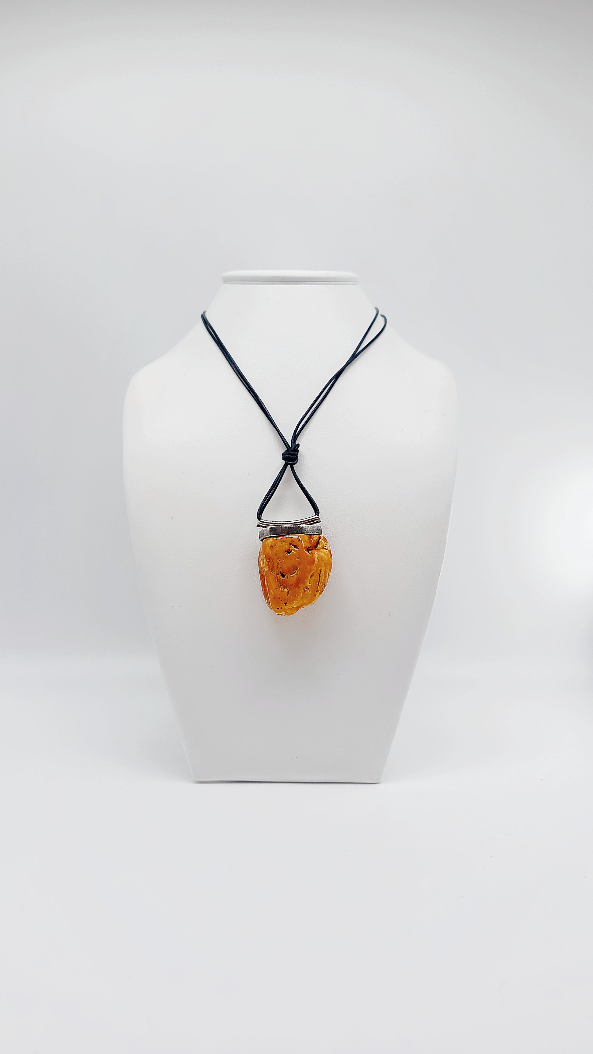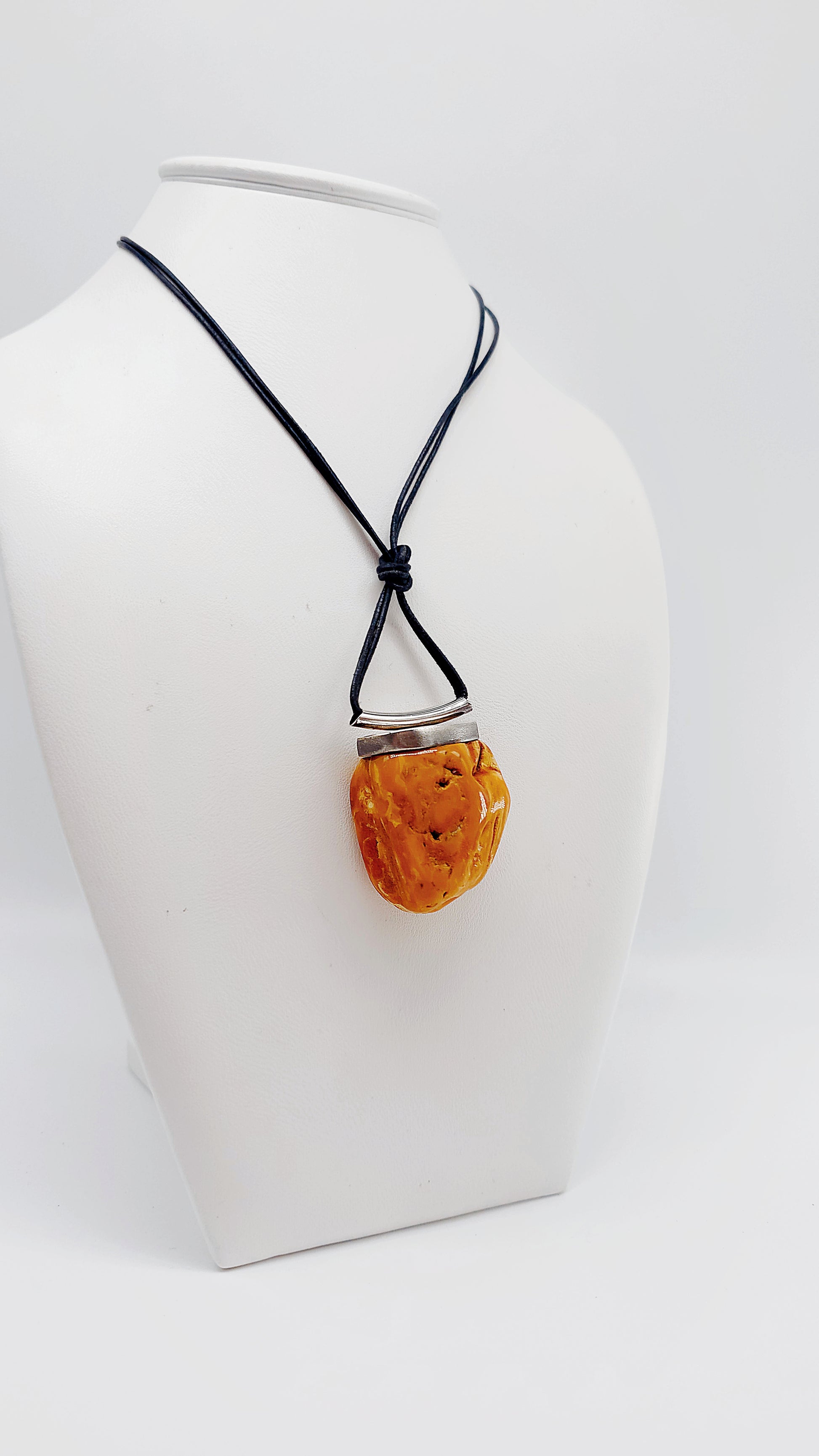 This unique amber pendant, in its raw, natural form, is a true gem of nature. The pendant showcases the unaltered beauty of amber, set in a subtle silver frame and attached to a sturdy leather cord. Each stone is unique, captivating with its individual shape and color. This pendant is perfect for anyone who appreciates the pristine beauty of nature and wants to emphasize their style with an authentic, natural accessory.