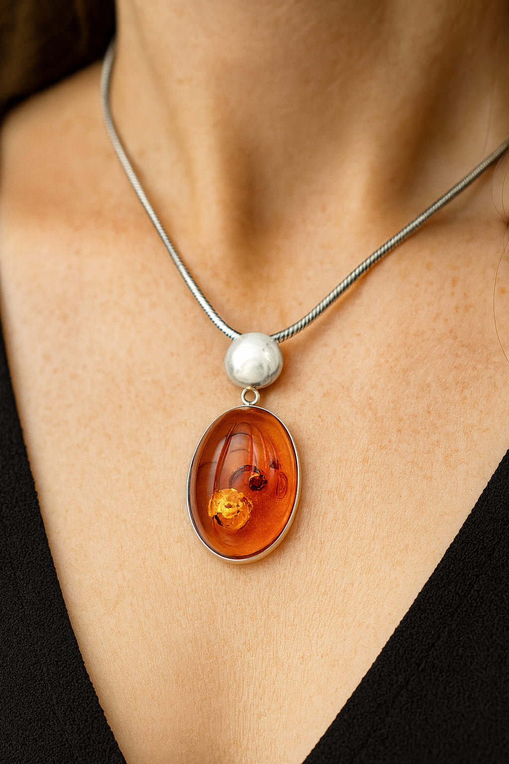Dieser Anhänger ist ein besonderes Schmuckstück, das Sie nur ein einziges Mal kaufen können – denn er existiert genau so nur einmal. Der warme orangefarbene Bernstein zeigt faszinierende natürliche Einschlüsse, die bei jedem Lichteinfall leuchten und das Stück lebendig wirken lassen. Die hochwertige Fassung aus 925er Sterlingsilber verstärkt den edlen Charakter und macht den Anhänger zu einem zeitlosen Begleiter für Alltag und besondere Anlässe.
