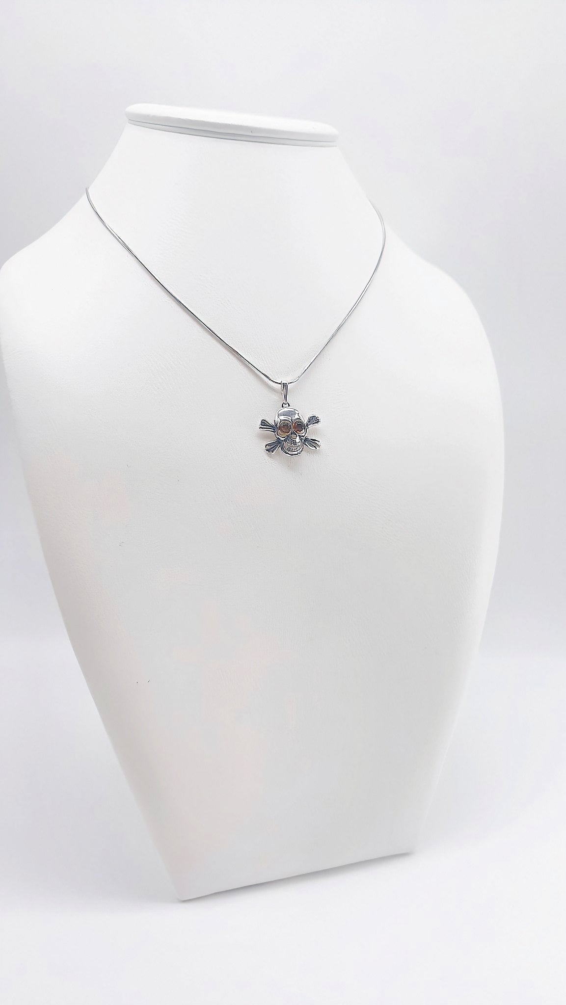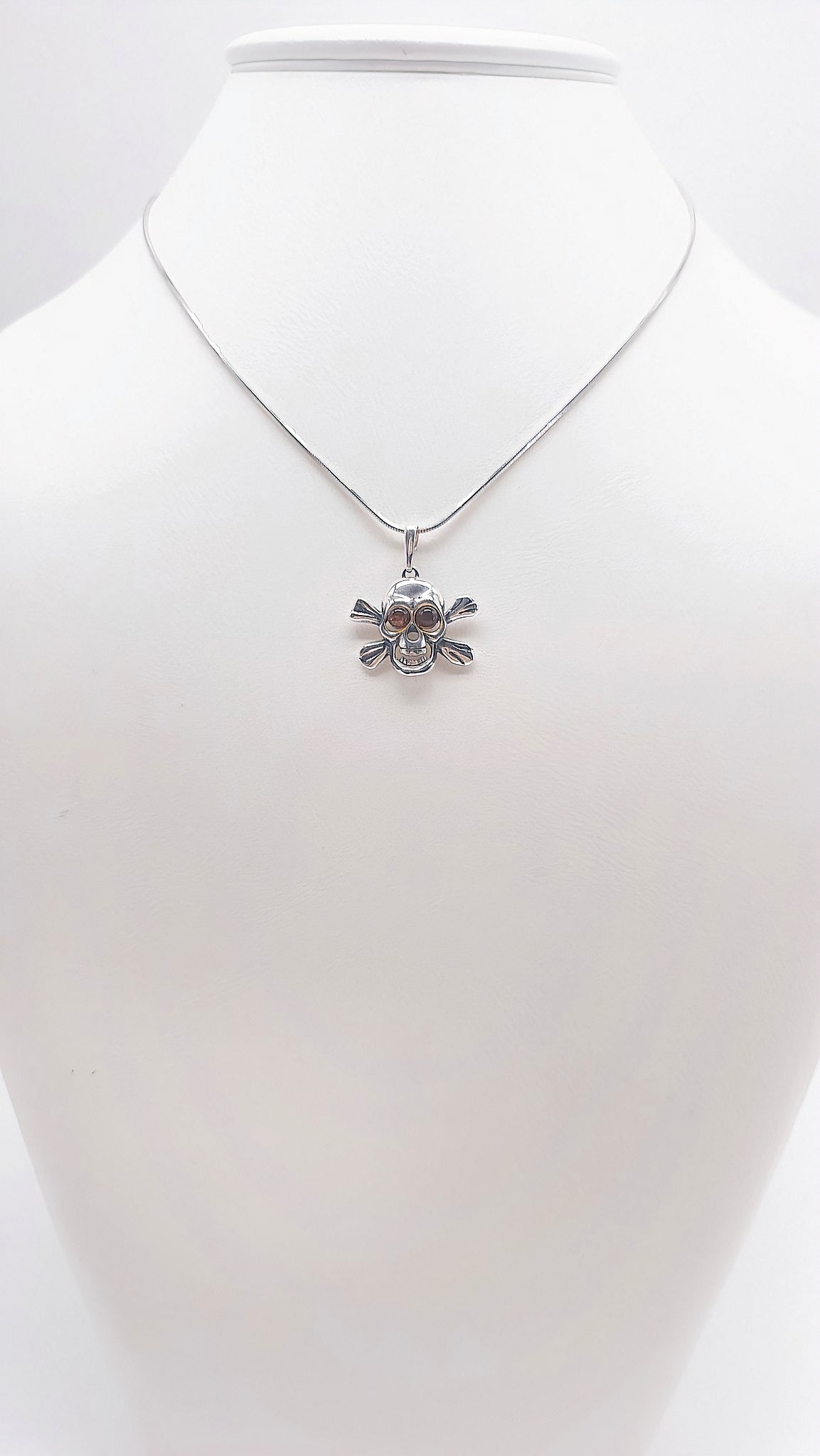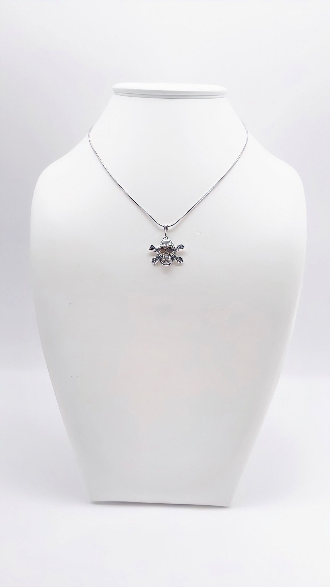 This striking pendant, crafted from 925 sterling silver, features a skull adorned with sparkling amber. The combination of the cool sheen of the silver and the warm tones of the amber gives this pendant a special depth and expressiveness. Ideal for those who want to make a bold statement and have a penchant for adventure. Perfect as a unique accessory or special gift.