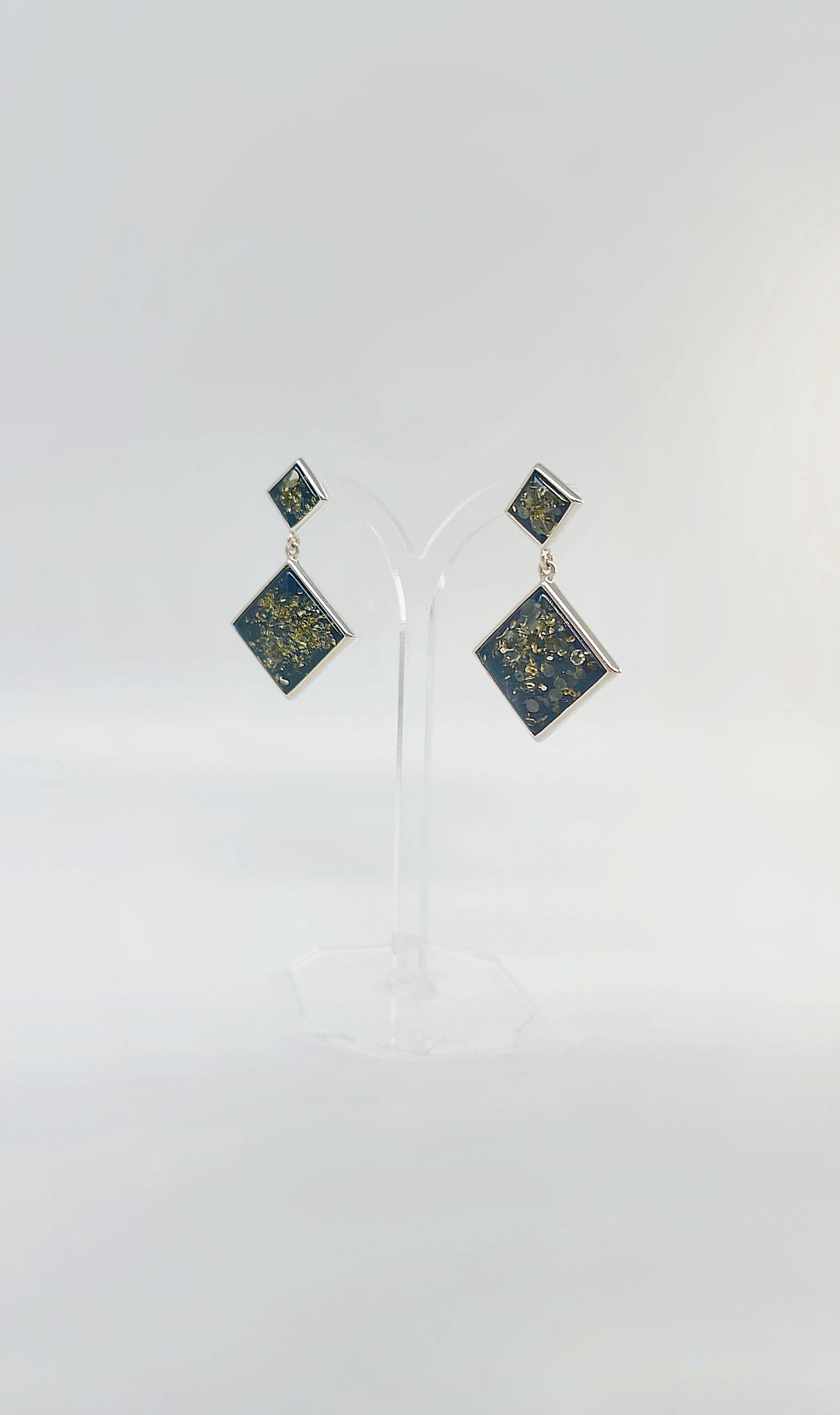 These modern earrings combine the natural beauty of amber with an elegant silver frame featuring a geometric design. The square amber pendants perfectly capture the light, giving these earrings a special depth and brilliance. Ideal for everyday wear or special occasions, these earrings are a stylish accessory that adds a touch of sophistication to any outfit. Perfect as a gift or to add a modern touch to your own jewelry collection.