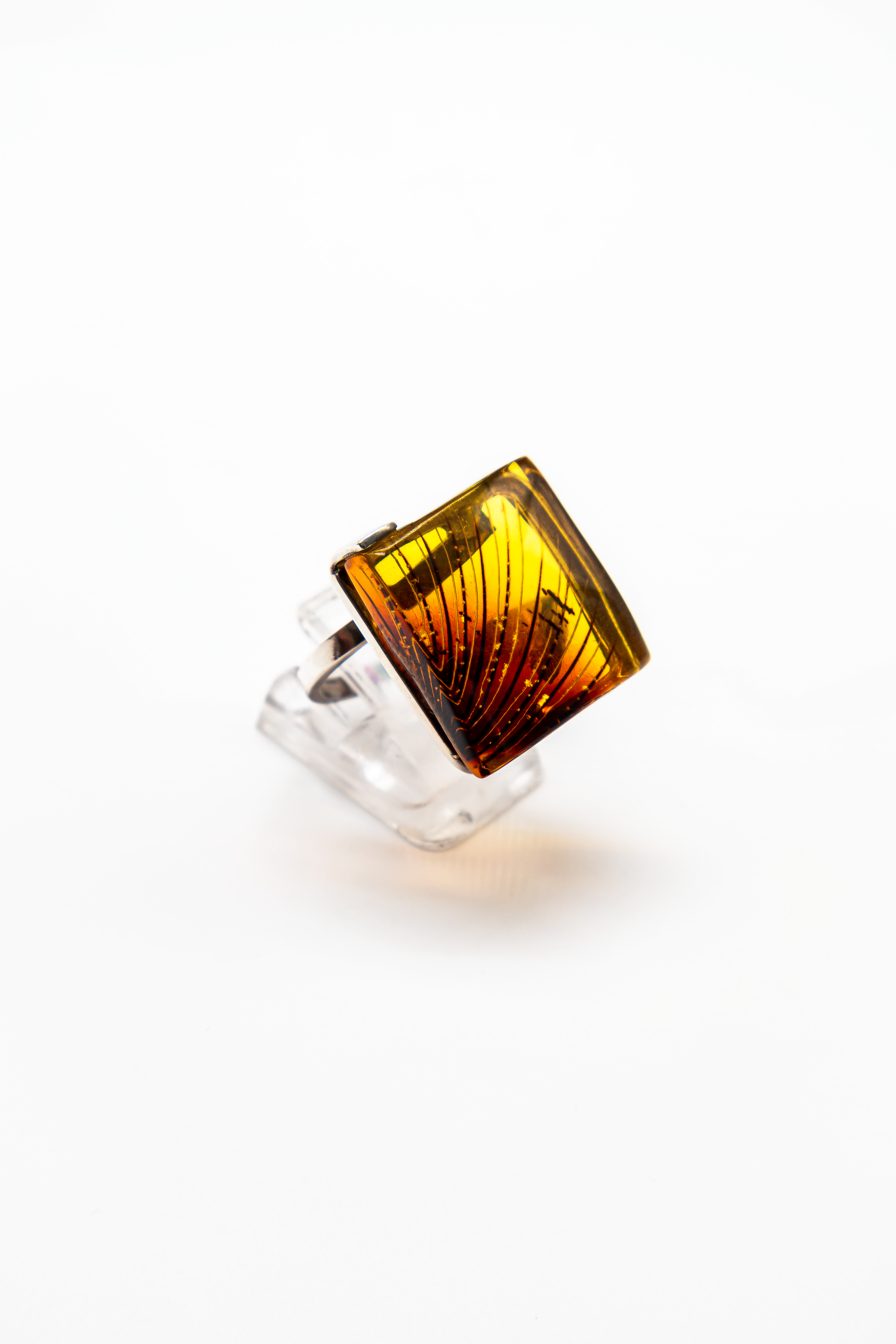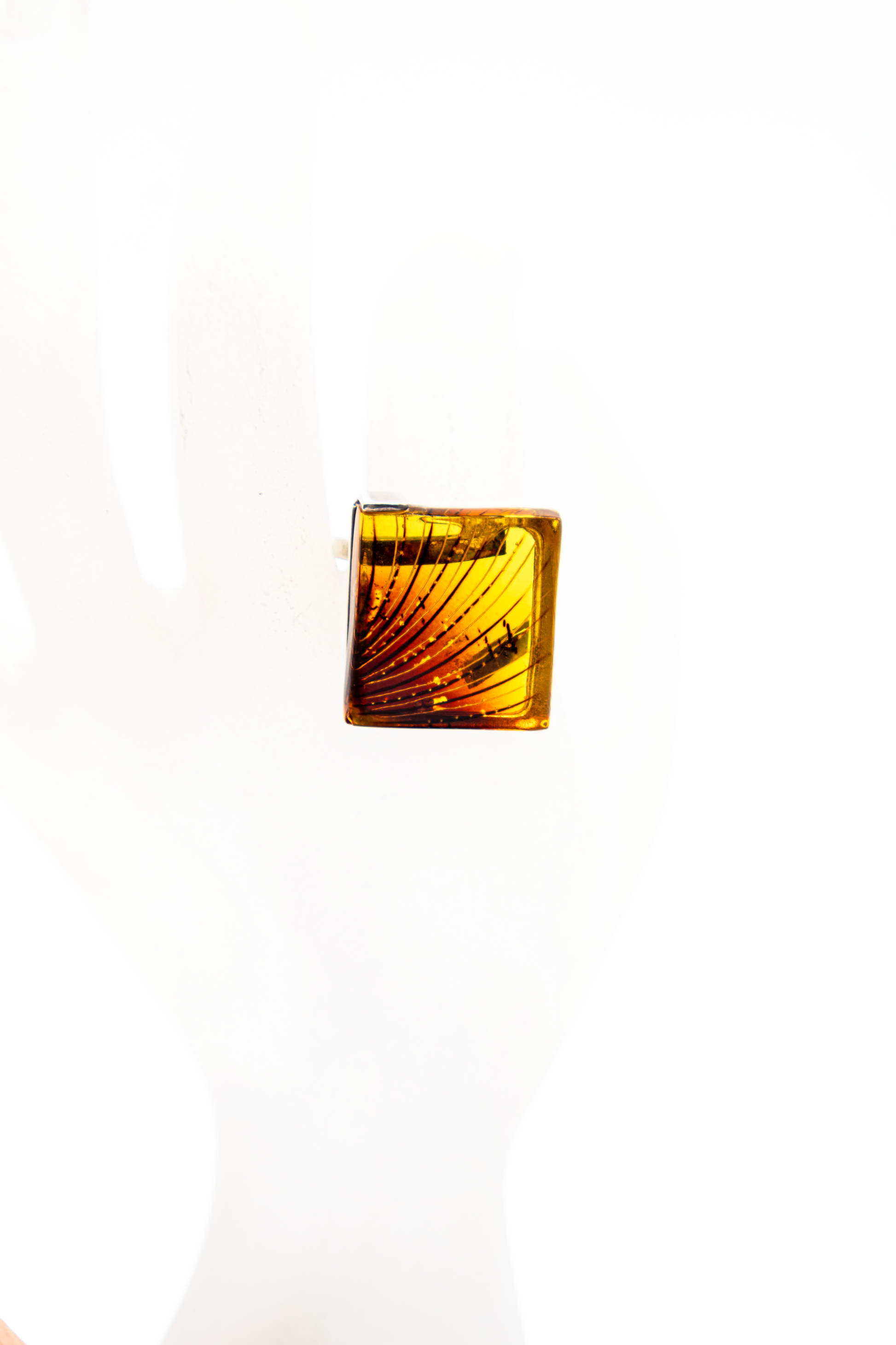 Dieses außergewöhnliche Ring-Unikat beeindruckt durch seinen modernen, quadratischen Bernstein mit einer faszinierenden inneren Struktur. Die warmen Gold- und Cognactöne spiegeln das Licht kraftvoll wider und machen das Schmuckstück zu einem echten Blickfang. In Kombination mit massivem 925er Sterlingsilber entsteht ein Ring, der gleichermaßen stilvoll, hochwertig und außergewöhnlich wirkt.