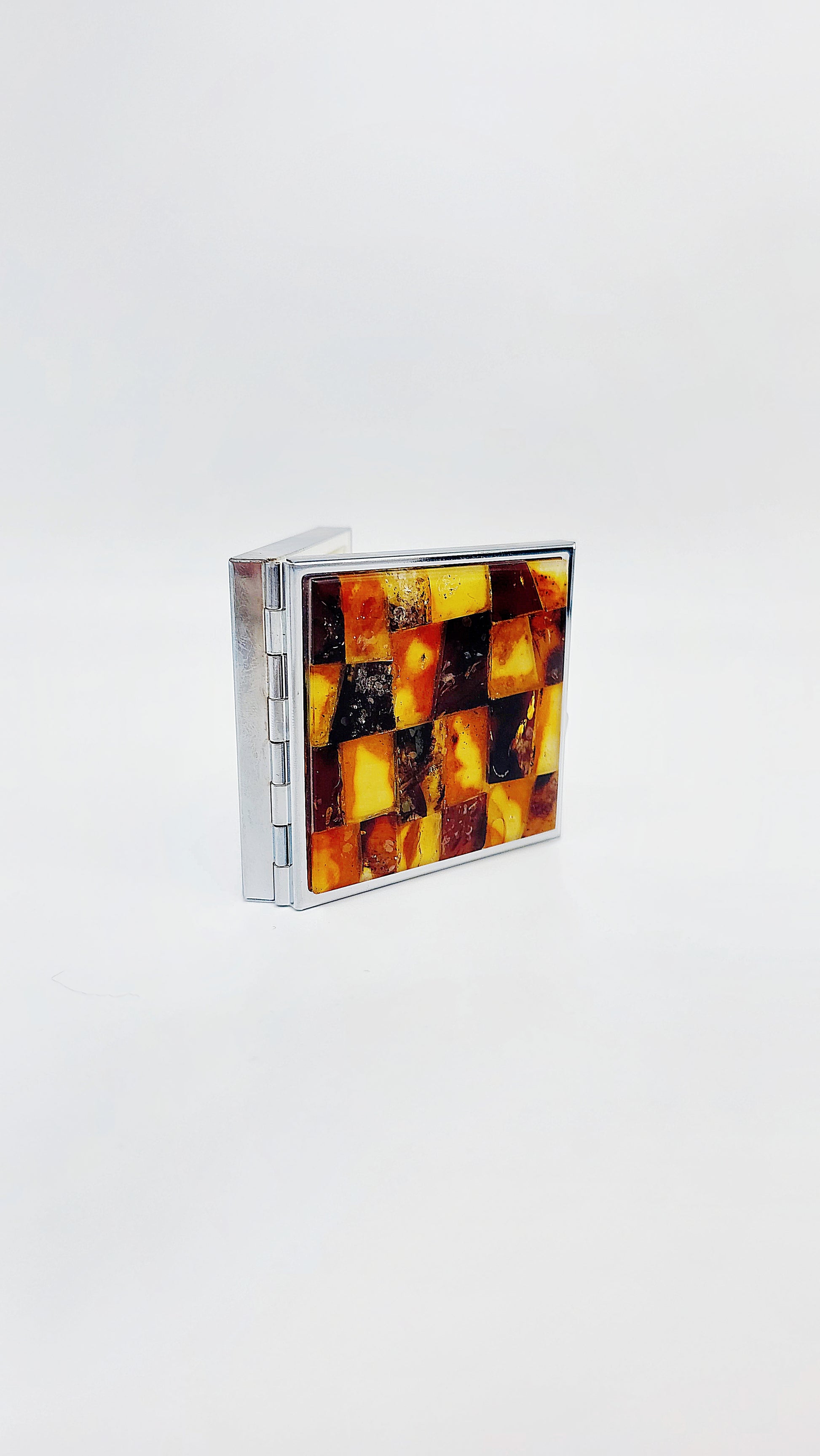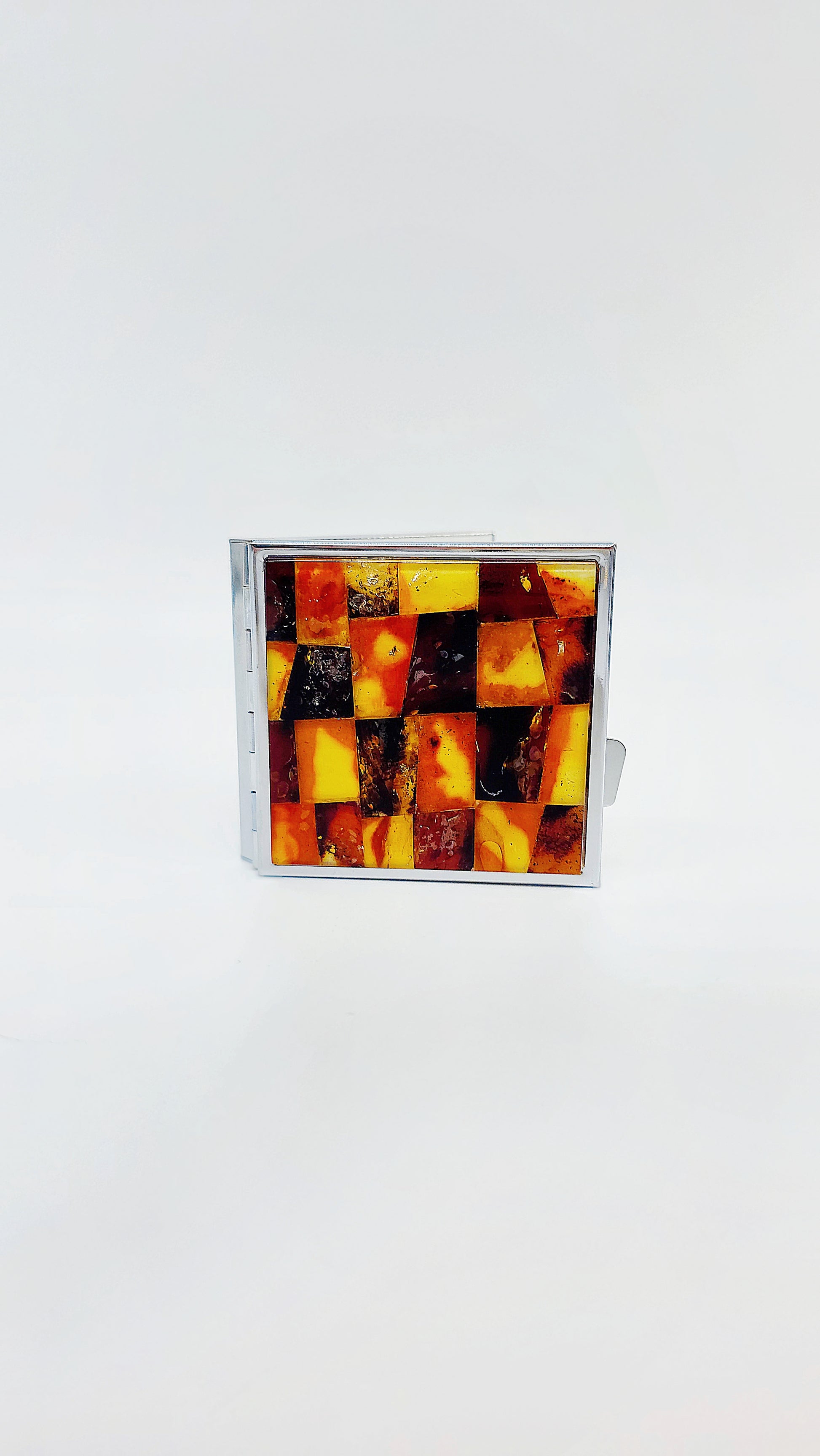 This rectangular amber pill box made of stainless steel combines elegance and functionality in one stylish accessory. The surface is decorated with an artistic mosaic of genuine natural amber , making each piece unique . The robust stainless steel body securely protects the contents and ensures long-lasting use.