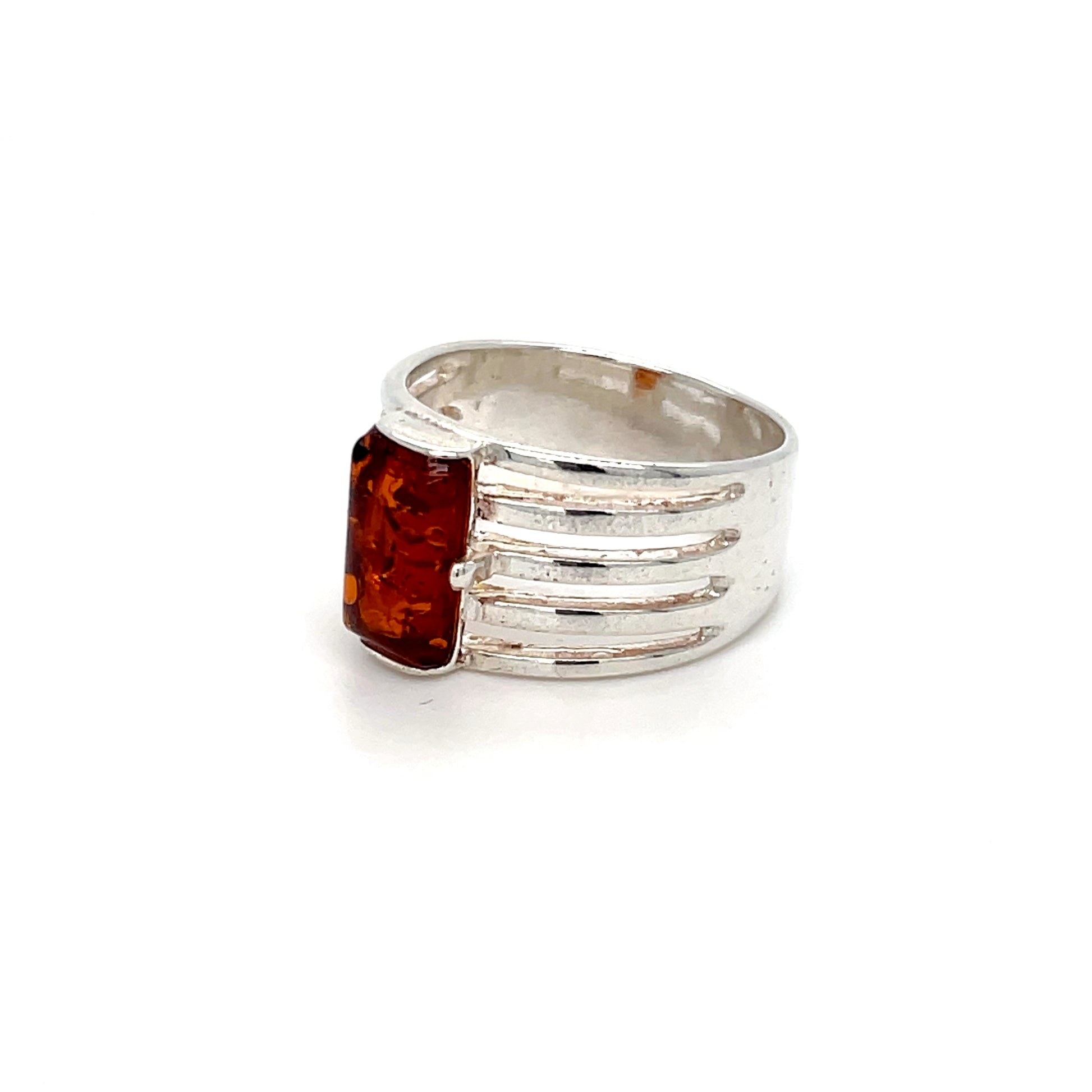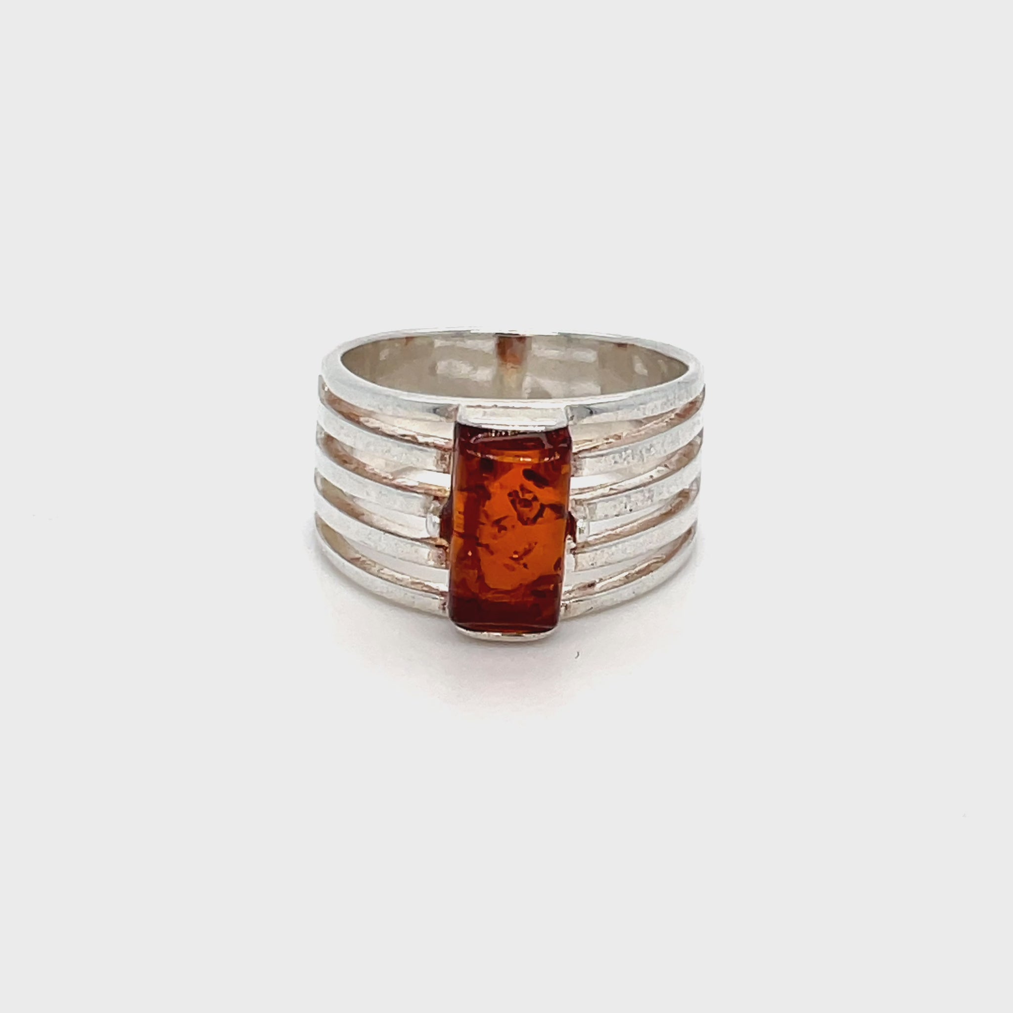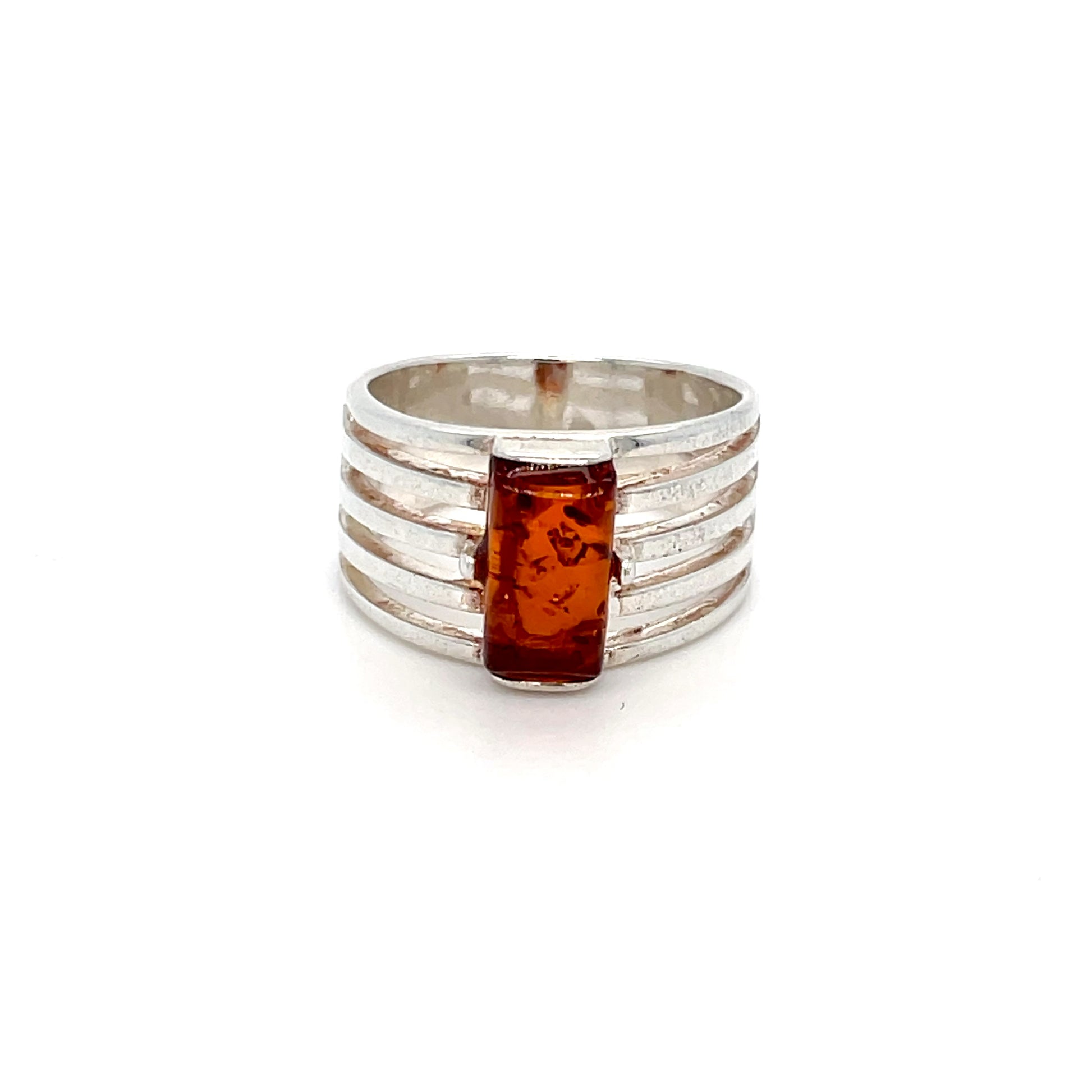 Die mehrreihige Silberband-Optik hebt den warmen Bernstein perfekt hervor und macht den Ring zu einem echten Blickfang.