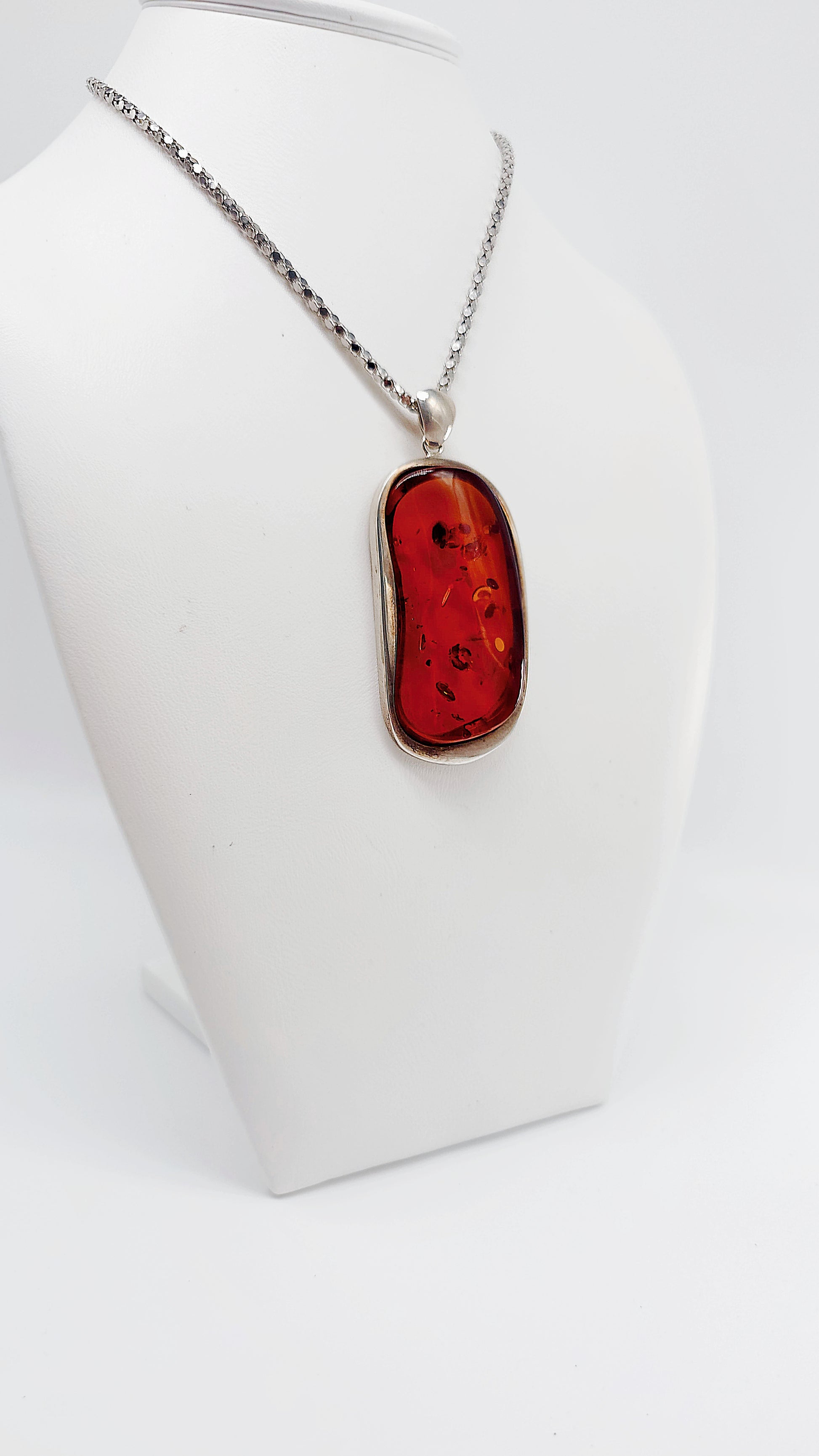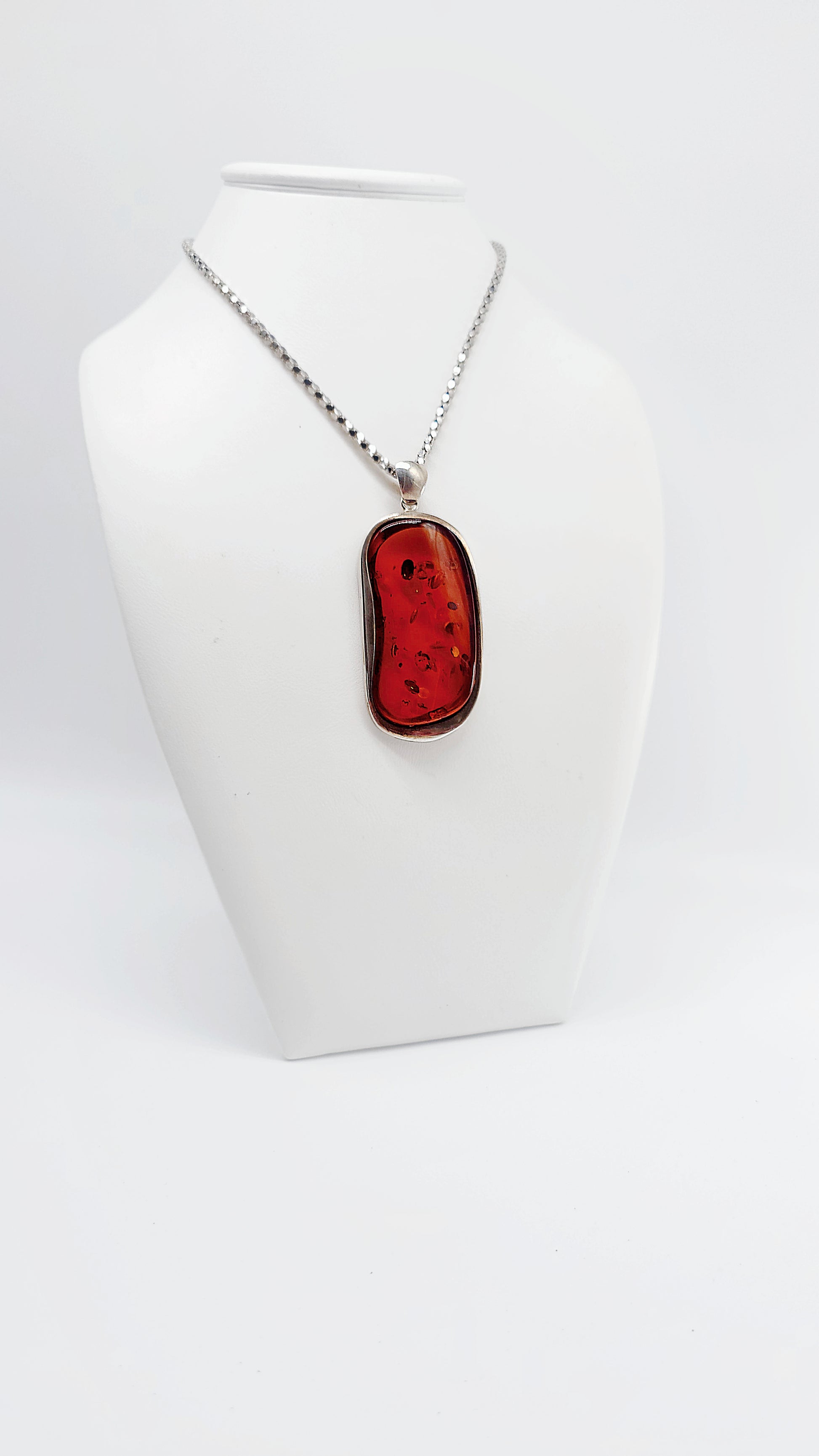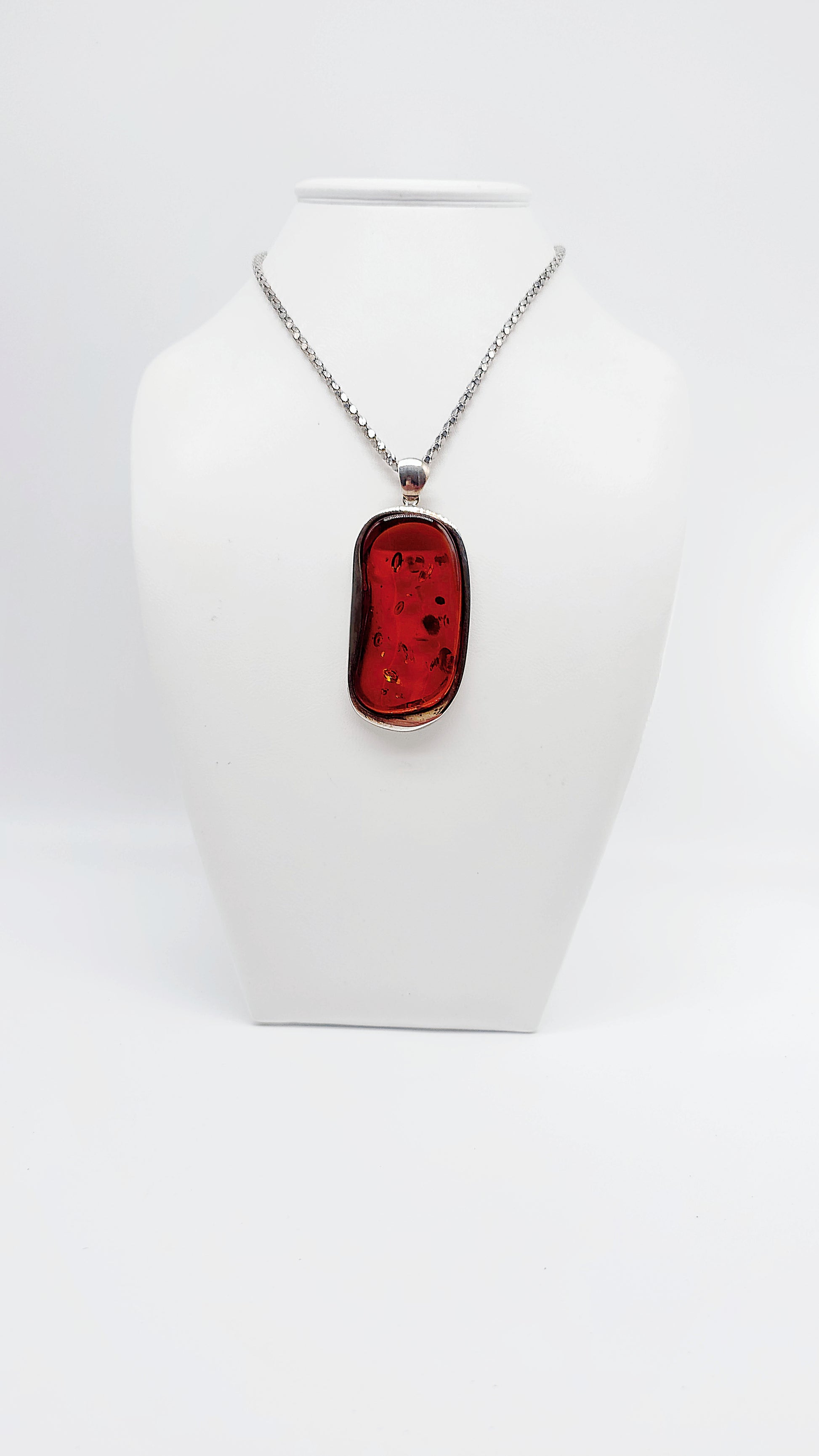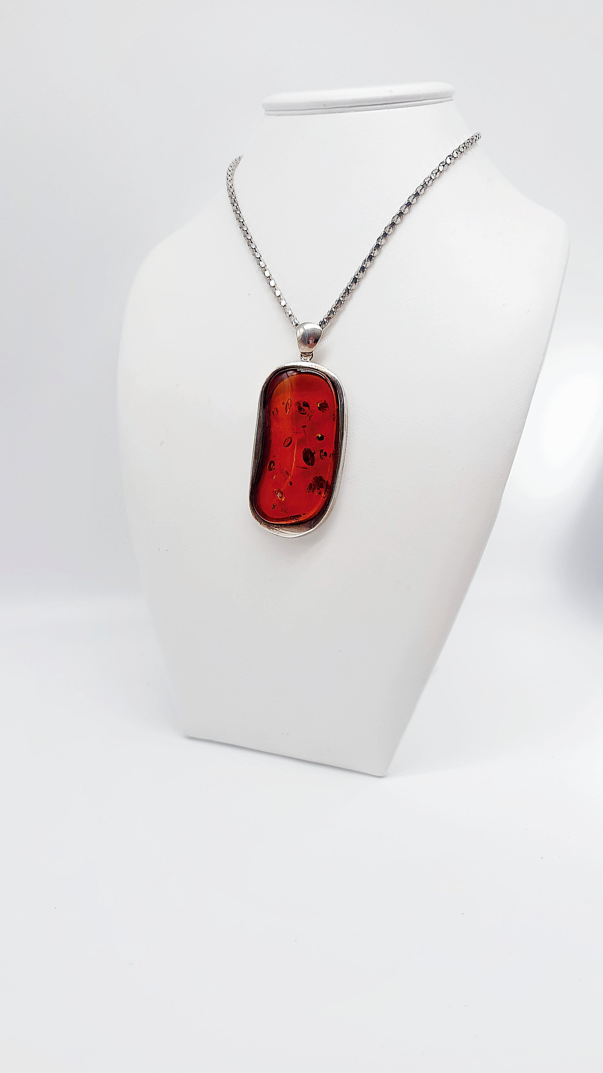 This captivating amber pendant shines in an intense red and is set in a precious silver frame. The pendant combines the natural beauty of amber with the elegance of a simple setting. Each stone is unique and showcases the unique structures and inclusions of the amber. A perfect accessory for special occasions or to add a luxurious touch to any outfit.