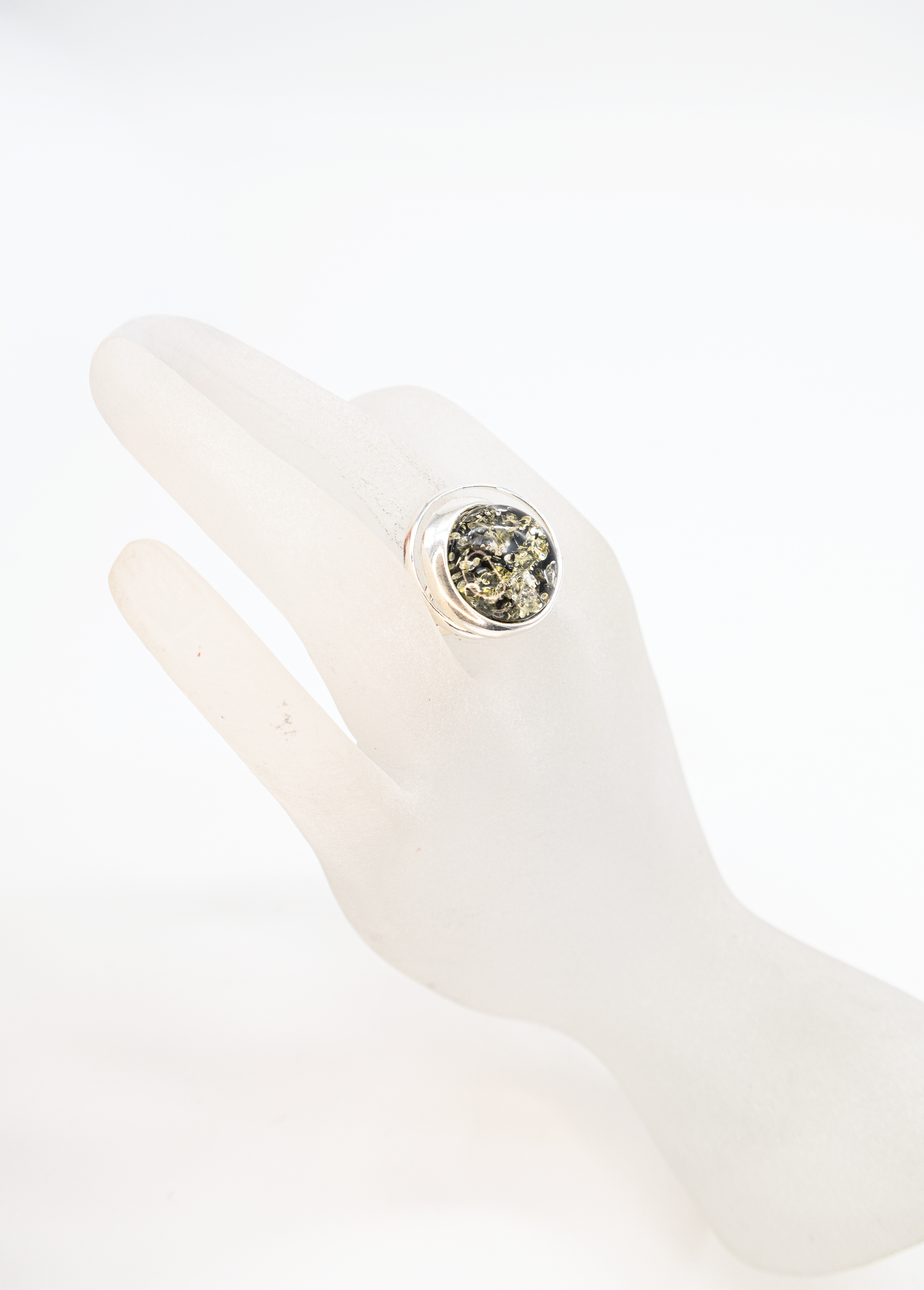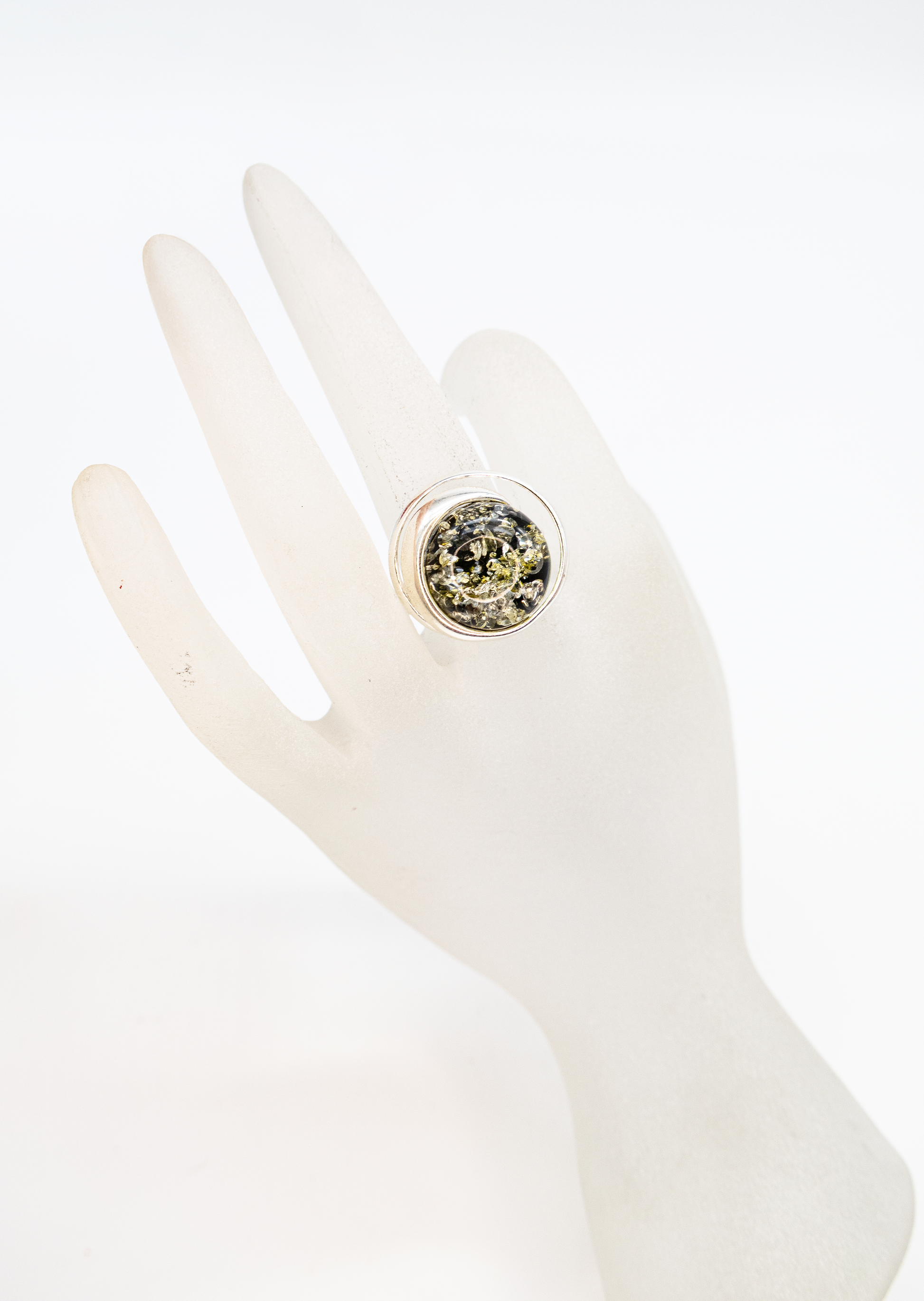 Handmade silver ring with round green amber – each piece is unique.