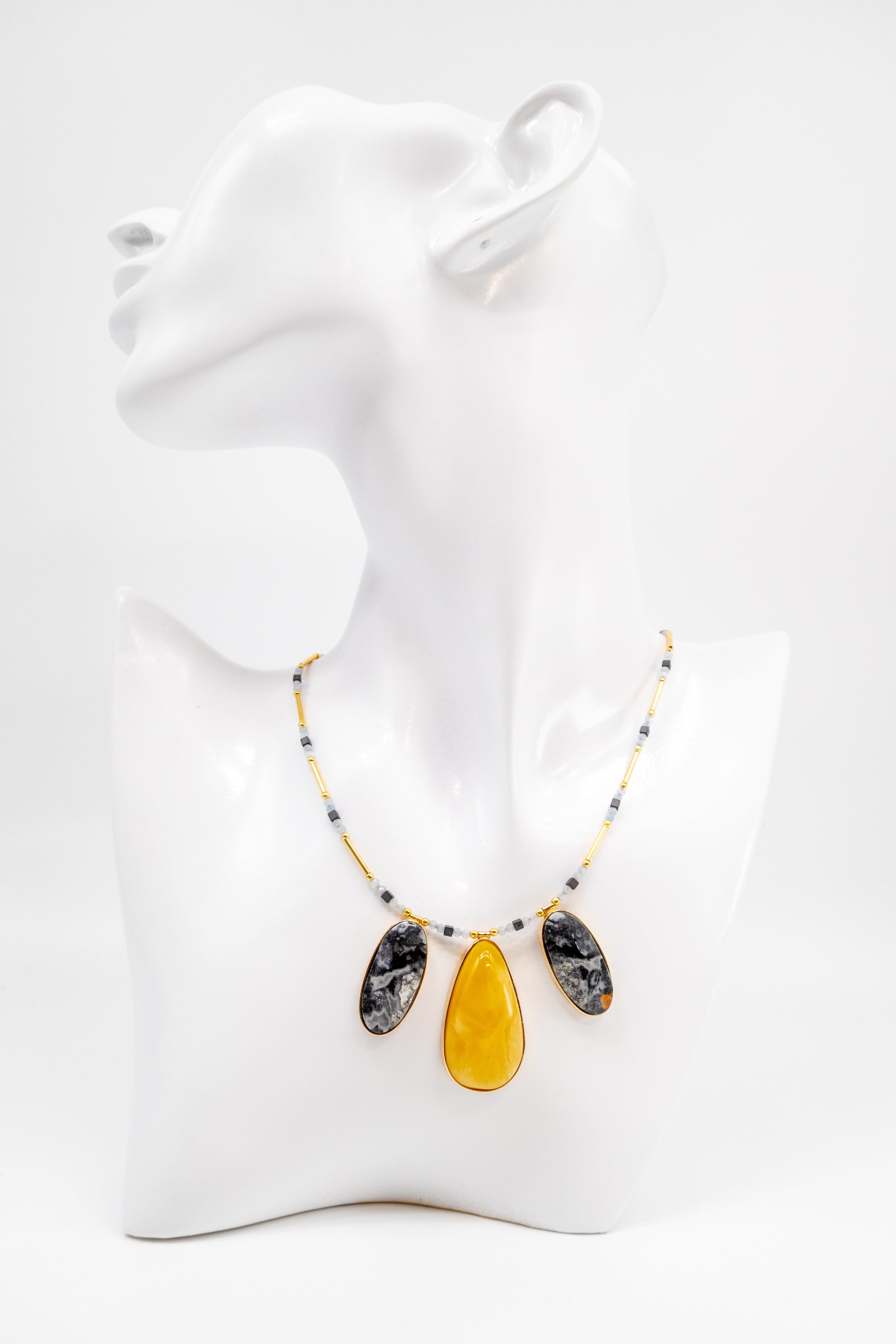 This gold-plated necklace made of 925 silver is truly unique. Its focal point is a rare, honey-colored amber, flanked by precious jasper stones. Small hematite and aquamarine beads shimmer between the gold-plated elements, giving the necklace a particularly elegant appearance. With a length of approximately 44 cm plus a 5 cm extension, it perfectly complements any outfit. A unique gift for a wife, sister, or girlfriend—a truly one-of-a-kind piece that will delight.