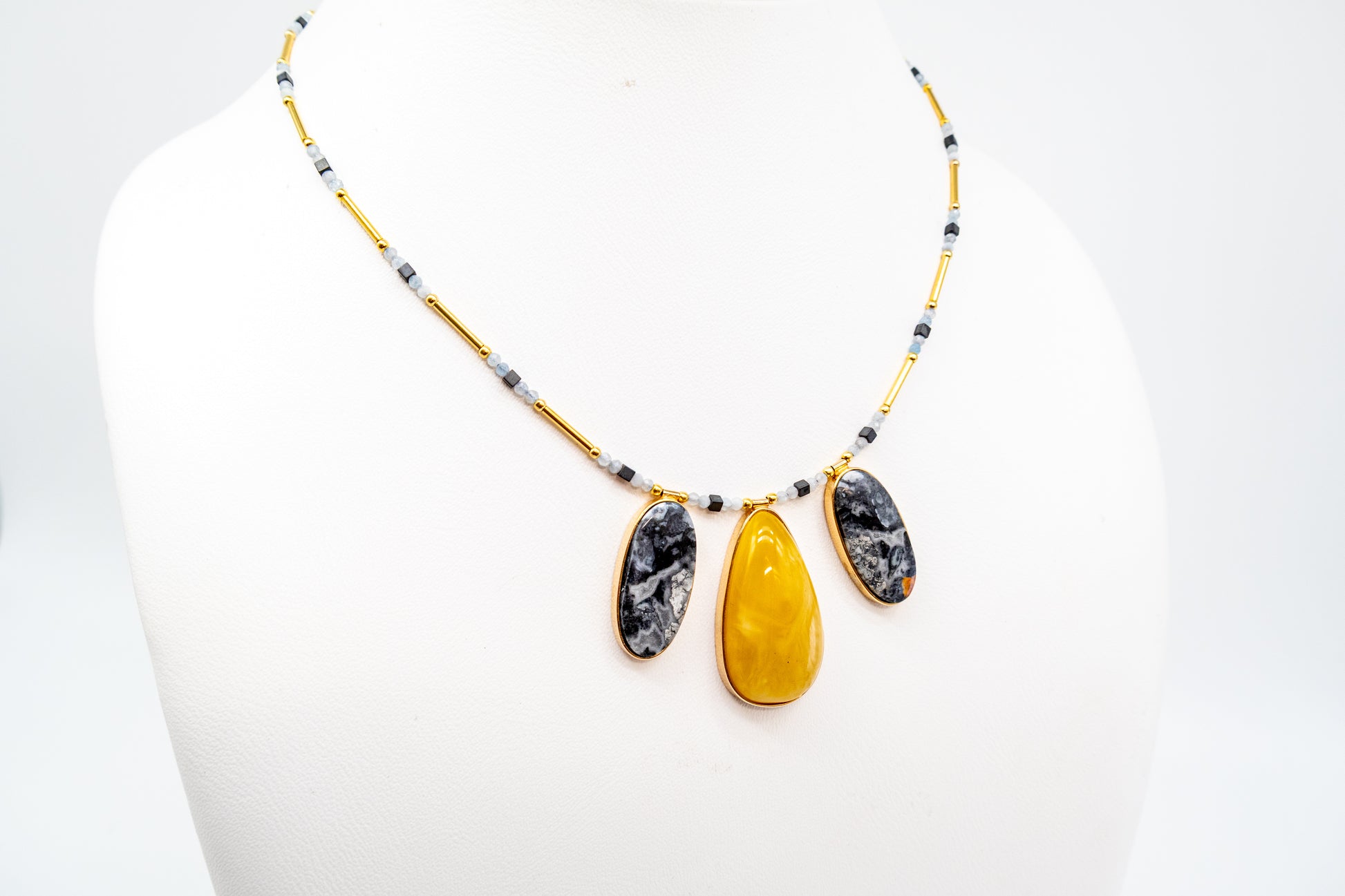 Gold-plated 24 K 925 sterling silver with amber, jasper, hematite and aquamarine