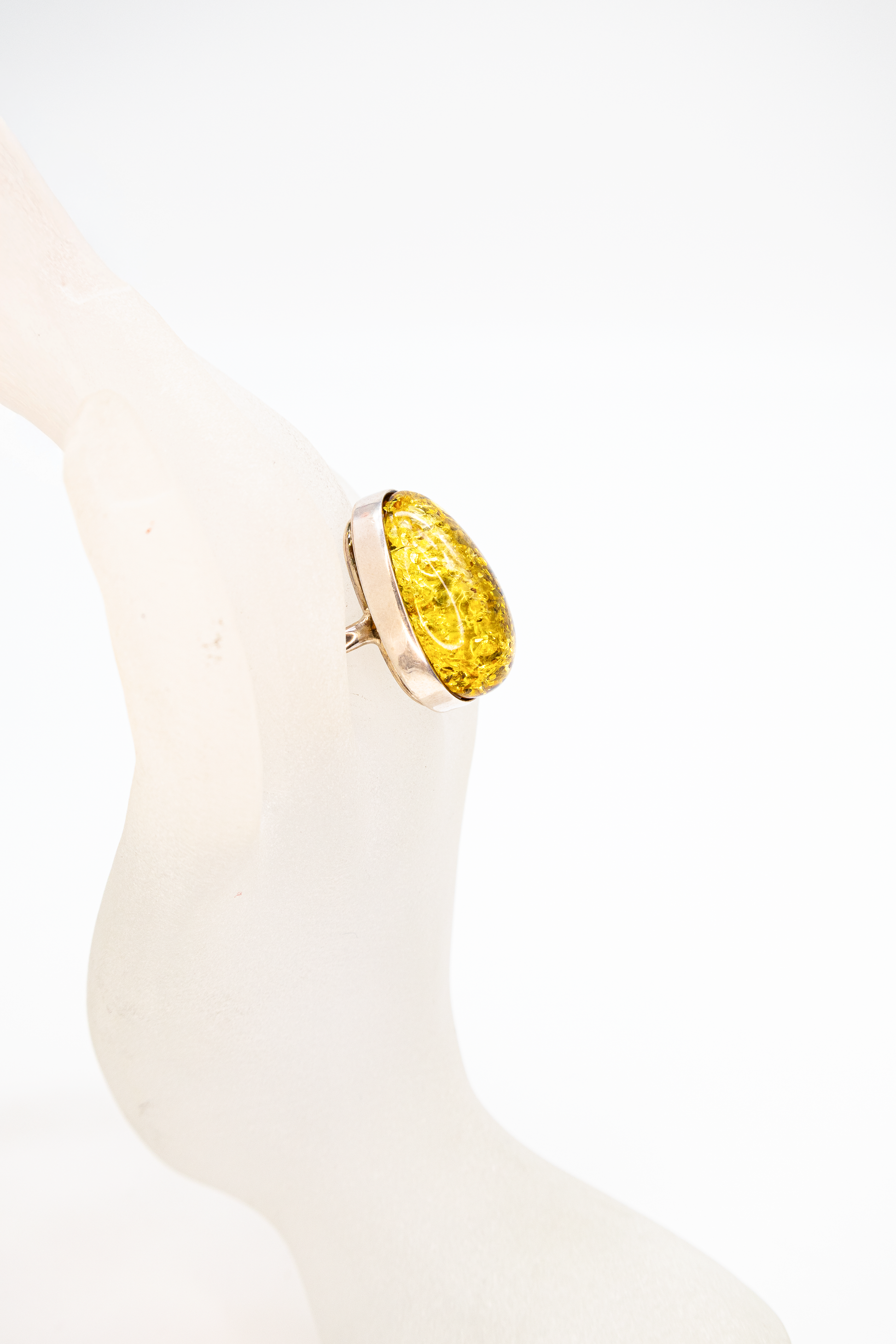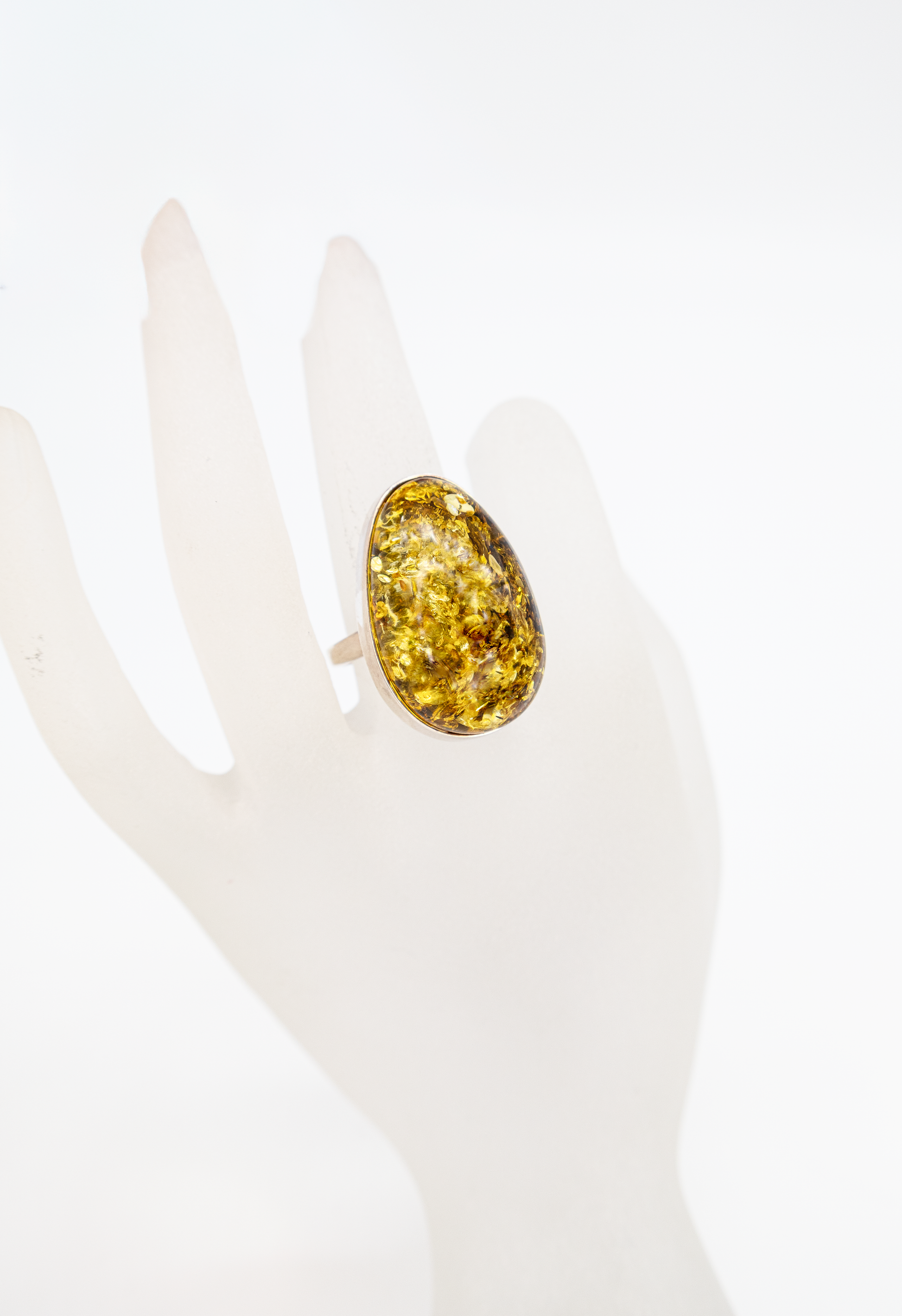 This exclusive silver ring with genuine amber is an artfully crafted, unique piece. The large, oval-cut amber displays a fascinating grain in golden yellow to olive green tones, and its natural inclusions create a particularly vibrant effect. Measuring approximately 2.7 × 1.7 × 1.2 cm, the ring draws all eyes and impresses with its unique charisma. The high-quality silver setting emphasizes the character of the stone and creates a stylish overall look. Thanks to the adjustable ring band, this ring can be worn flexibly and adapts perfectly to different finger sizes. Whether as an everyday statement piece or as a special gift for a loved one – this silver ring combines nature, elegance, and craftsmanship.
