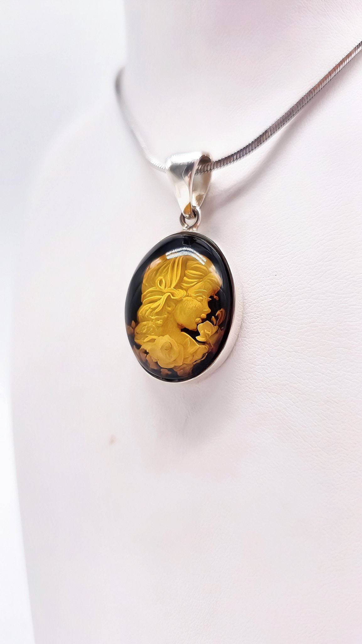 This handcrafted amber pendant is an elegant piece of jewelry that combines sophisticated design with natural beauty. The finely engraved genuine amber is artfully set in a precious 925 sterling silver setting , exuding timeless elegance. Measuring 4 cm long, 2.3 cm wide, and 1 cm high, this pendant is a unique accessory for women who love stylish jewelry. Perfect as a gift for special occasions like birthdays and anniversaries, or as an elegant everyday highlight .