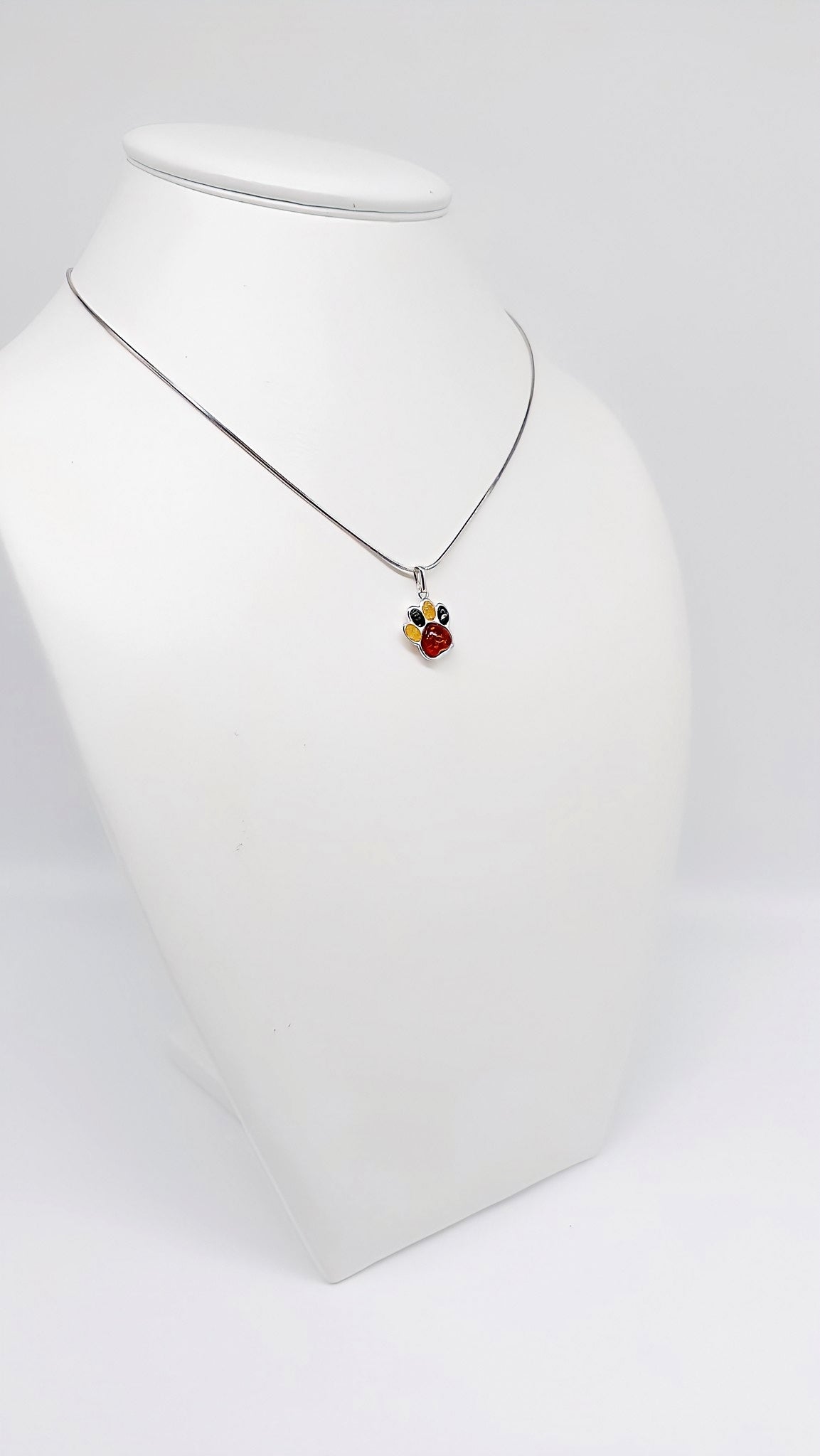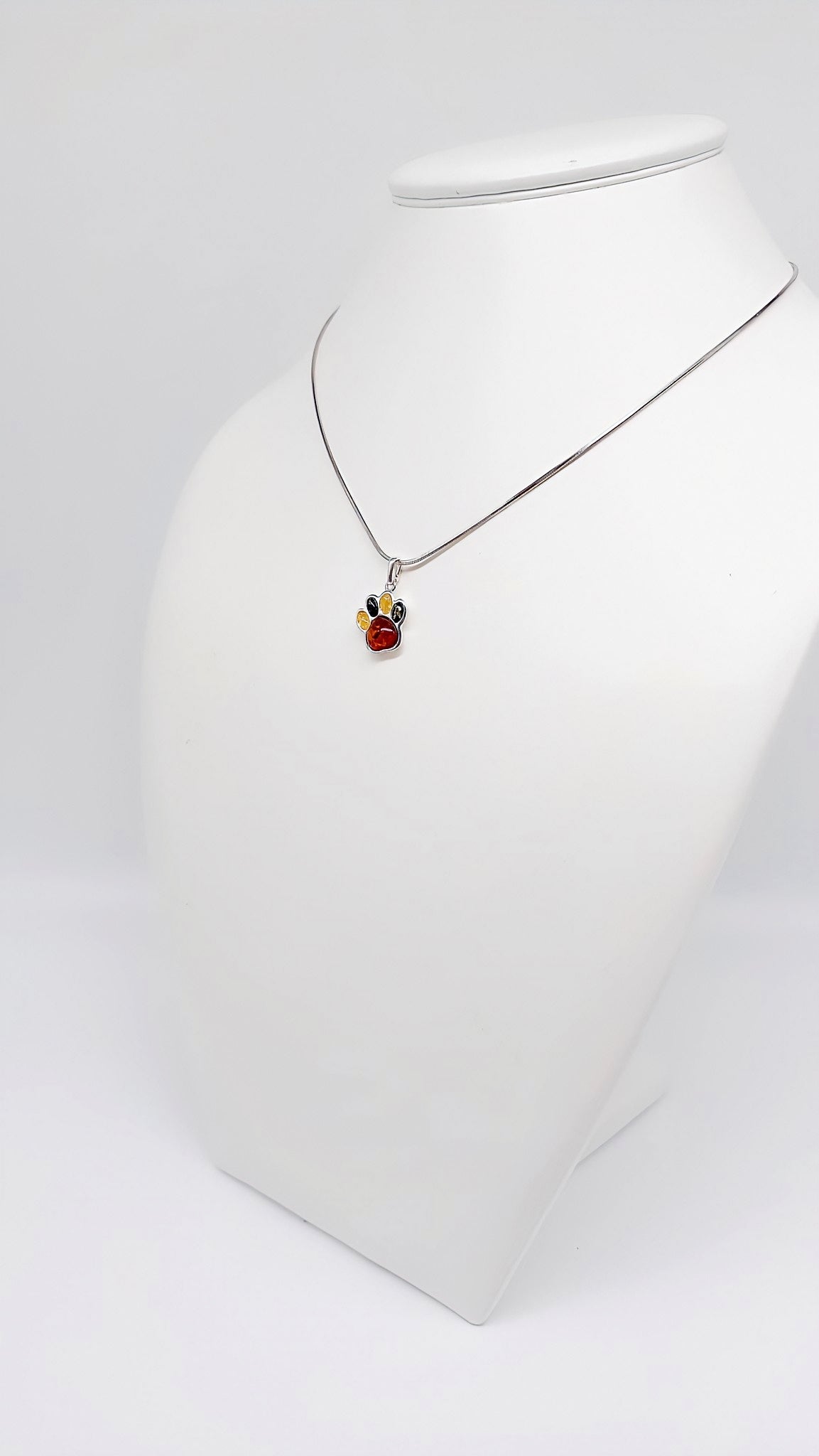 This enchanting paw pendant crafted from high-quality 925 sterling silver is the perfect accessory for animal lovers. The pendant is adorned with several colorful amber stones that shine in vibrant colors, giving the piece a cheerful and vibrant look. The delicate design of the paw lends the pendant a special elegance, making it an ideal accessory for any occasion. This pendant is not only a stylish piece of jewelry but also a symbolic gift for animal lovers. Wear this carefully crafted piece and show your love for animals with style.