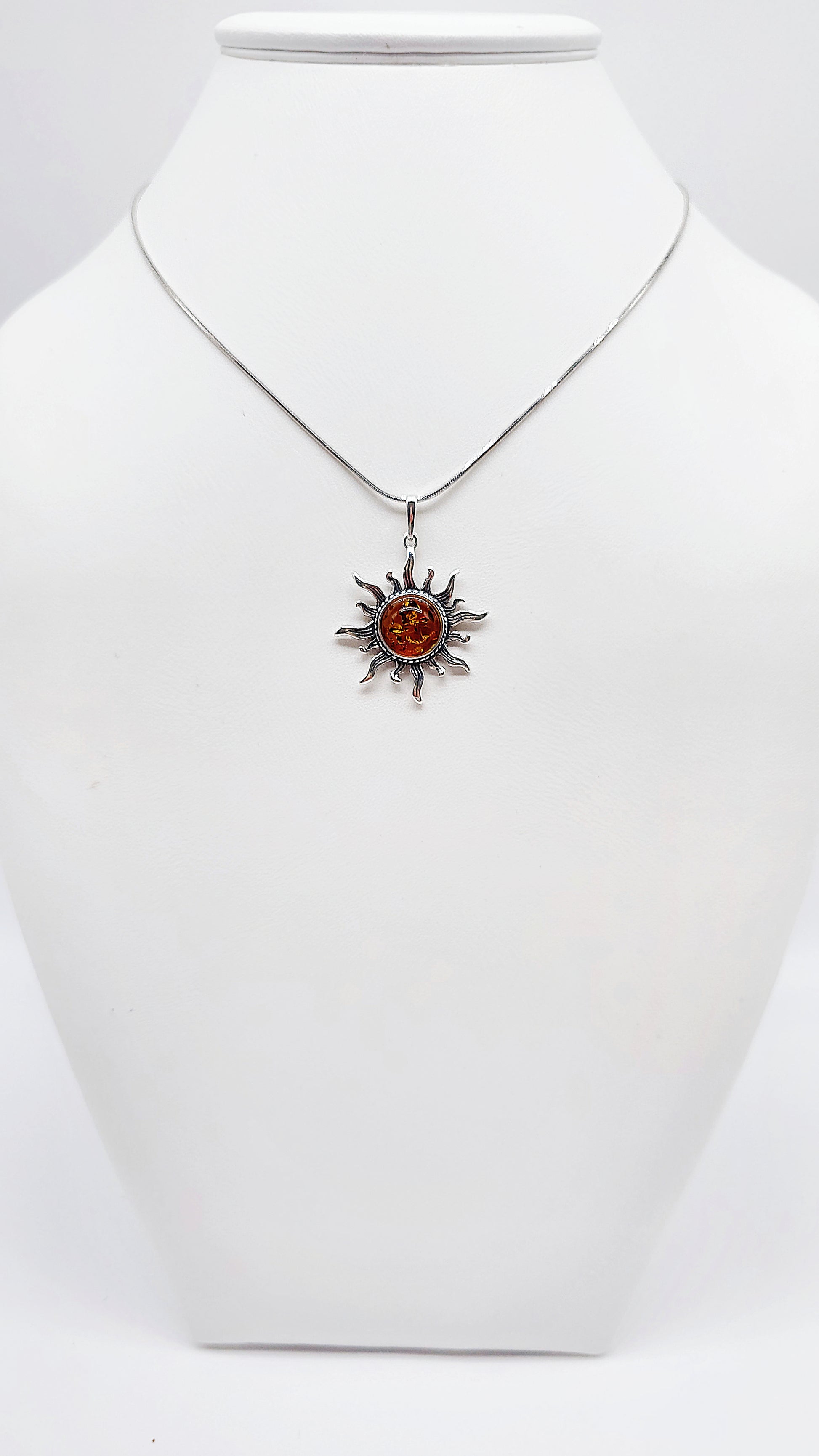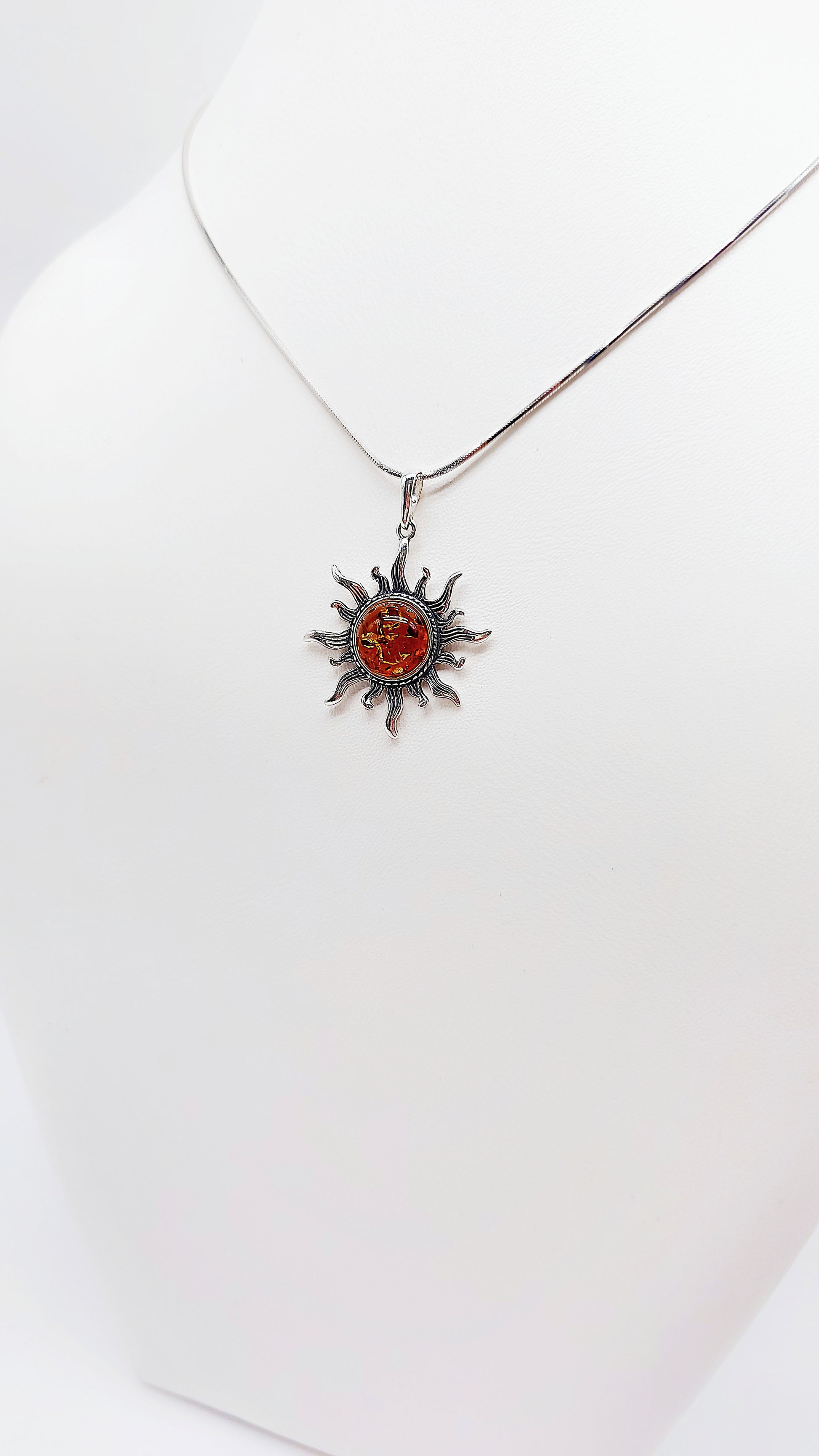 This unique sun pendant, crafted from high-quality 925 sterling silver, features a luminous amber stone at its center. The radiant silver sunbeams frame the warm amber, giving the piece a vibrant and powerful radiance. The striking design makes this pendant a truly unique piece, perfect for everyday wear and special occasions. It's ideal as a radiant accessory or as a special gift for someone dear to you.