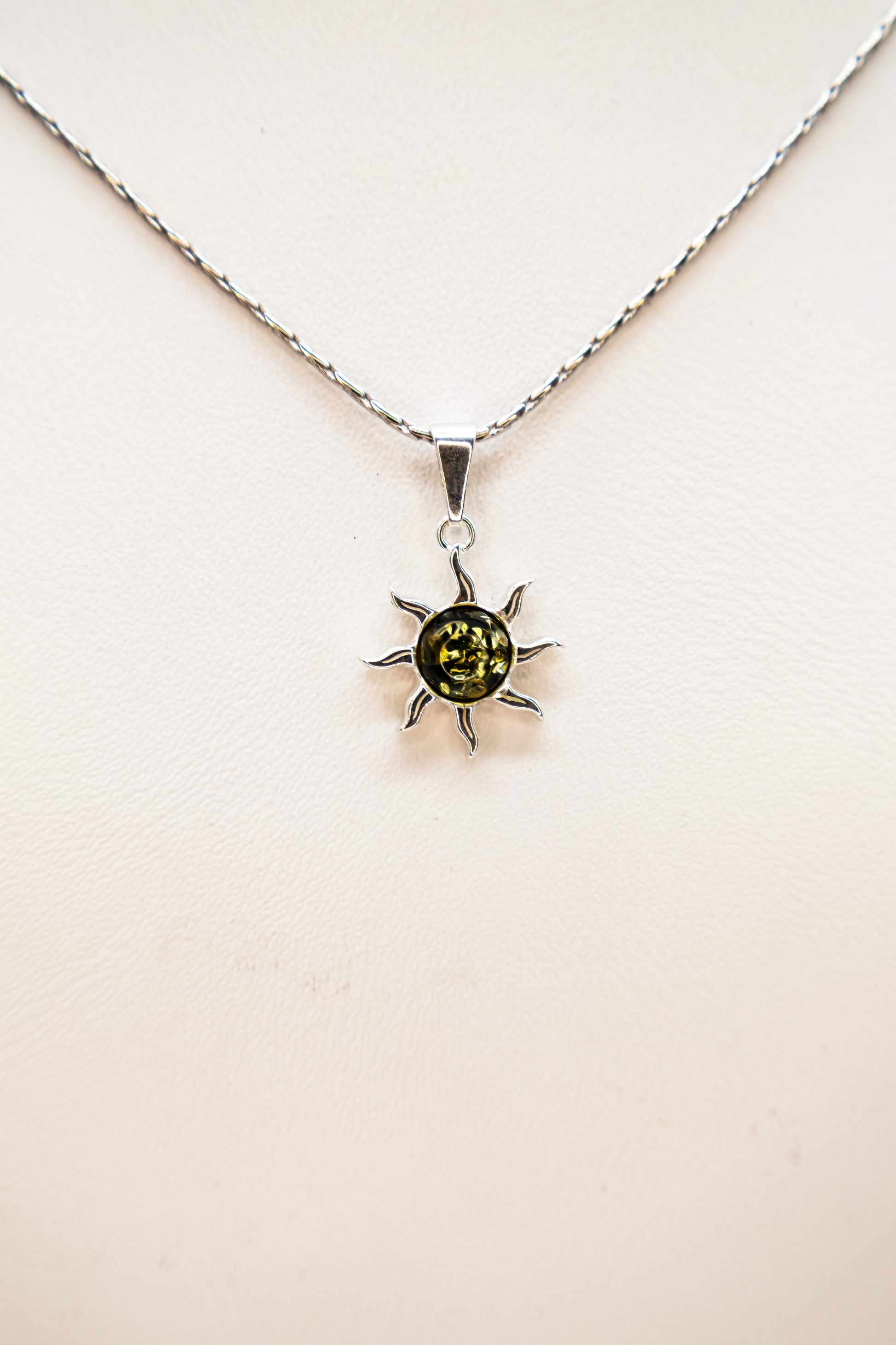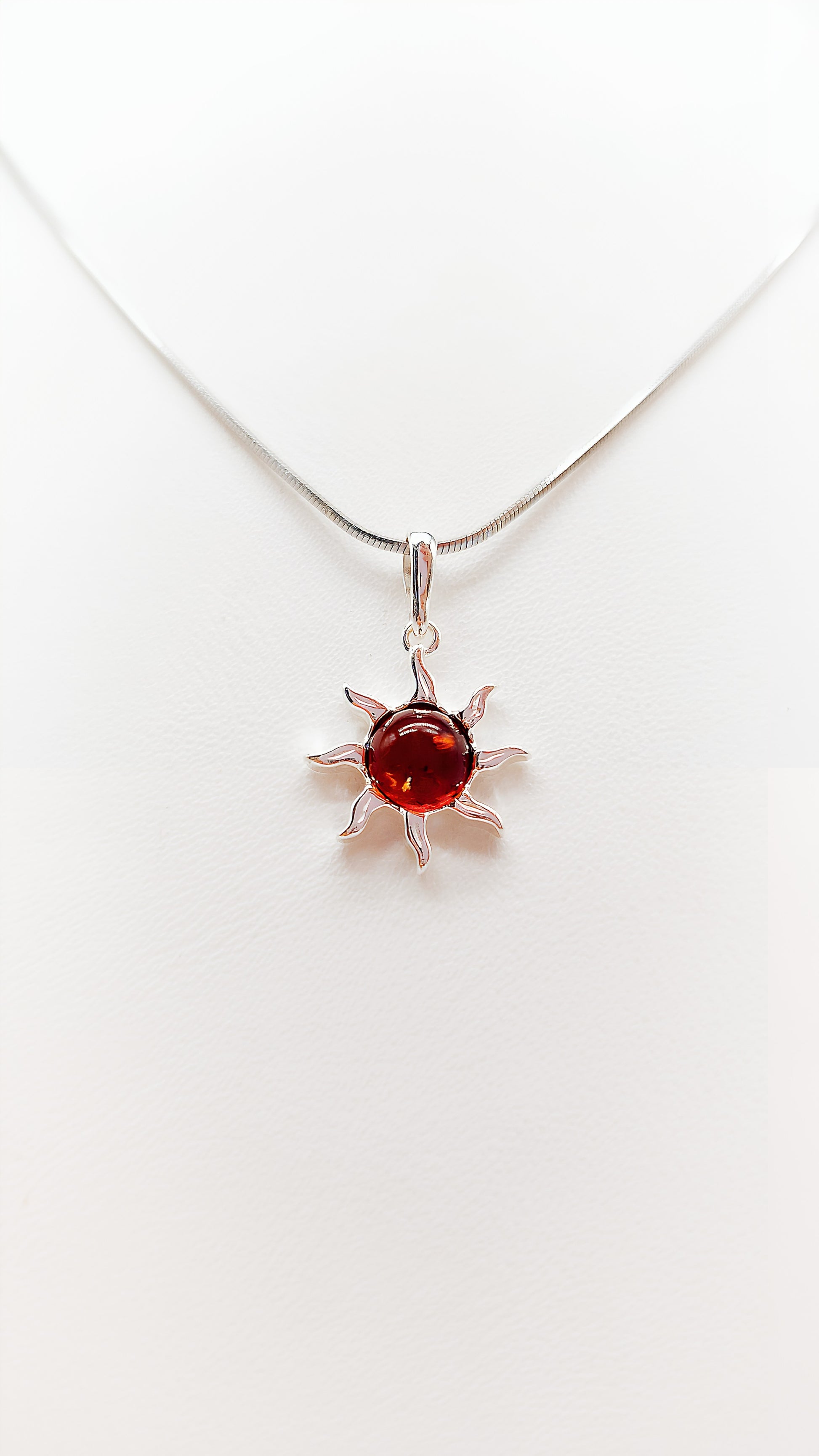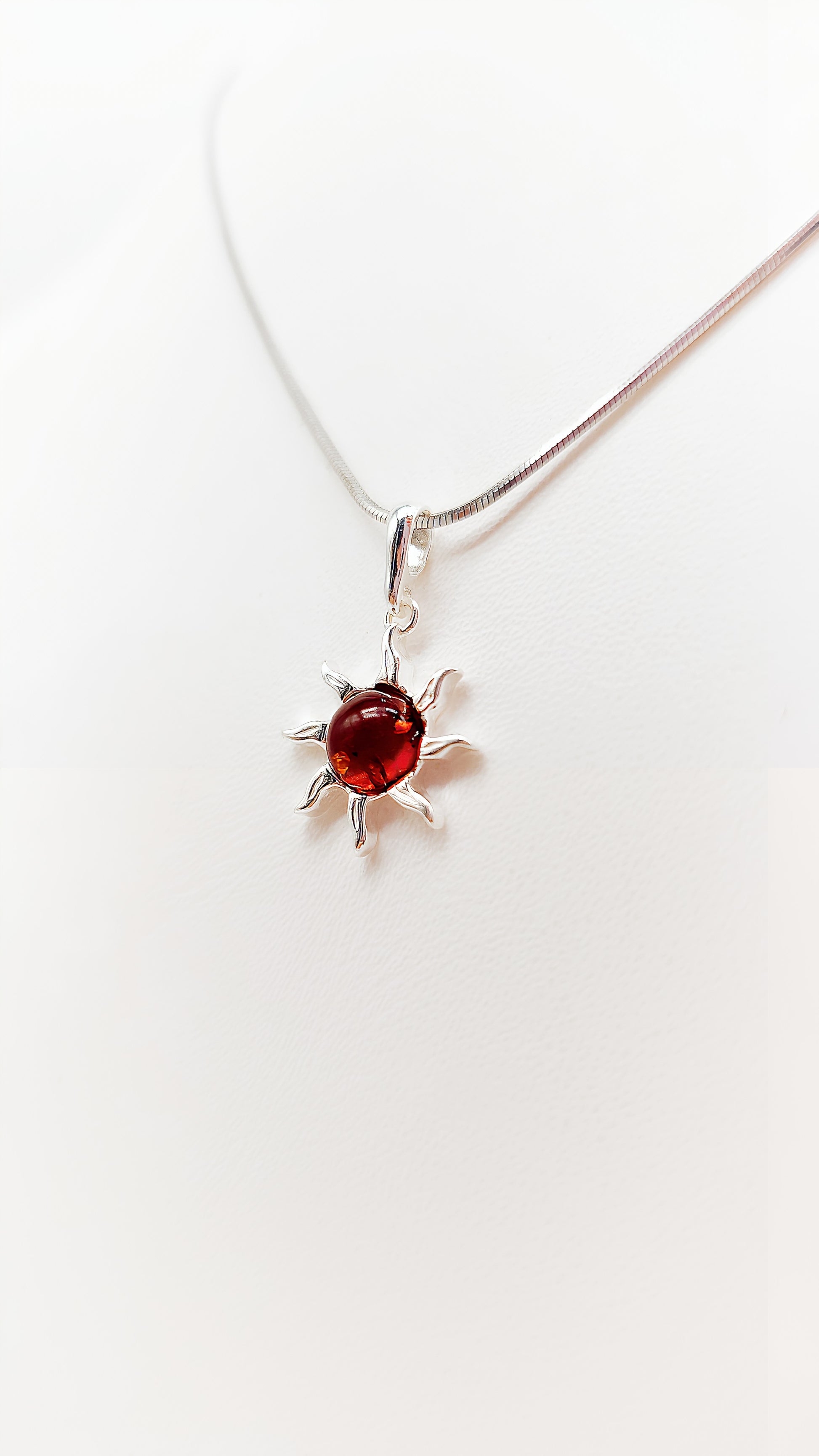 This beautiful pendant crafted from 925 sterling silver brings the radiant power of the sun directly into your jewelry box. The amber set in the center shines a warm, intense red and is framed by stylized silver sunbeams. This piece of jewelry combines the natural beauty of amber with a striking silver frame, adding a special, sunny touch to any outfit. Perfect for anyone who wants to retain a touch of summer all year round.