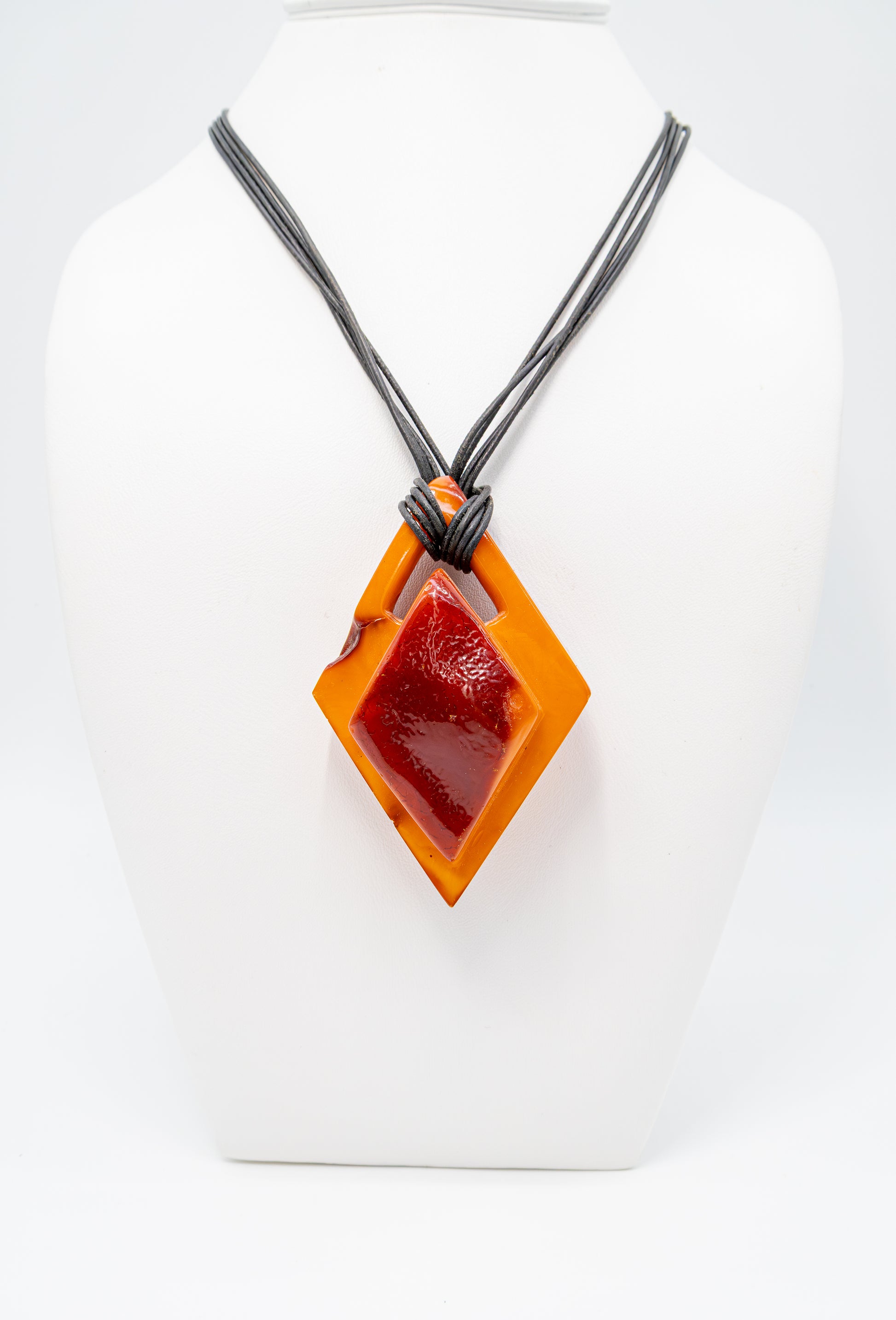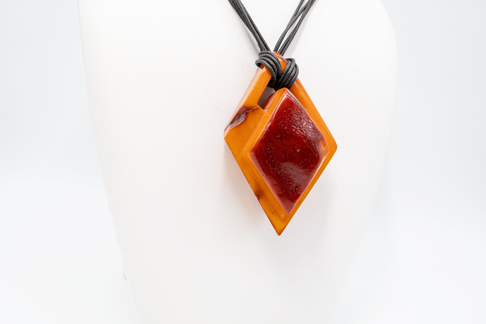 This extraordinary amber pendant is truly unique and captivates with its modern, geometric shape. The two-tone amber in vibrant red and warm honey yellow makes each piece a distinctive eye-catcher .