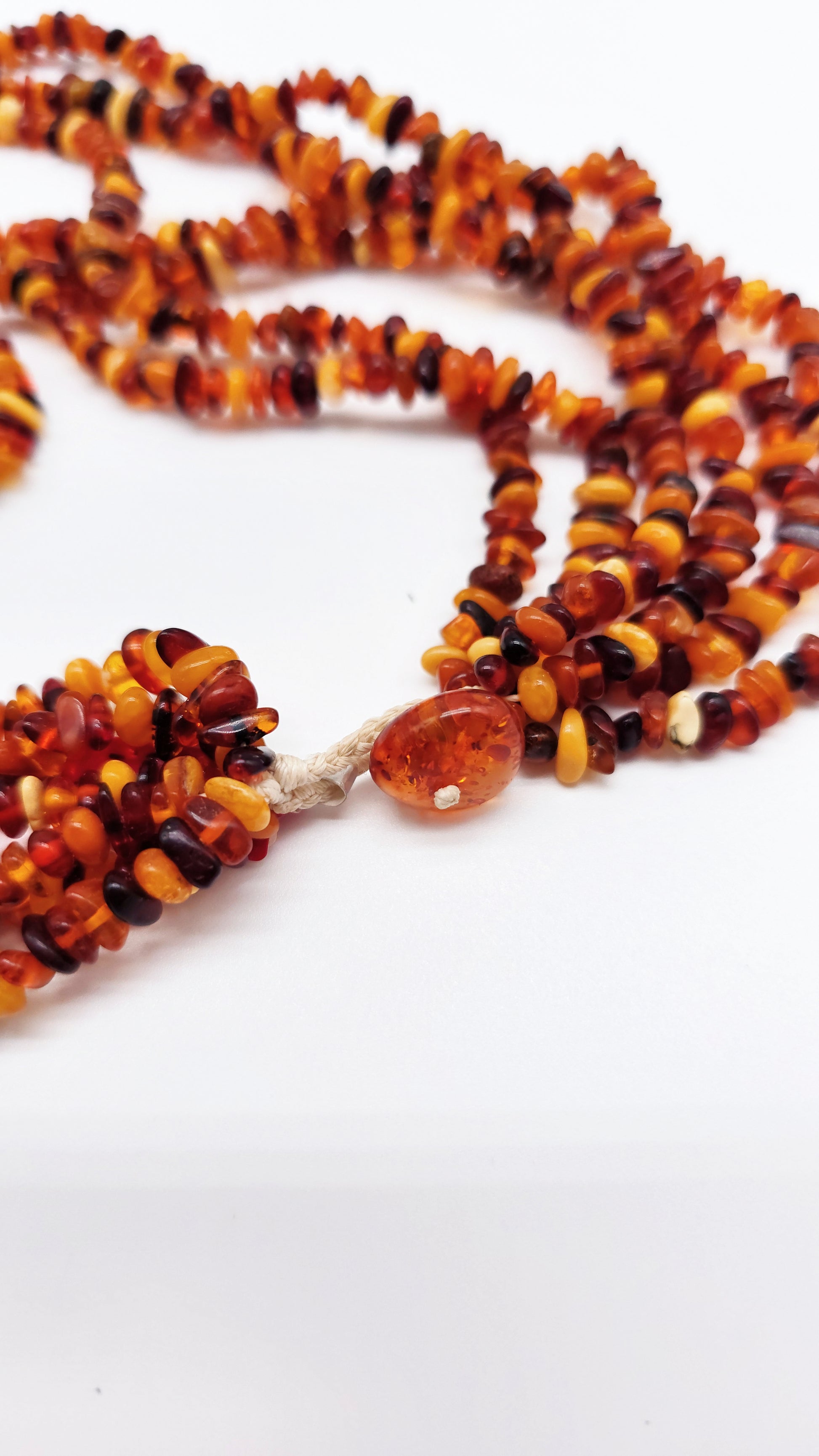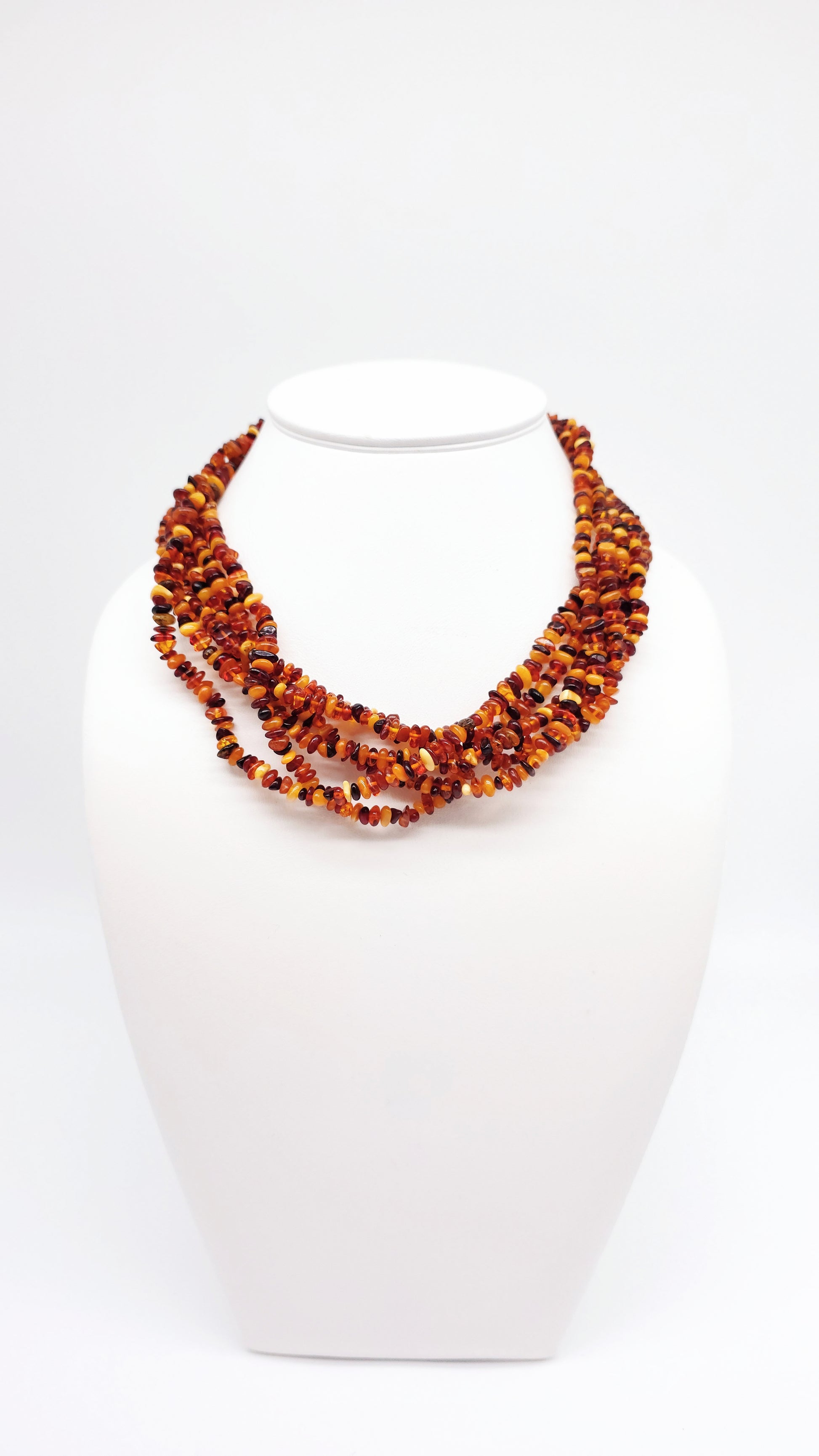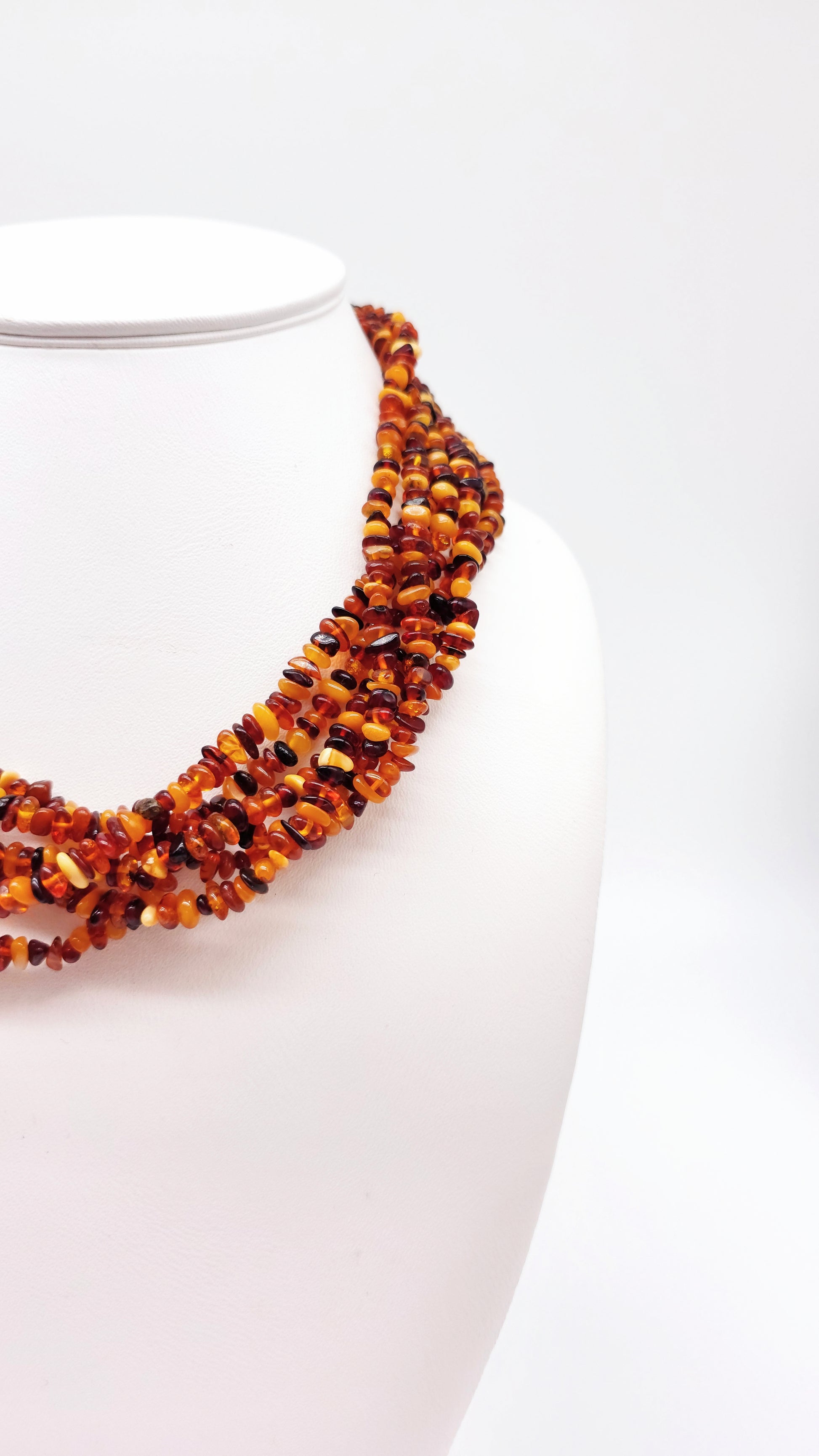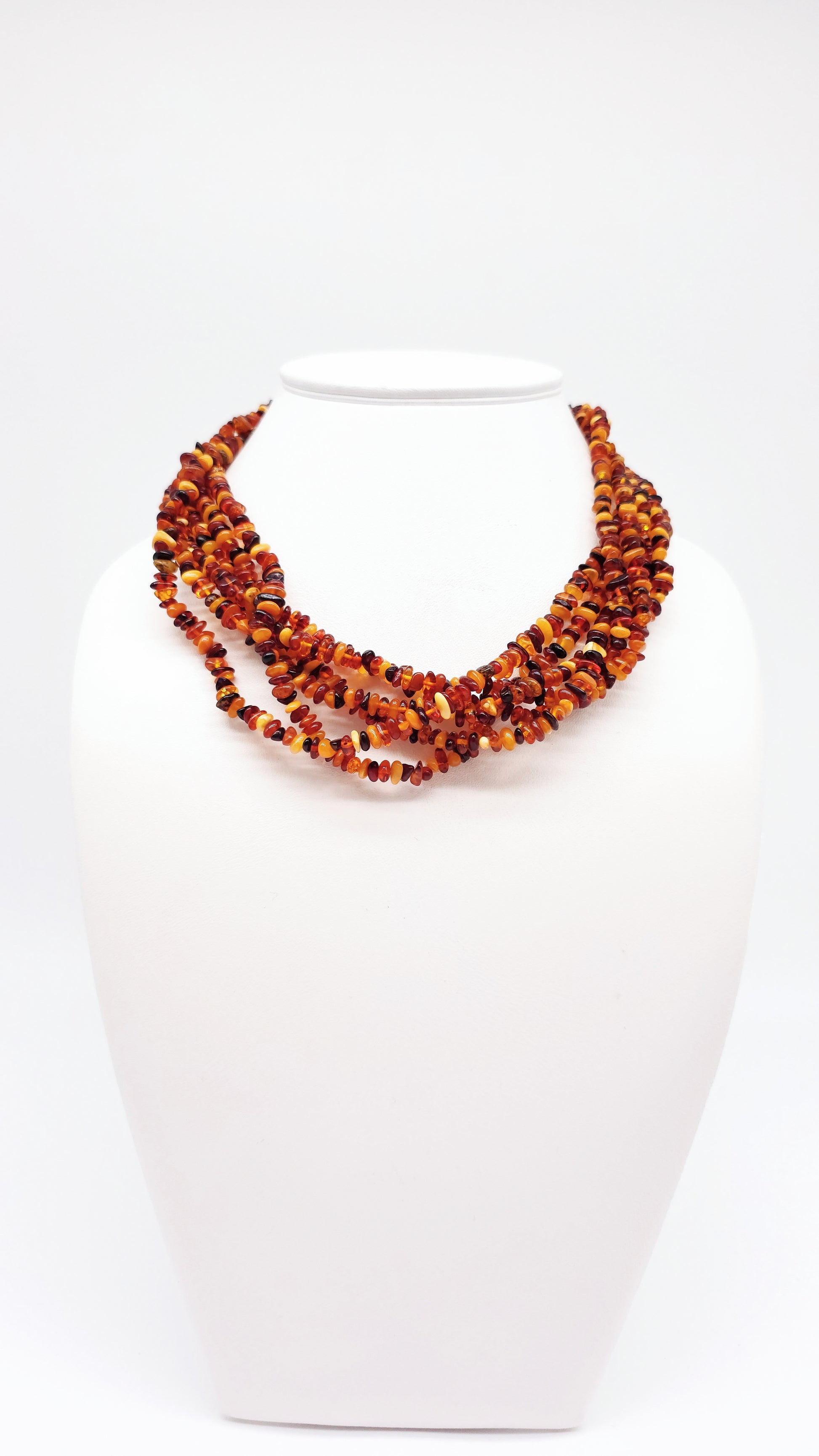 This extraordinary, handcrafted amber necklace is truly one of a kind. It consists of six artfully interwoven strands of genuine natural amber in warm cognac and honey tones. Its opulent yet harmonious design makes it a statement piece that enhances any outfit.