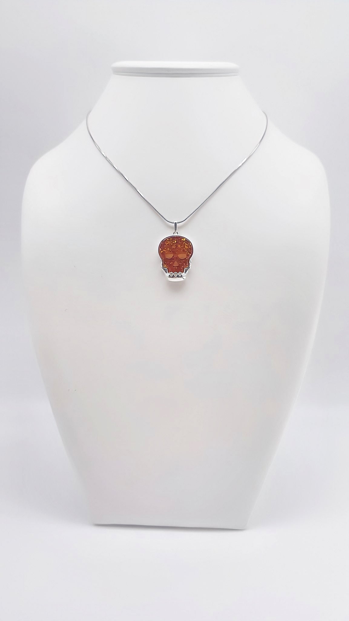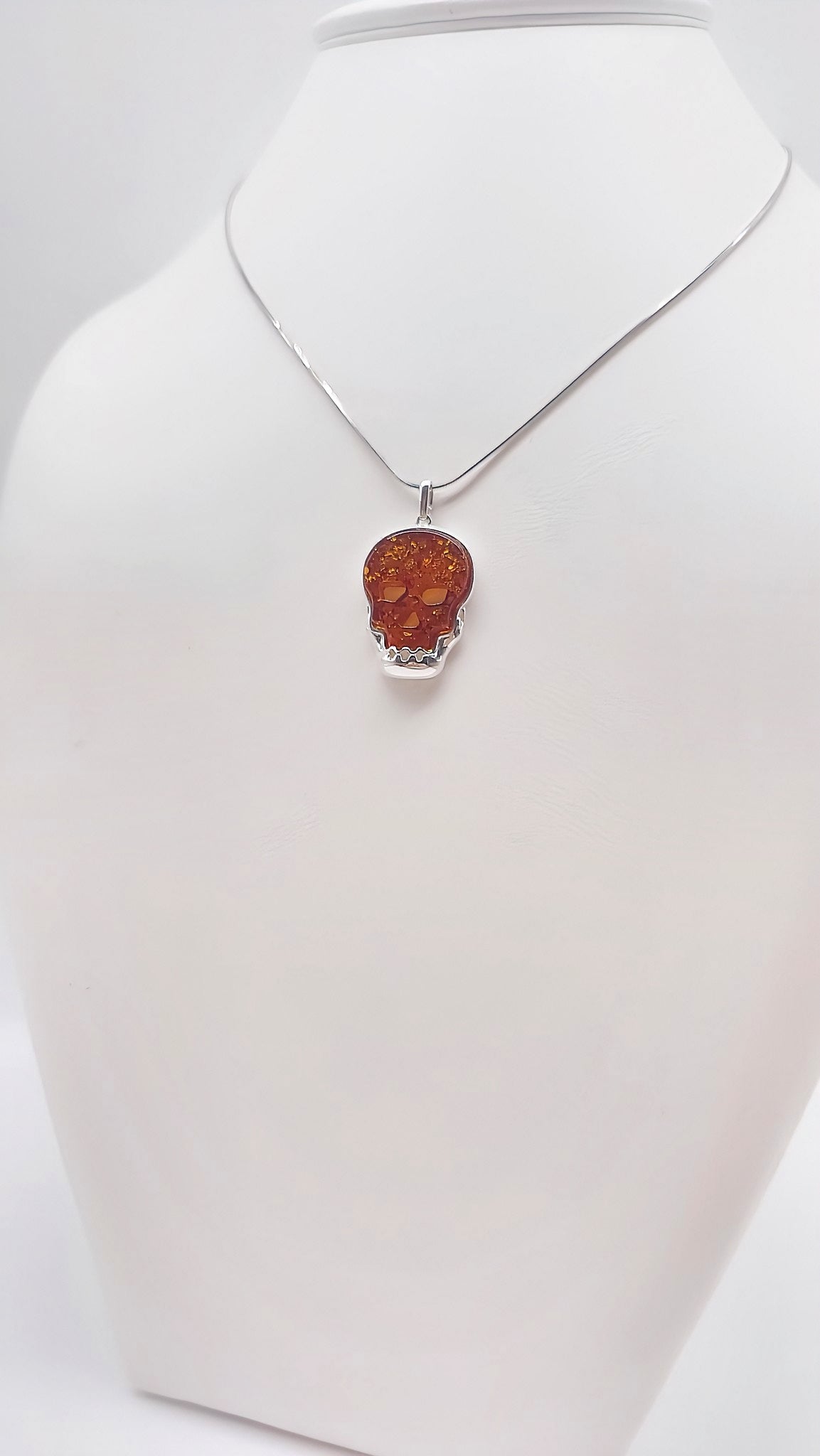 This striking pendant, crafted from 925 sterling silver and amber, captivates with its unique skull design. The deep, warm tones of the amber lend the skull a mystical aura, while the lustrous silver adds elegance. A piece of jewelry that is both bold and stylish, perfect for those who want to express their individual style. Ideal as a gift or as a statement piece for your own jewelry box.