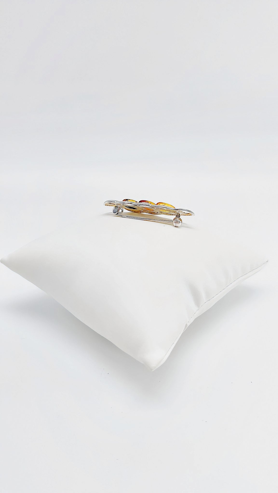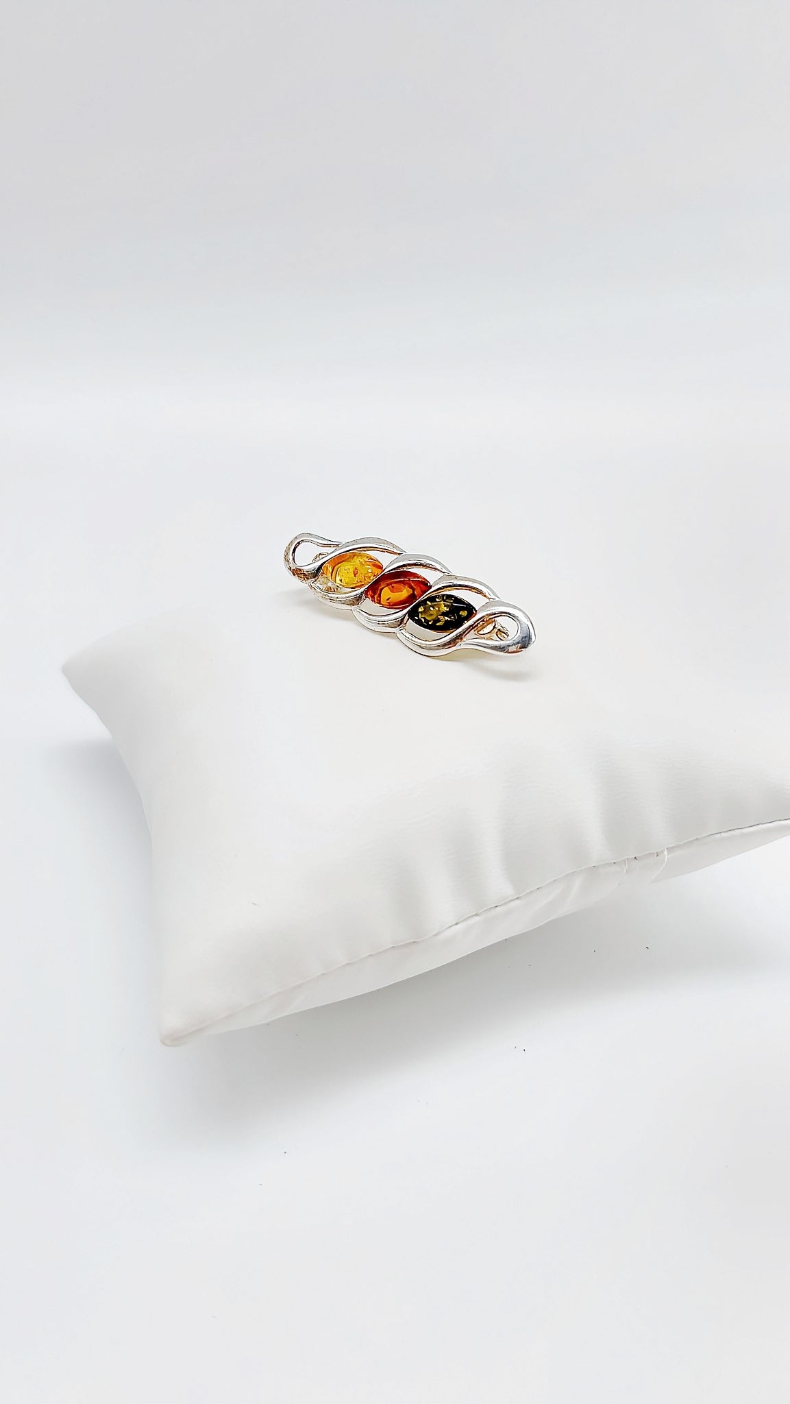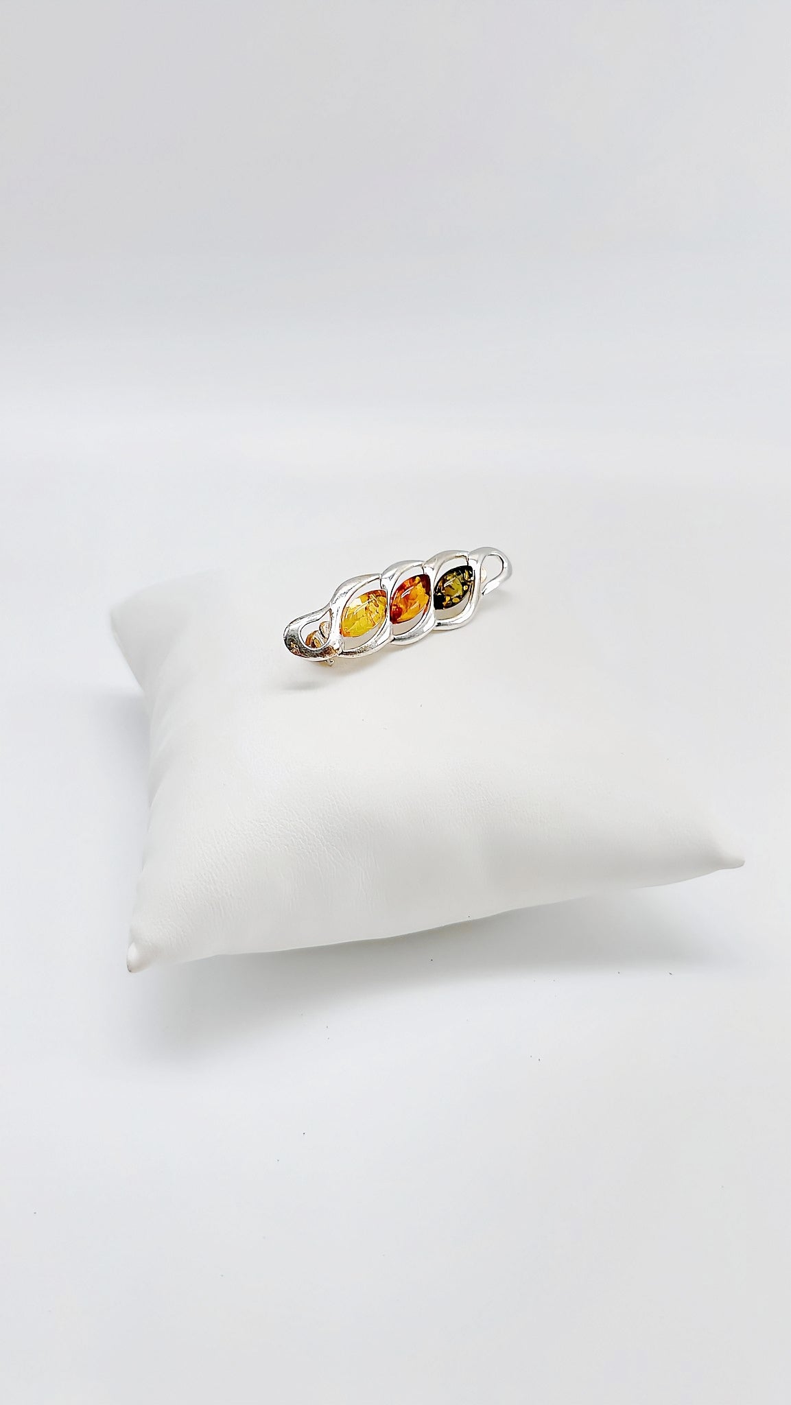 This stylish brooch combines the warm depth of amber with the cool elegance of silver. Three differently colored amber stones are artfully embedded in a curved silver setting, harmoniously complementing the design. This brooch is a standout accessory that adds a sophisticated and natural touch to any outfit. Lightweight and comfortable to wear, it's perfect for special occasions or as an elegant everyday accent.