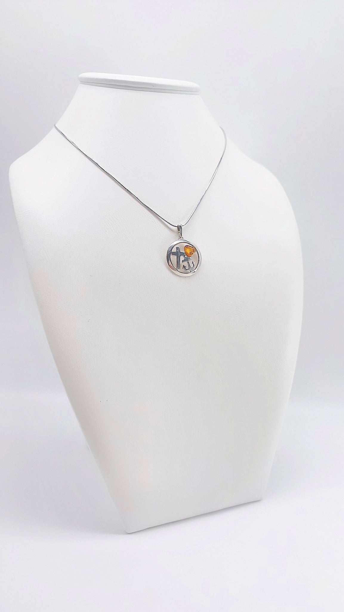 This meaningful pendant made of 925 sterling silver and amber combines the symbols of a cross, anchor, and heart. These symbols represent faith, hope, and love, making the pendant an expressive piece of jewelry. The warm amber contrasts beautifully with the lustrous silver, lending the pendant a special depth. Ideal as a gift for a loved one or as a personal symbol of faith.