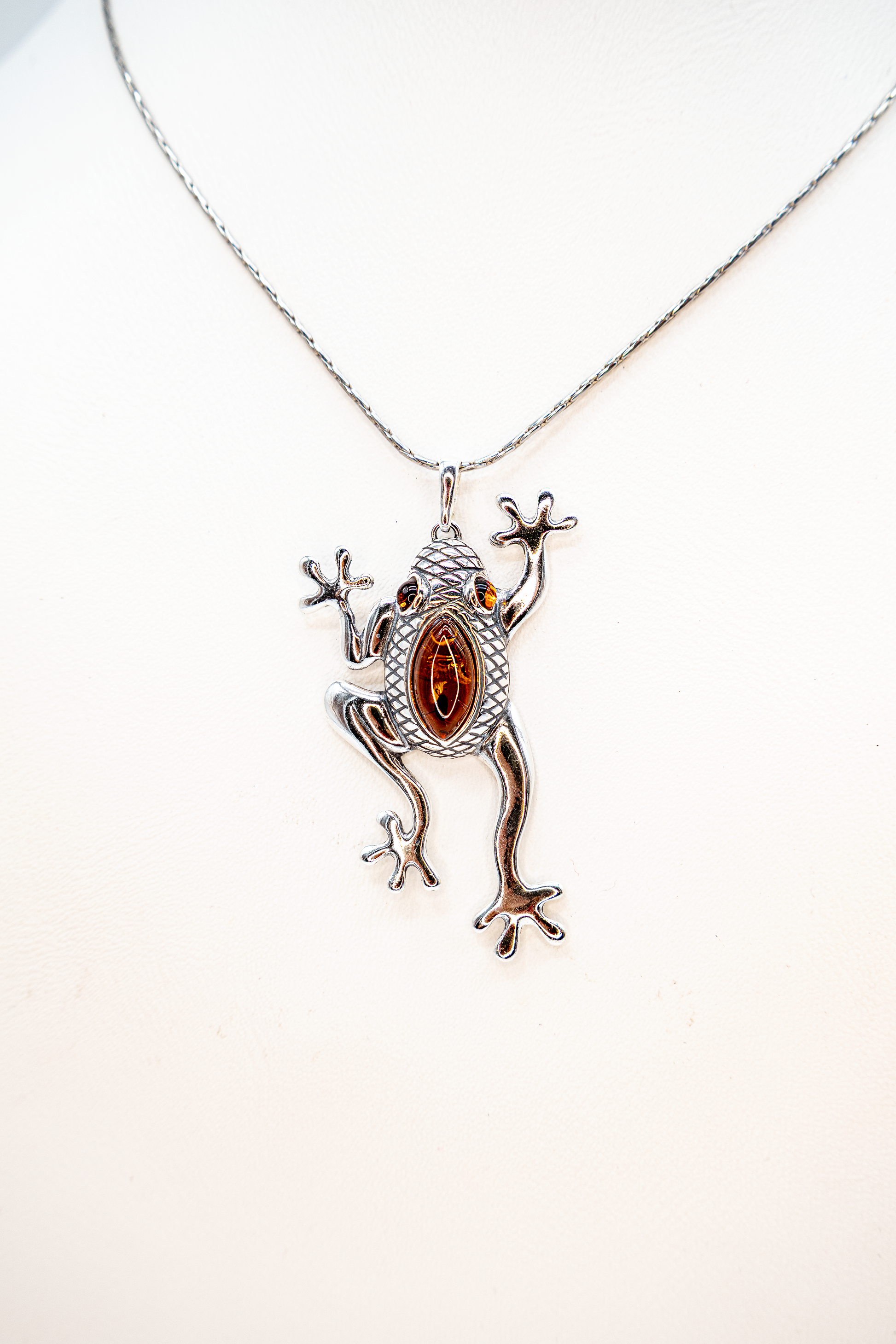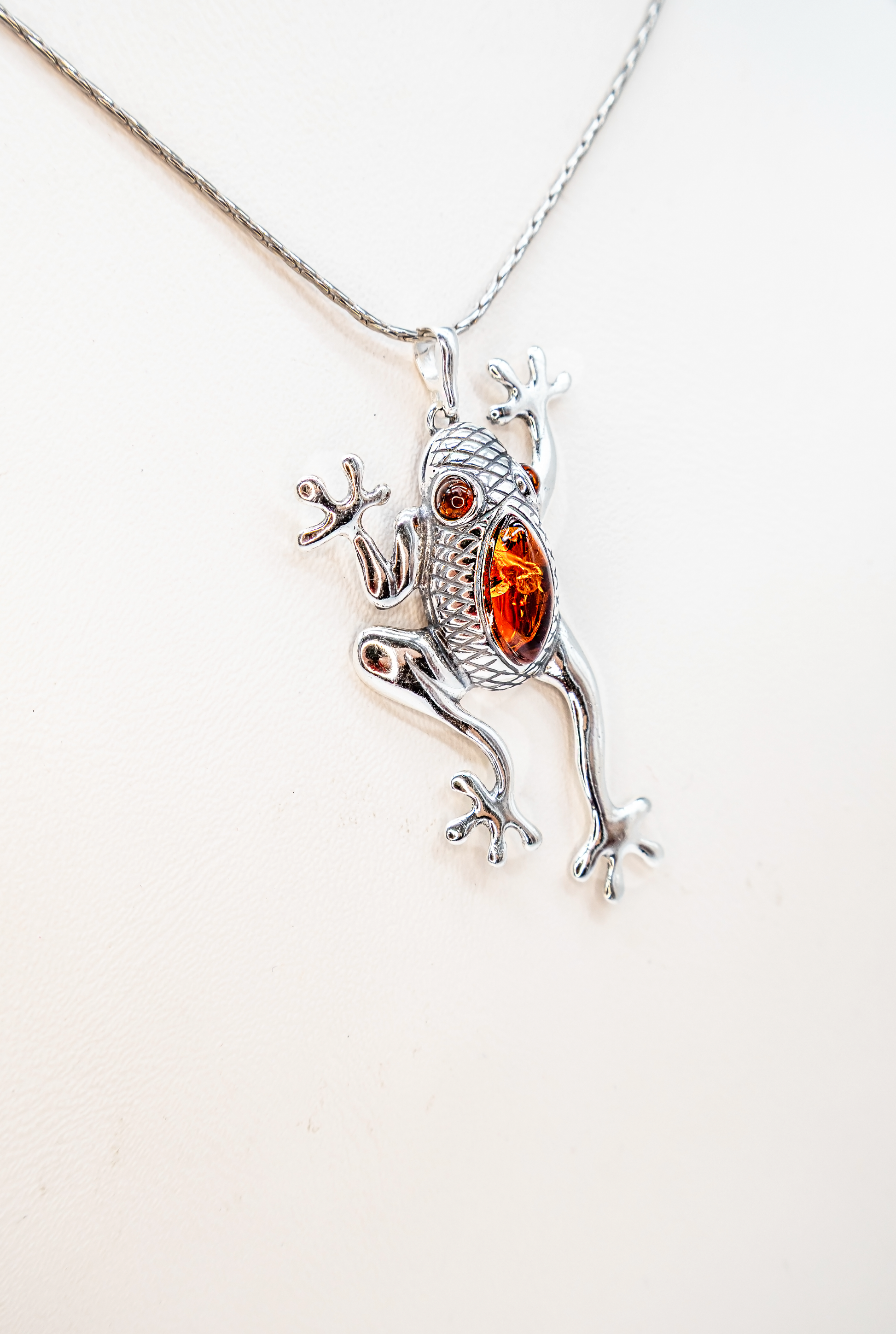 Unique silver frog-shaped pendant with bright amber – a strong symbol of happiness and vitality