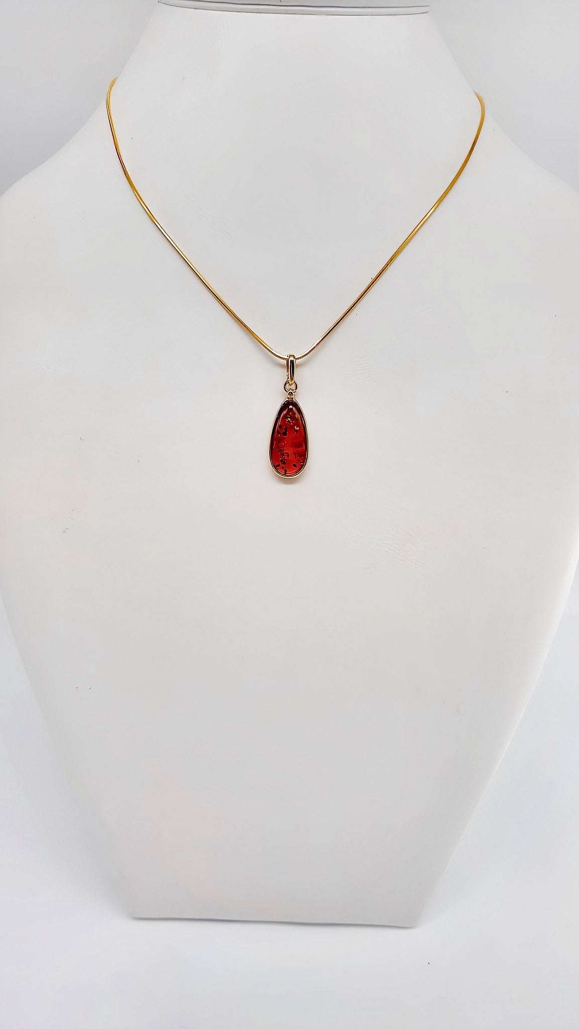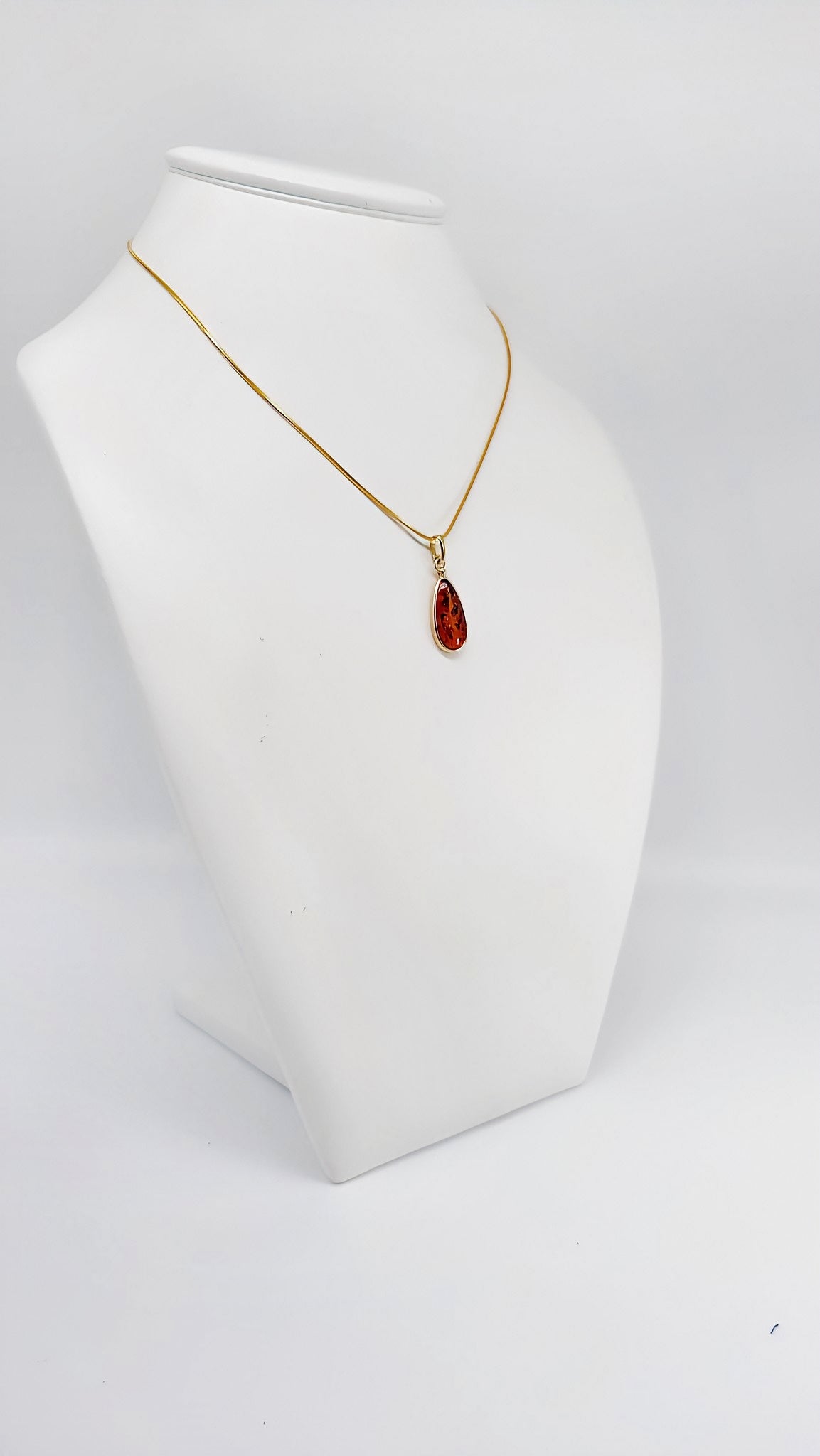 This elegant, drop-shaped pendant combines the natural beauty of amber with a sophisticated, gold-plated setting. The warm, luminous glow of the amber is perfectly enhanced by the gold frame, giving the piece an elegant and timeless touch. Wear this pendant as a symbol of purity and grace. The pendant is versatile and makes a perfect gift for special occasions or as an everyday companion.
