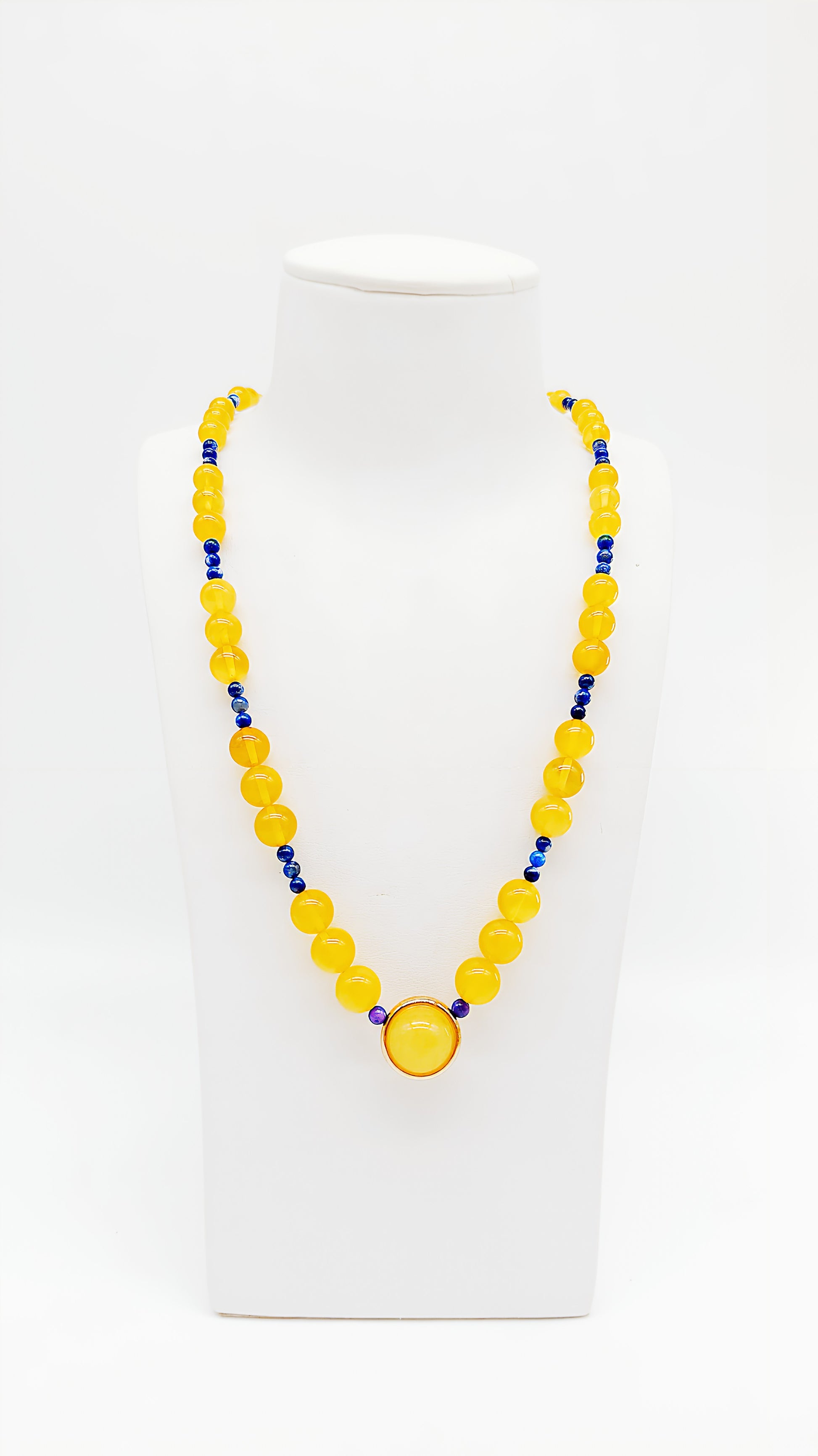 This beautiful, unique necklace combines radiant yellow amber with precious, deep blue lapis lazuli. The contrasting beads create a harmonious interplay between the warm, sunny amber tones and the cool, intense blue nuances of the lapis lazuli. The design is rounded off by a large, central amber pendant, which gives the piece a special radiance. This necklace is not only an expression of elegance, but also a symbol of individuality – each piece is a unique, handcrafted piece that embodies the beauty of nature.
