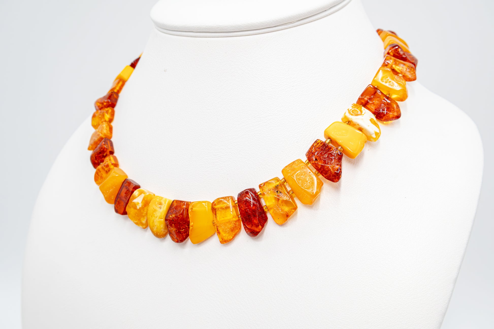 This handcrafted necklace made of genuine amber captivates with its vibrant color palette—from warm honey yellow to intense cognac. Each stone is unique and lends the necklace its distinctive character. Measuring approximately 44 cm long and 1.5 cm wide, the necklace sits elegantly around the neck and is a stylish eye-catcher, both for everyday wear and special occasions. A refined piece of jewelry that combines natural elegance with expert craftsmanship—the ideal gift for a wife, girlfriend, or sister.