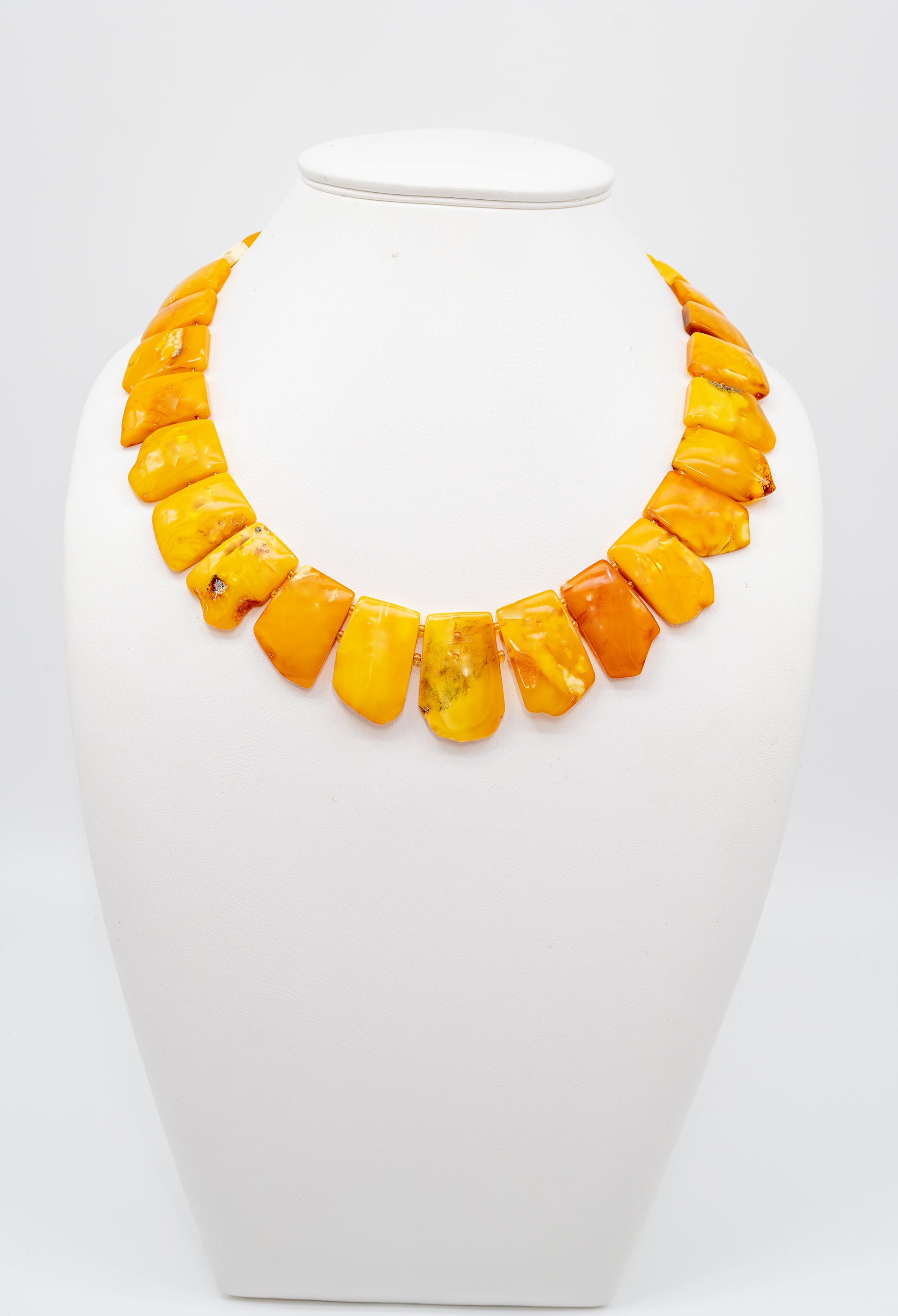 This exclusive amber necklace is truly one-of-a-kind and captivates with its unique yellow hue . The large, naturally formed amber flakes are artfully crafted into a necklace, creating an impressive statement piece .