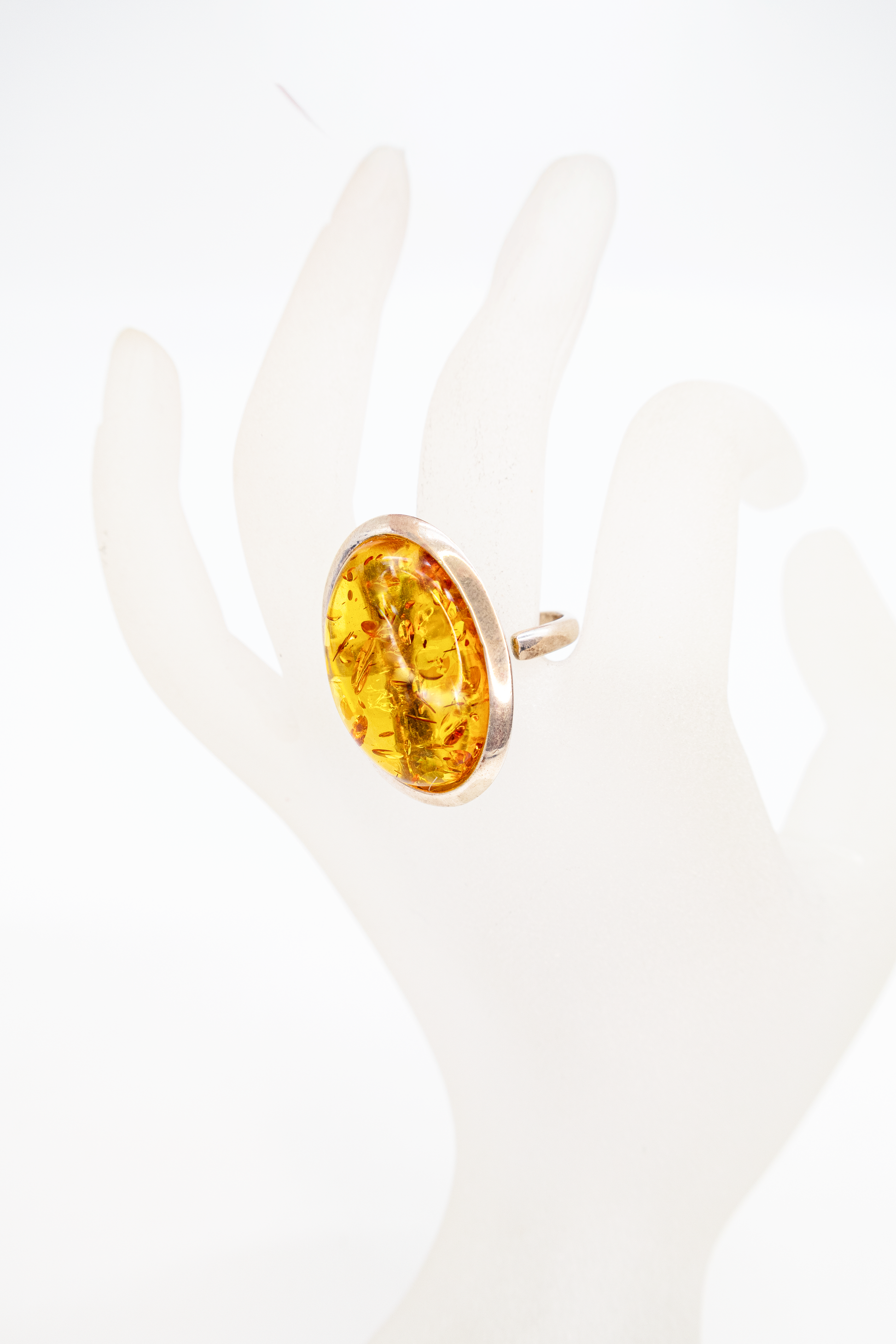 This handcrafted silver ring with genuine amber impresses with its clear, oval shape and the stone's vibrant color play. The amber measures approximately 3 × 2.2 × 0.6 cm and reveals its unique structure with fascinating inclusions in the light. The solid silver setting highlights the natural beauty of the amber and gives the ring a sophisticated, modern design. Thanks to the adjustable ring band, it can be individually adjusted and ensures optimal wearing comfort. Whether as a gift for a special someone or as a stylish addition to your own jewelry collection – this silver ring combines nature, elegance, and high-quality craftsmanship in a unique piece of jewelry.
