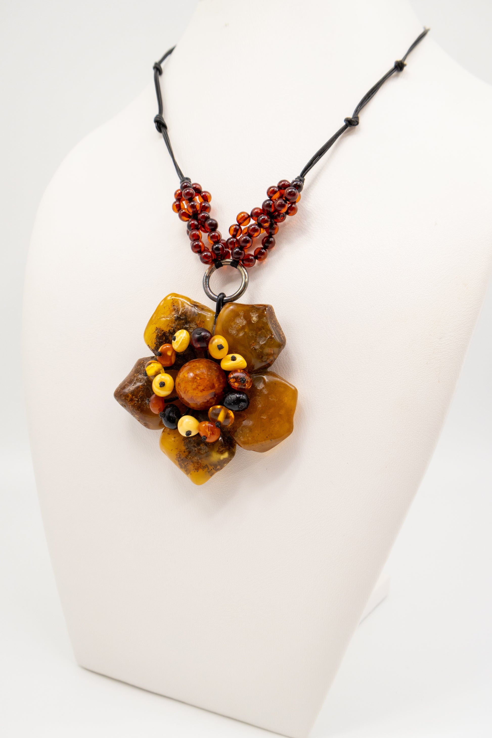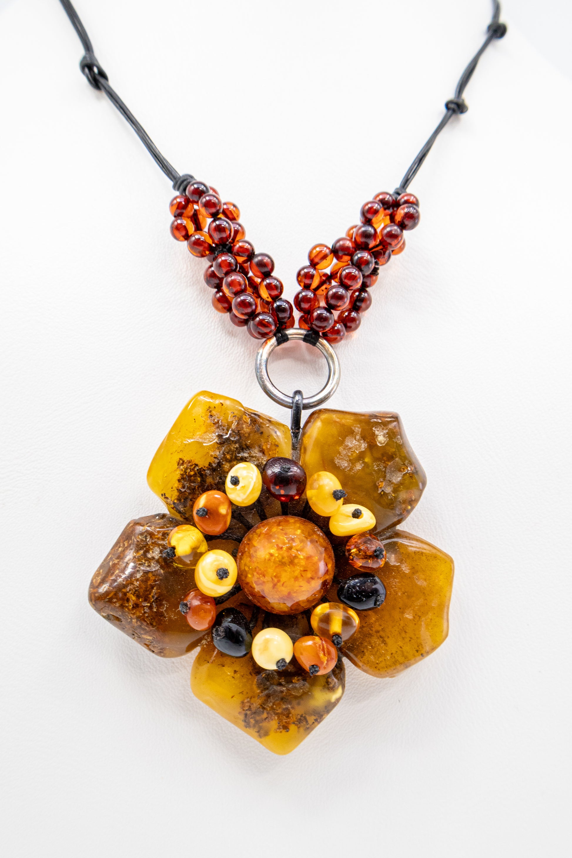 A truly unique piece: This handcrafted pendant made of 925 silver with genuine amber impresses with its extraordinary flower design and harmonious combination of honey-colored and darker amber tones. It comes with an approximately 50 cm long, artfully crafted leather chain adorned with matching amber beads and a unique clasp. This piece of jewelry is ideal as a gift for a wife, sister, or girlfriend and will captivate you with its uniqueness and elegant appeal.