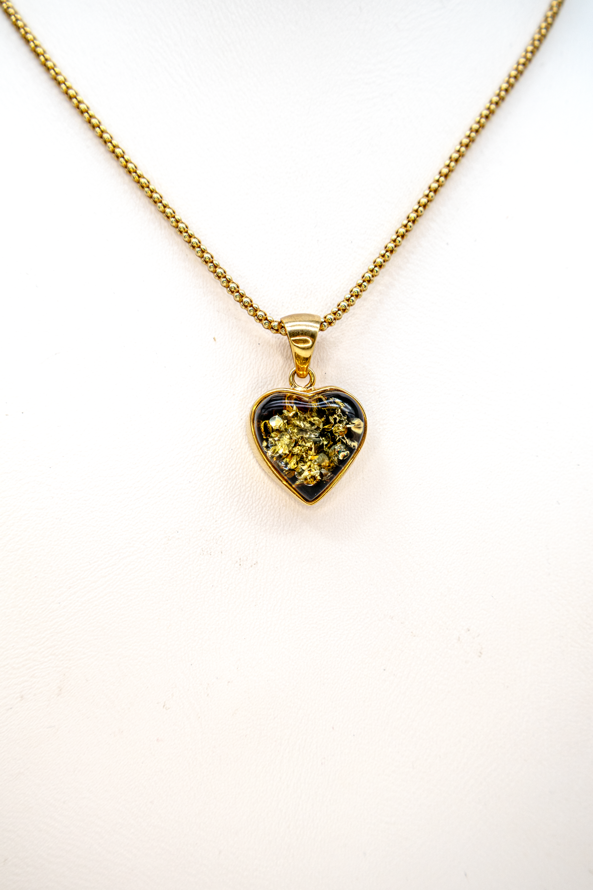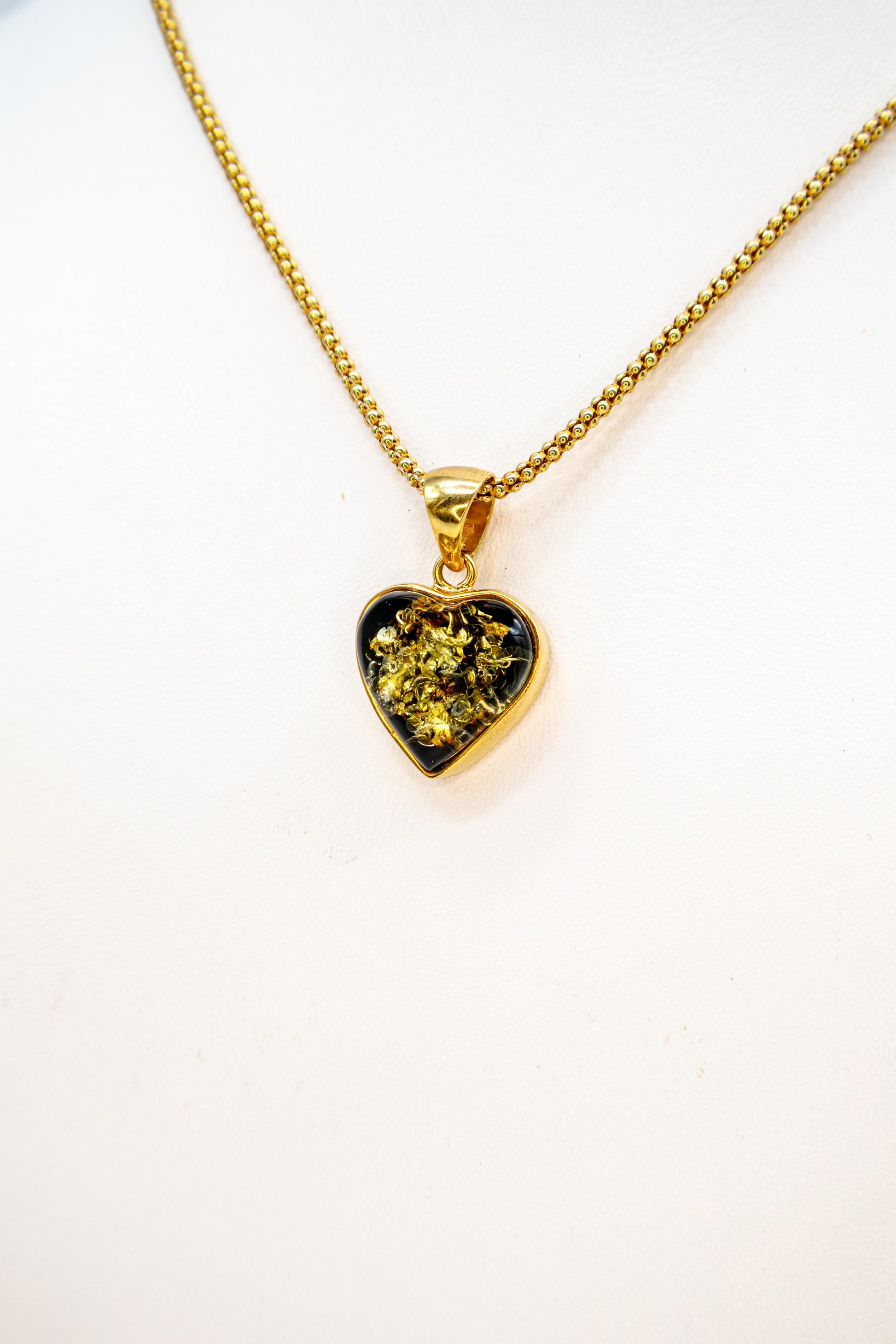 This gold-plated heart pendant with shimmering green amber is a beautiful symbol of love and elegance. The handcrafted pendant combines elegant gold-plated silver with the captivating texture of genuine amber. Its heart shape makes it a timeless companion and a perfect gift for a wife, sister, or girlfriend. A stylish piece of jewelry that combines warmth, naturalness, and uniqueness.
