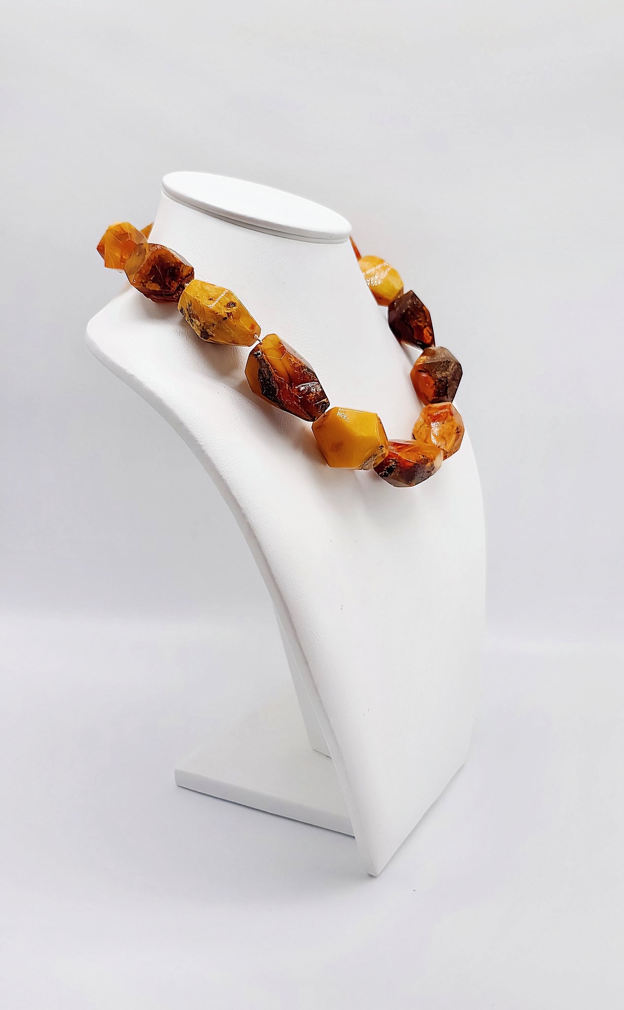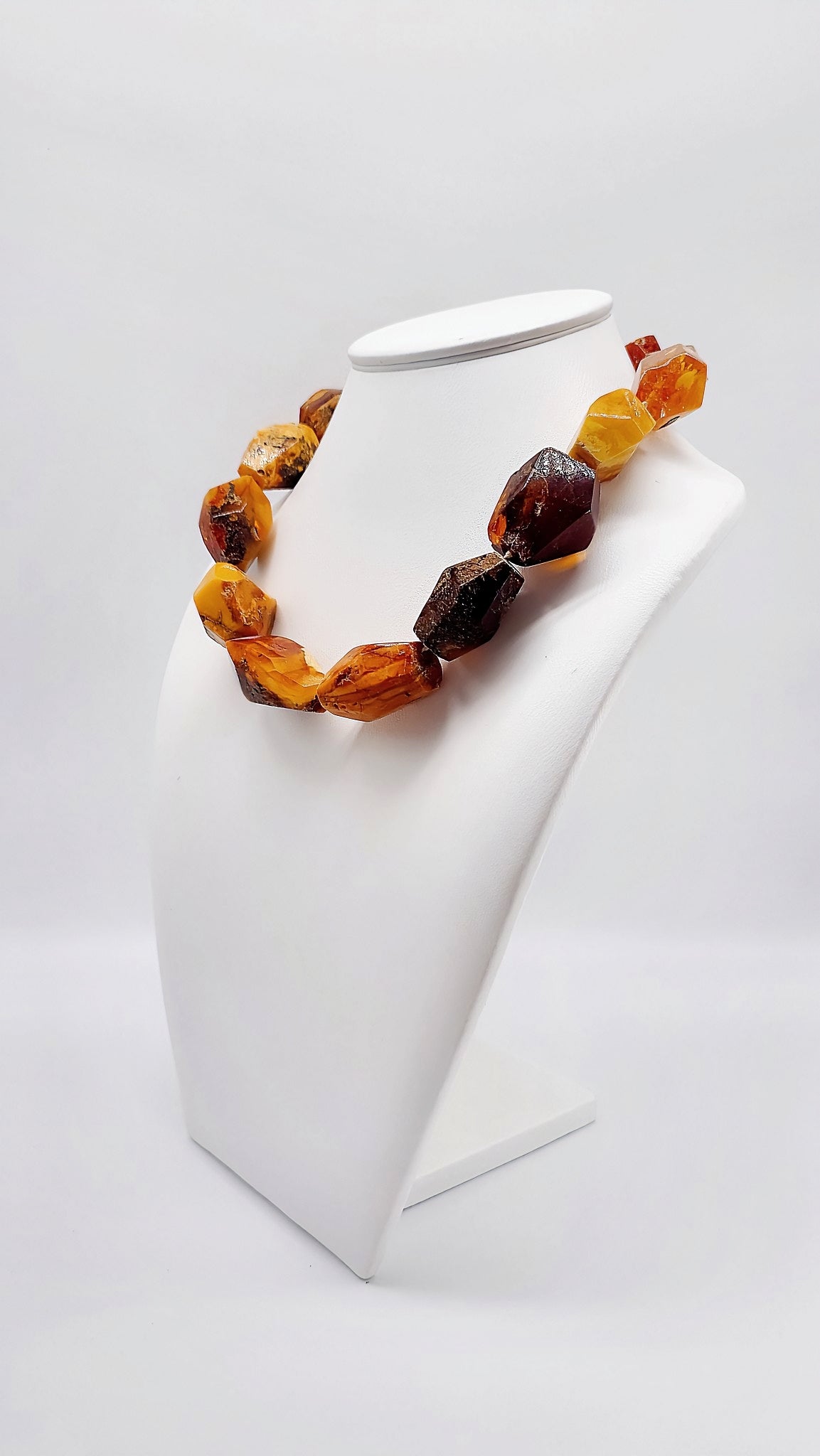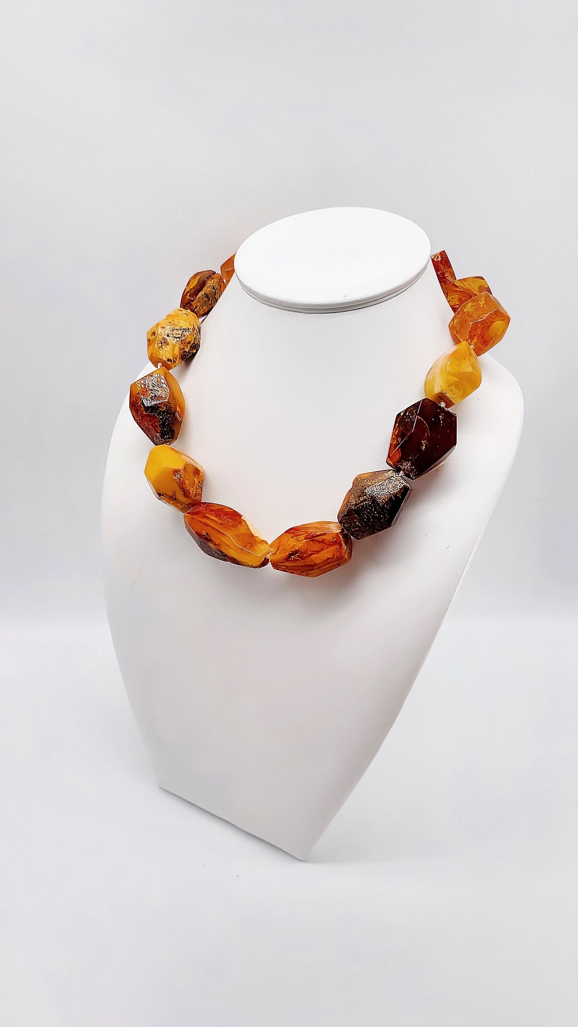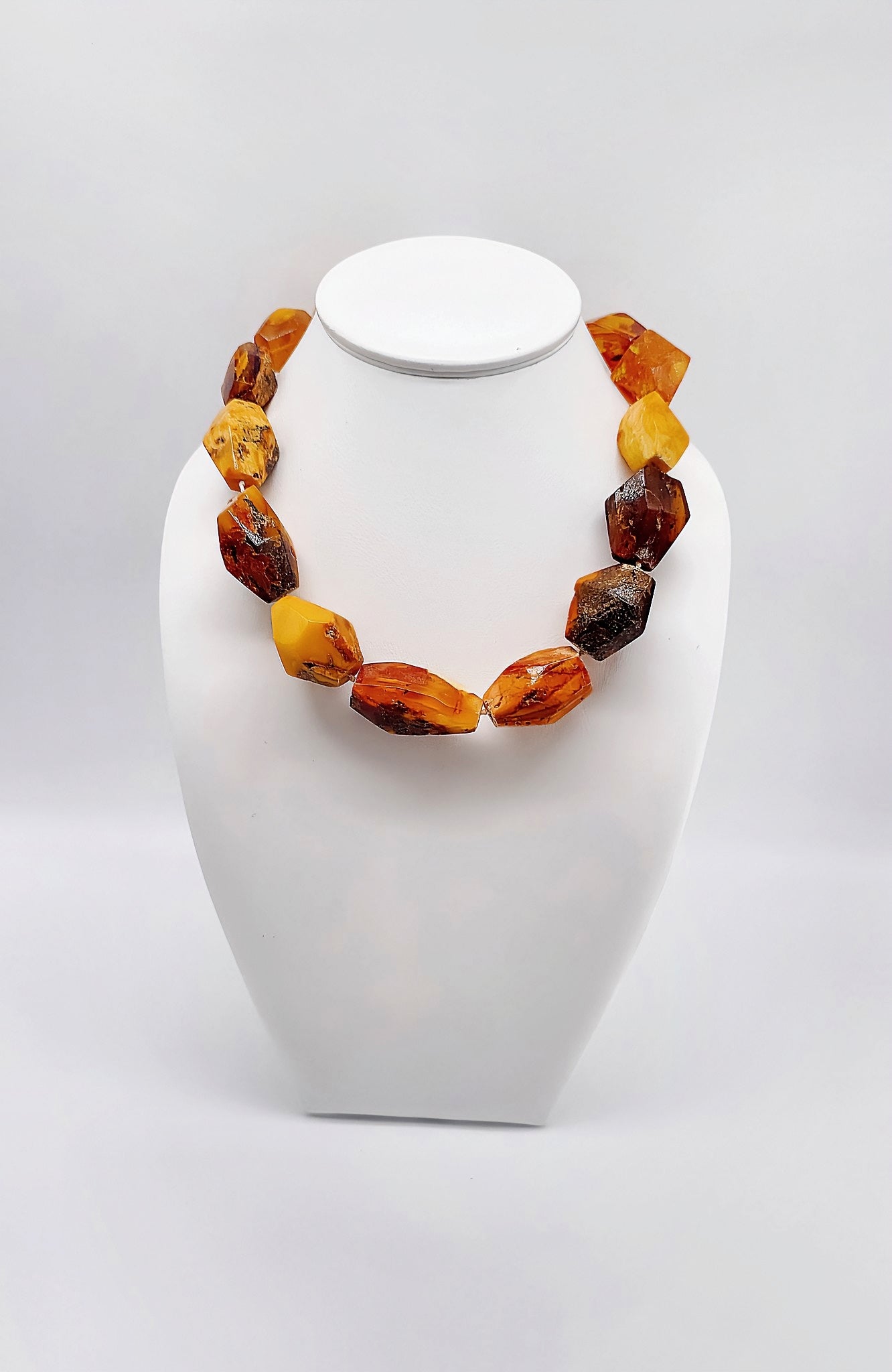 Genuine amber (in honey, orange and dark brown tones).