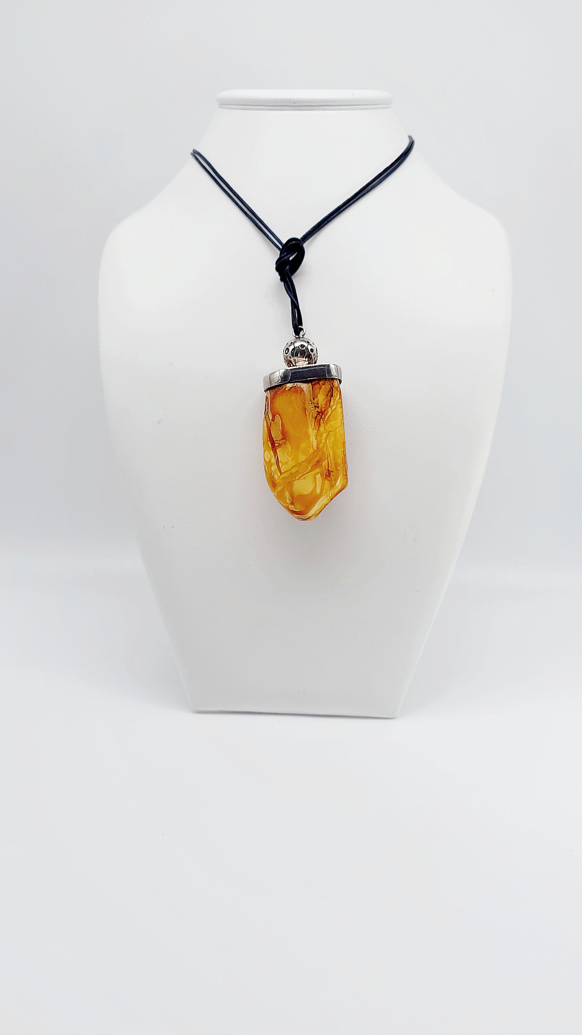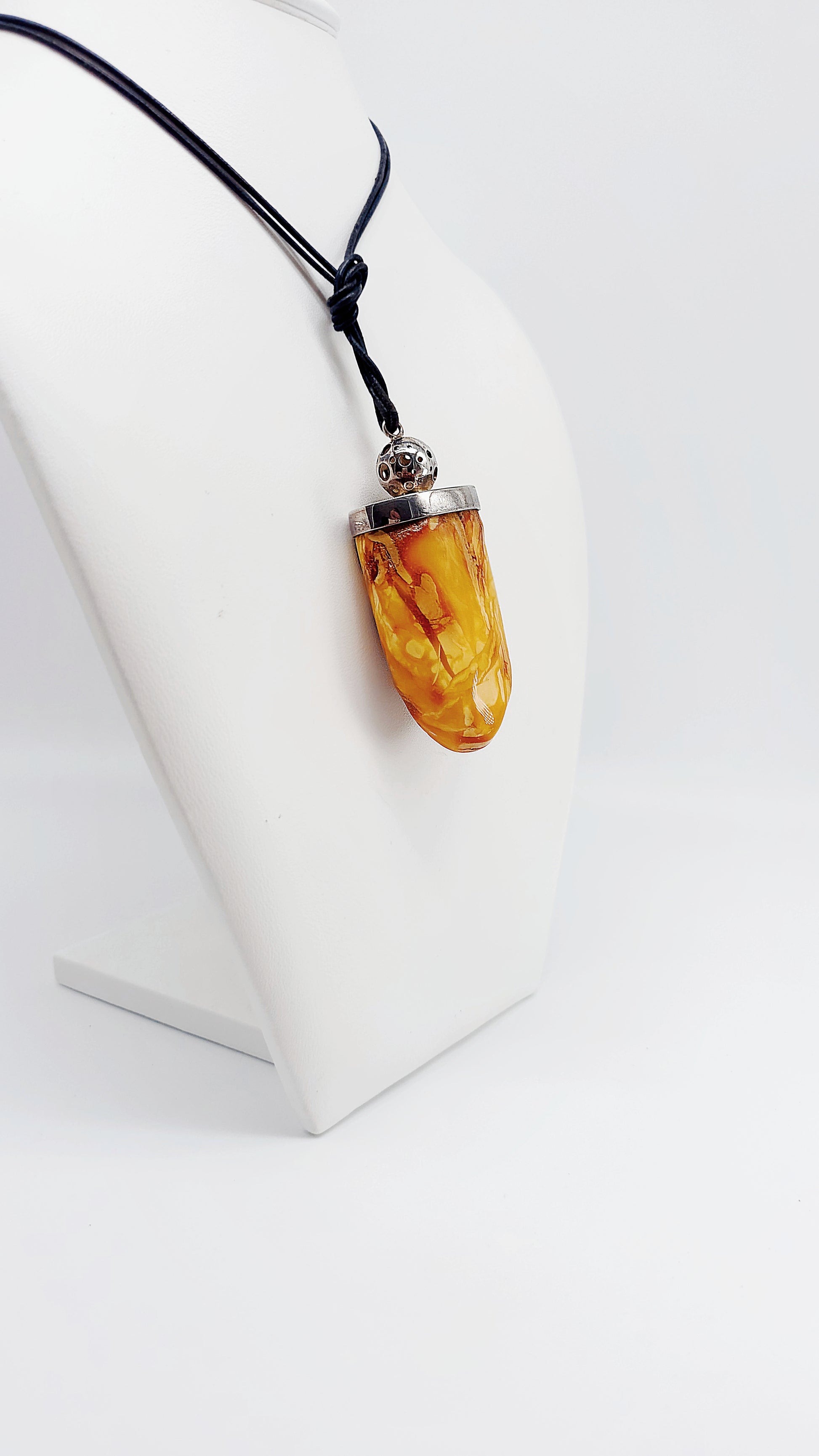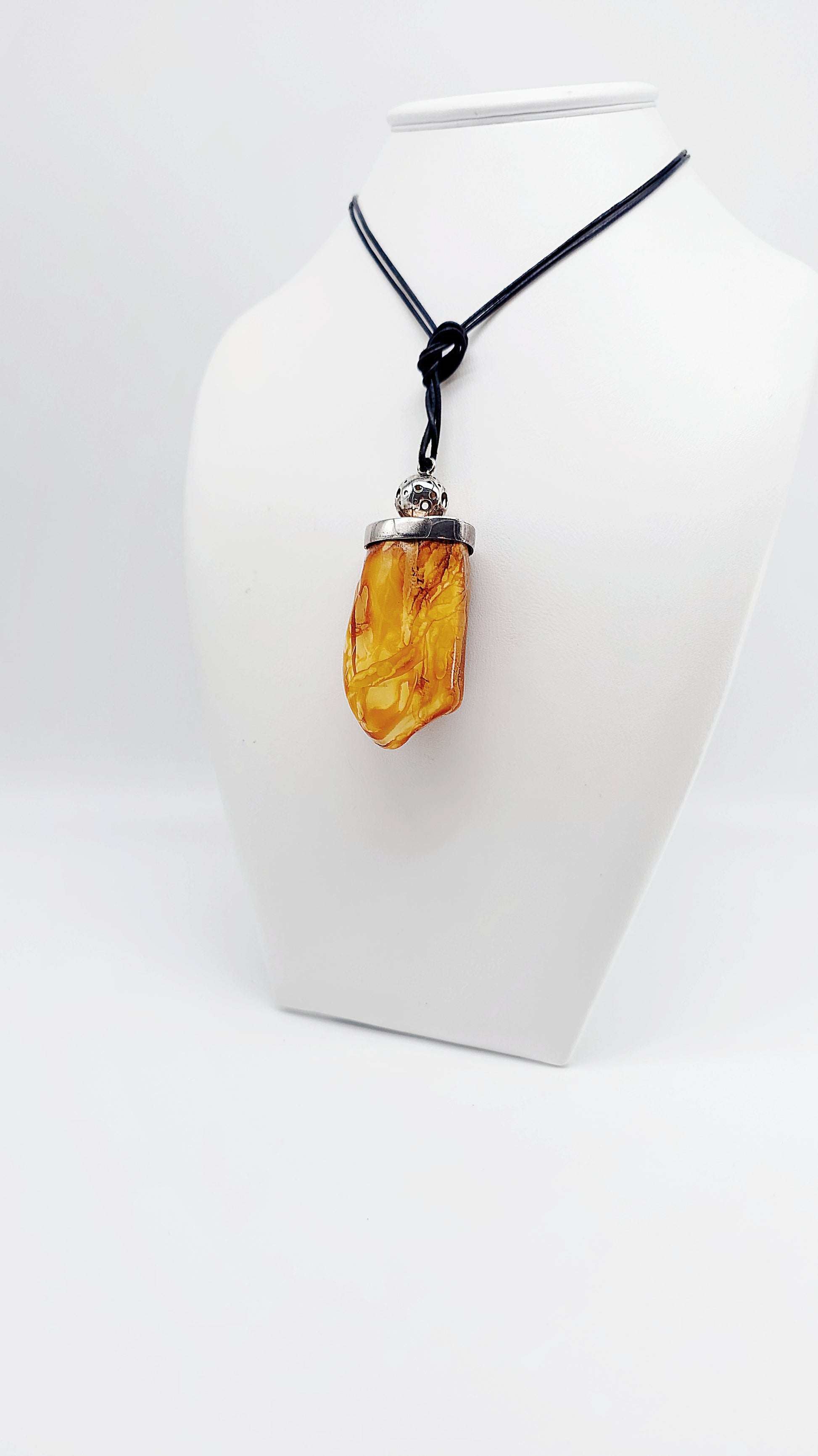 This unique amber pendant captivates with its natural, unpolished shape and warm golden color. The amber is artfully integrated into a subtle silver setting and attached to a stylish leather cord. Each pendant is unique and highlights the unique structures and color nuances of the amber. Ideal for nature lovers and those who prefer authentic, natural accessories, this pendant perfectly showcases the beauty of nature.