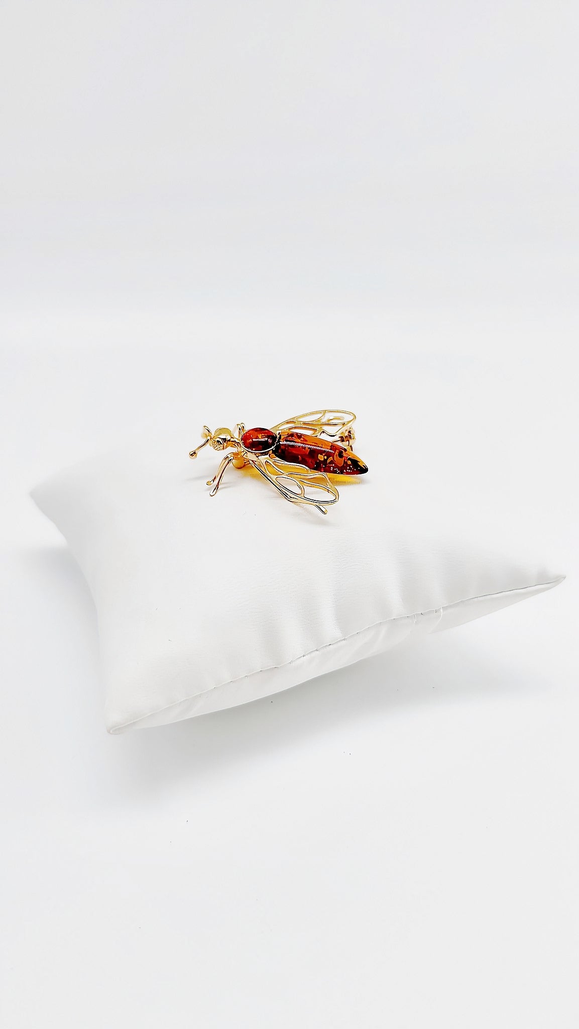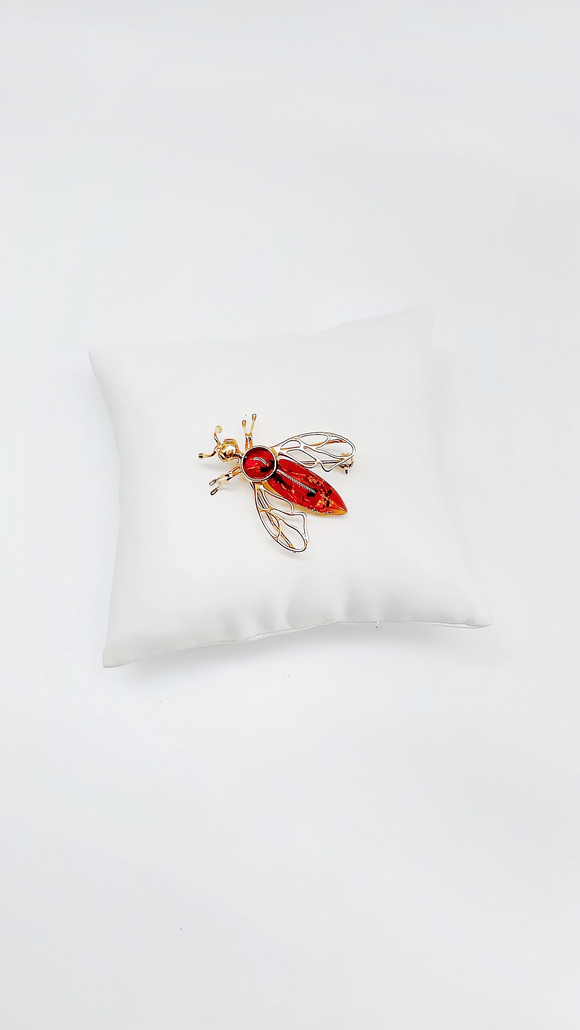This exquisite brooch combines the natural beauty of deep red amber with the elegant appeal of gold-plated silver in the shape of a stylized bow tie. The artfully cut amber forms the body of the bow tie, while the delicate, gold-plated wings and details complete the design. This brooch is a unique accessory that adds a touch of luxury and connection to nature to any outfit. Lightweight and comfortable to wear, it is ideal for special occasions or as a stylish highlight in everyday life.