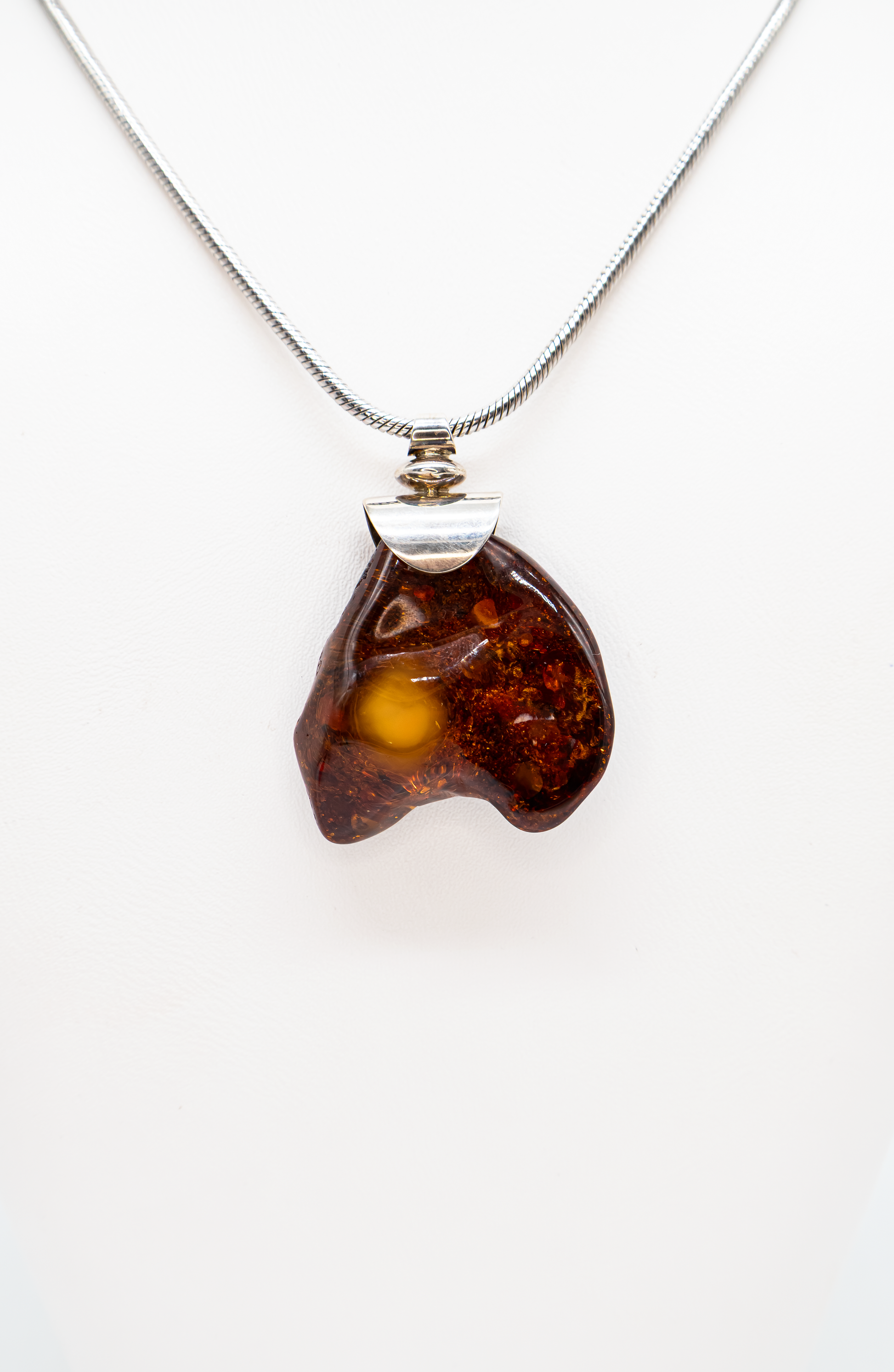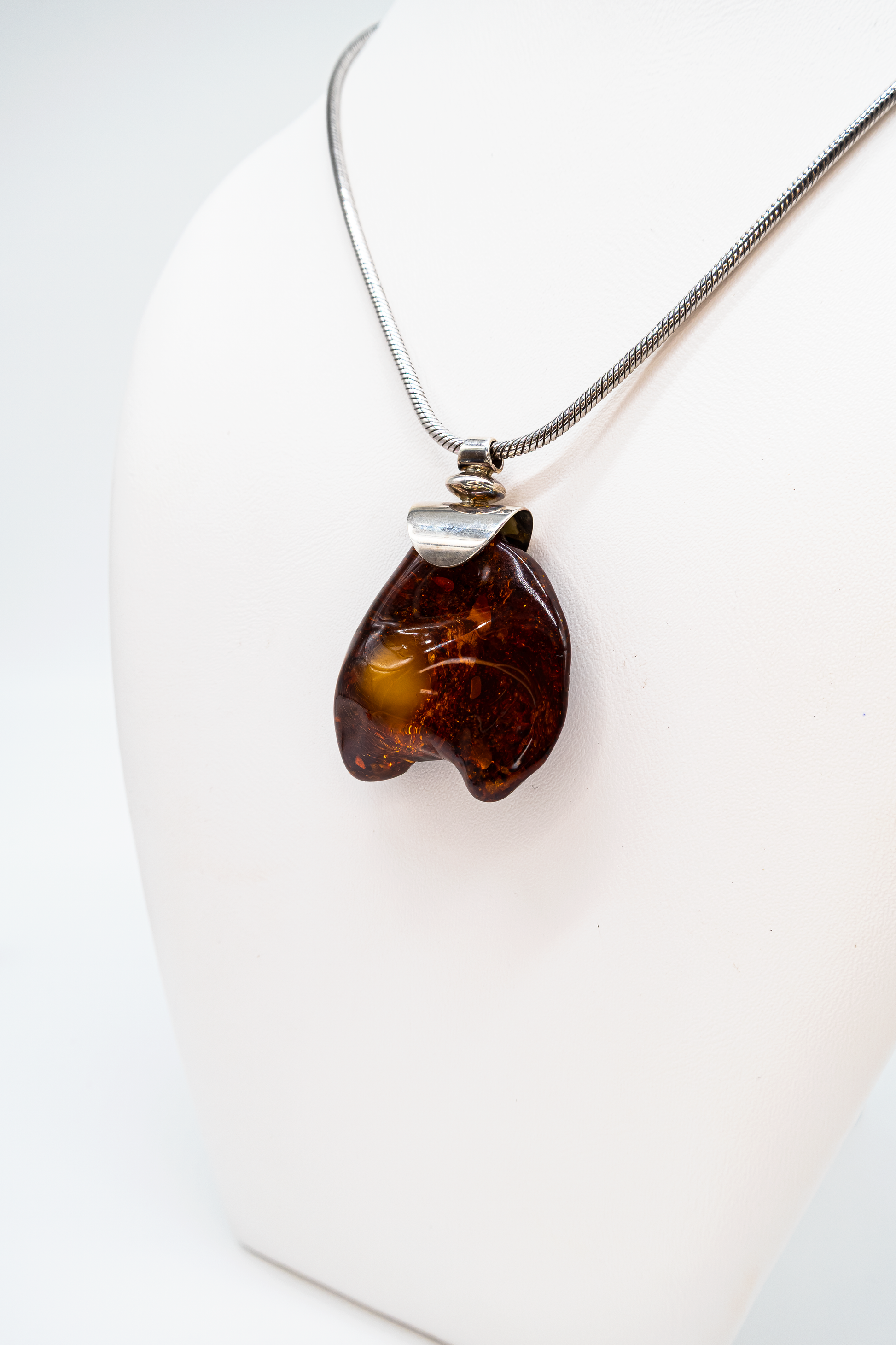 This extraordinary piece of jewelry is truly one of a kind – a handcrafted pendant made of genuine amber that captivates with its unique shape and warm play of colors. Measuring approximately 6 cm x 4.4 cm, it is a striking yet elegant accessory that will enhance any jewelry collection. Its natural structure and exquisite cut give this pendant a distinctive appeal, making it a truly one-of-a-kind piece. Perfect as an exclusive gift for your wife, sister, or girlfriend – a unique piece that creates memories and preserves treasures.