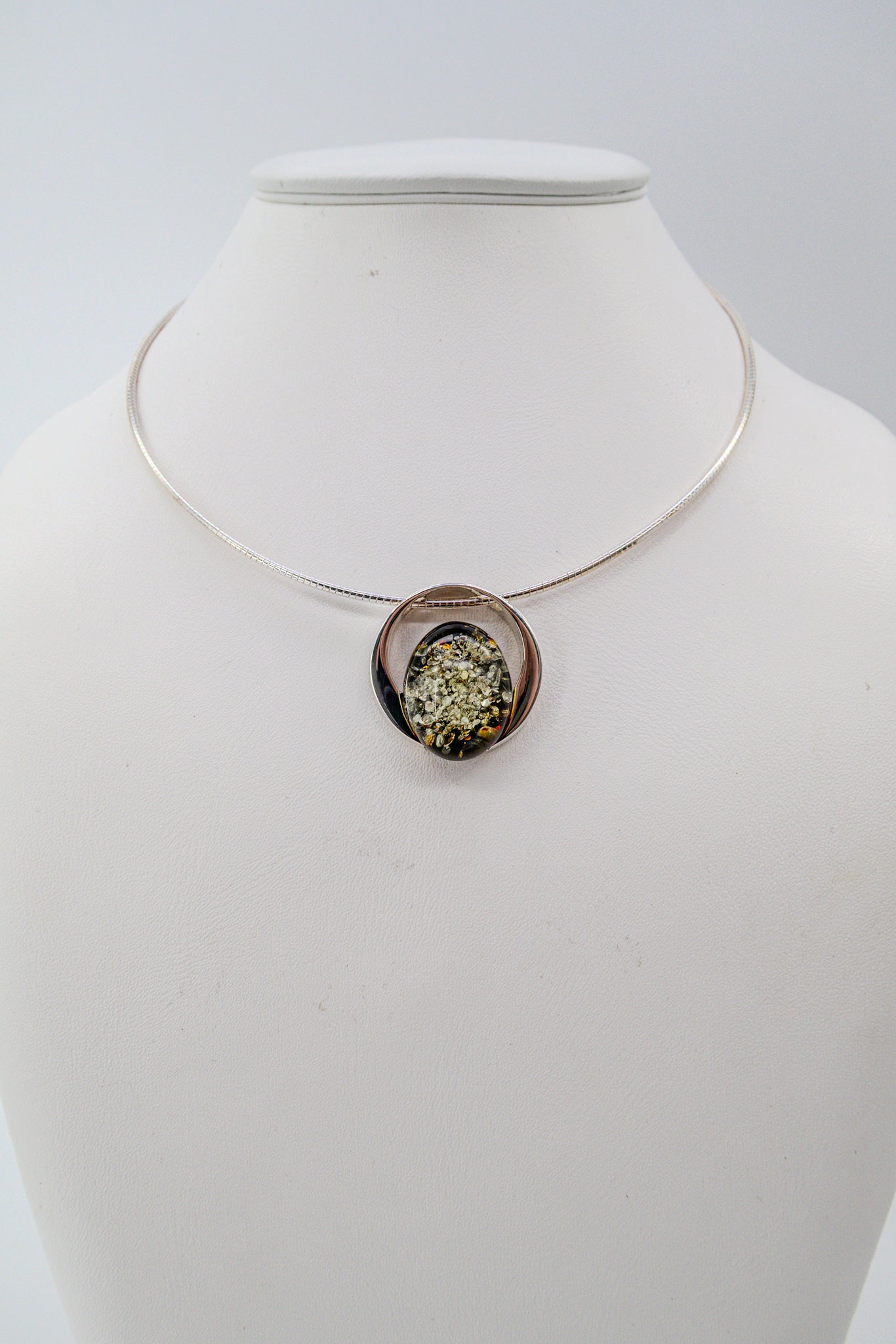 Funkelnder Bernstein mit einzigartigem Farbspiel in einem verschlungenen Silberrahmen – ein stilvolles Unikat.