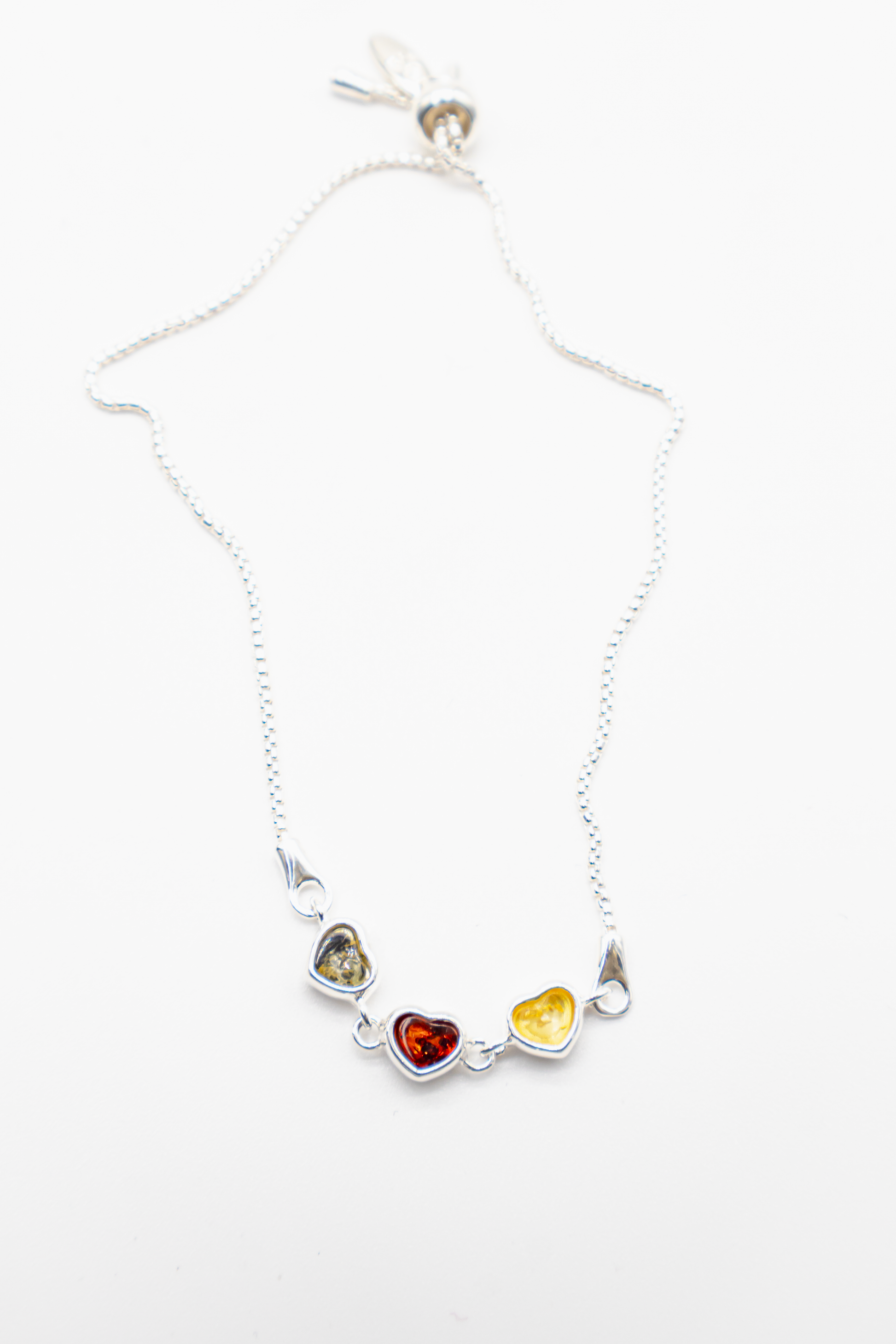 Dieses zauberhafte Silberarmband ist so vielseitig wie das Leben selbst. Drei zarte Herzen aus echtem Baltischen Bernstein reihen sich aneinander und strahlen in den schönsten Farben der Natur: frisches Zitronengelb, klassisches Cognac und geheimnisvolles Grün.