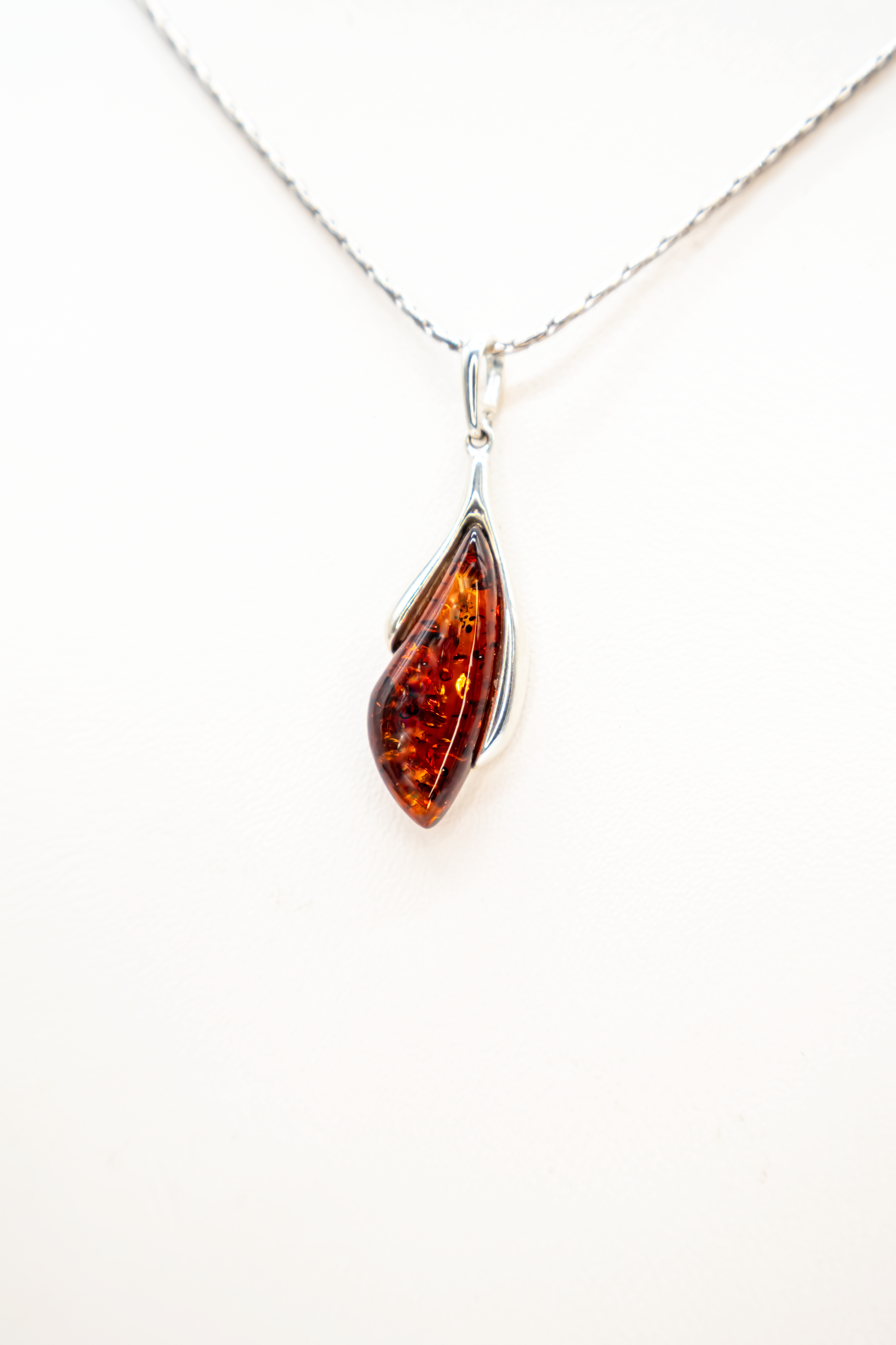 Durch die tropfenförmige, flammenartige Form wirkt der Anhänger besonders ausdrucksstark und unterstreicht die natürliche Wärme des Bernsteins.