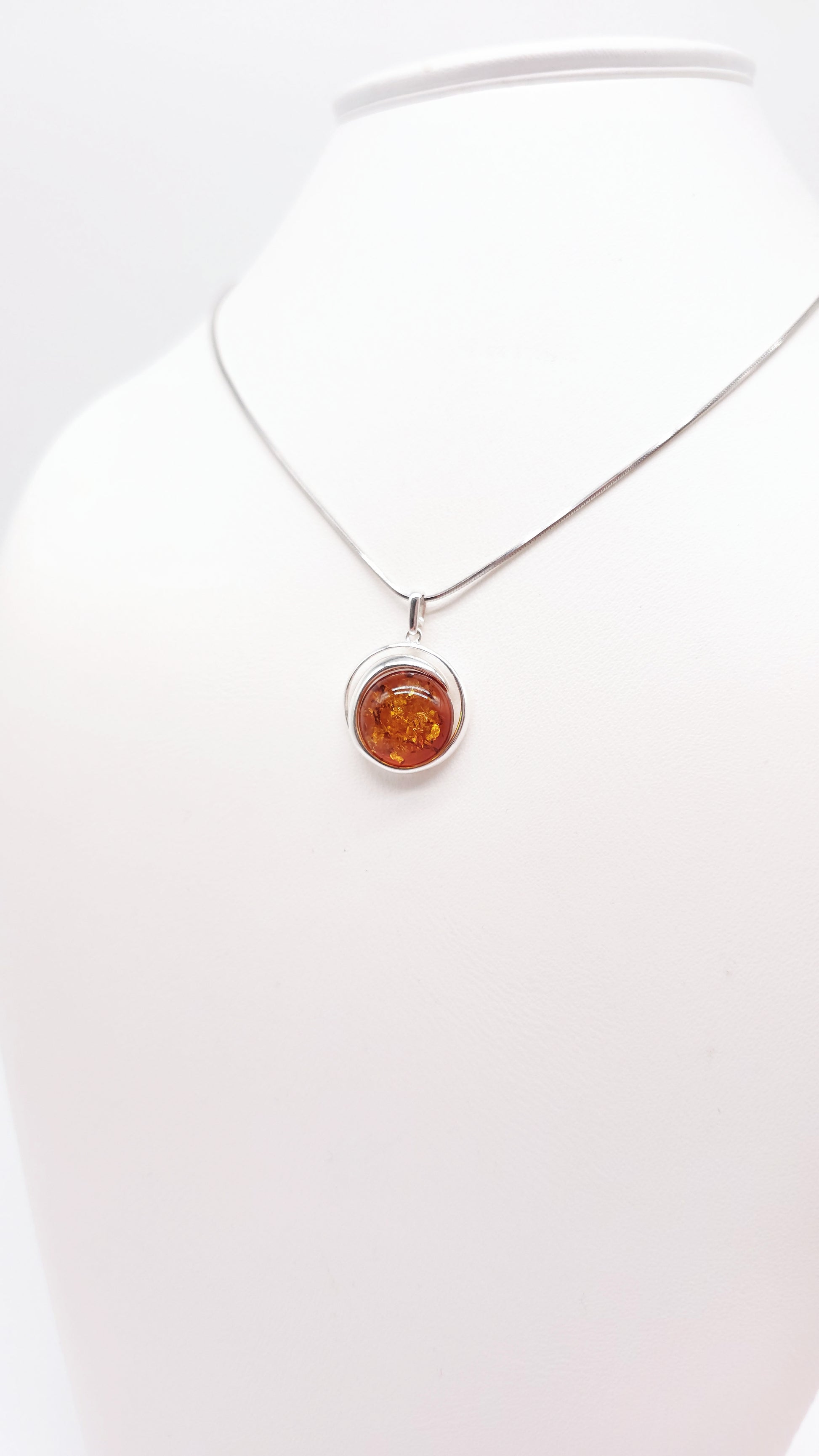 Dieser elegante Anhänger vereint stilvolle Zurückhaltung mit natürlicher Wärme. Der runde Bernstein mit seiner intensiven Honigfarbe und klarer Struktur wird von einer glänzenden Fassung aus 925er Silber umrahmt. Durch das harmonische Design entsteht ein zeitloser Begleiter, der zu jedem Outfit passt.
