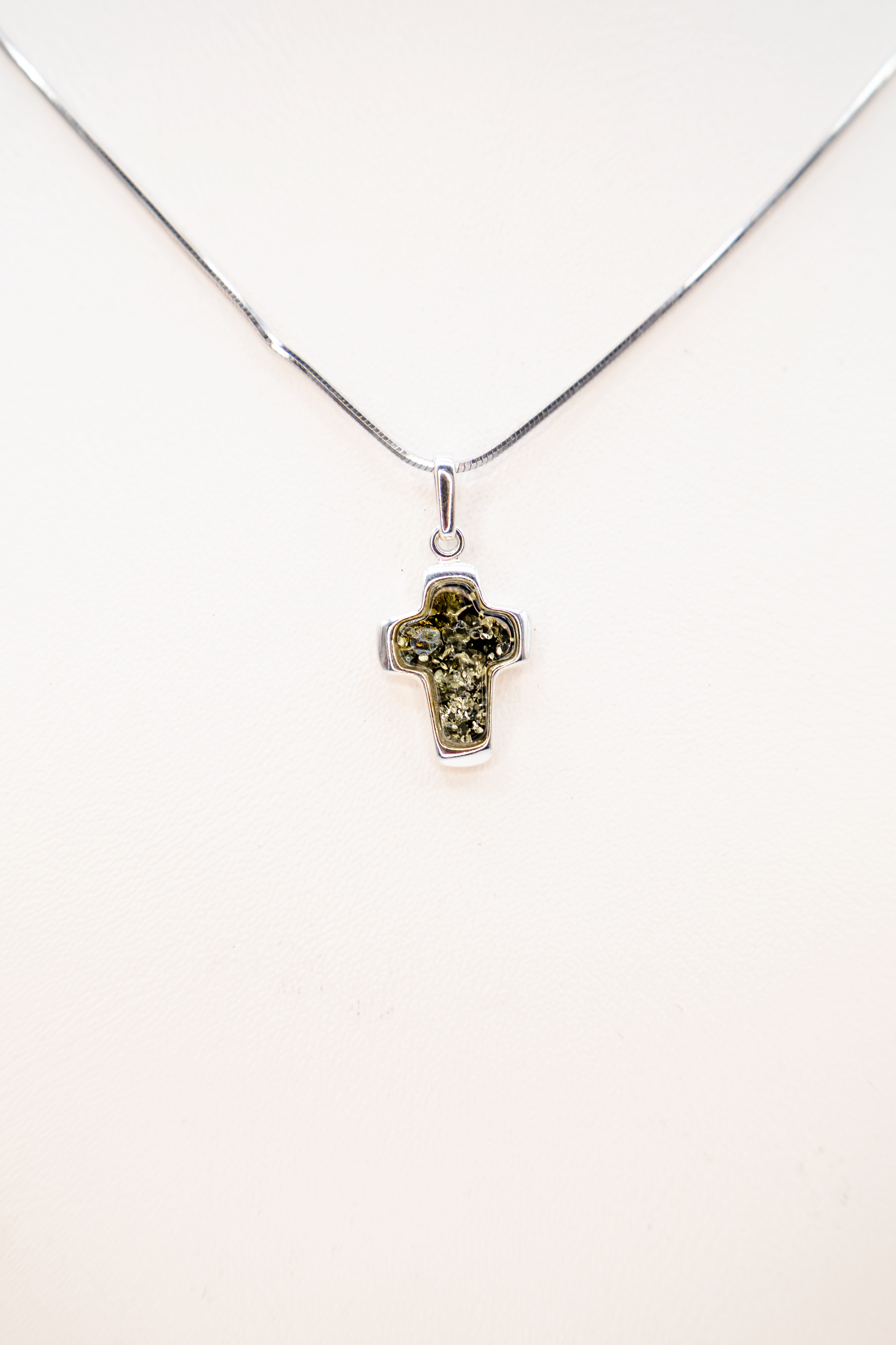 Grün schimmernder Bernstein in Kreuzform, vereint Spiritualität und Eleganz