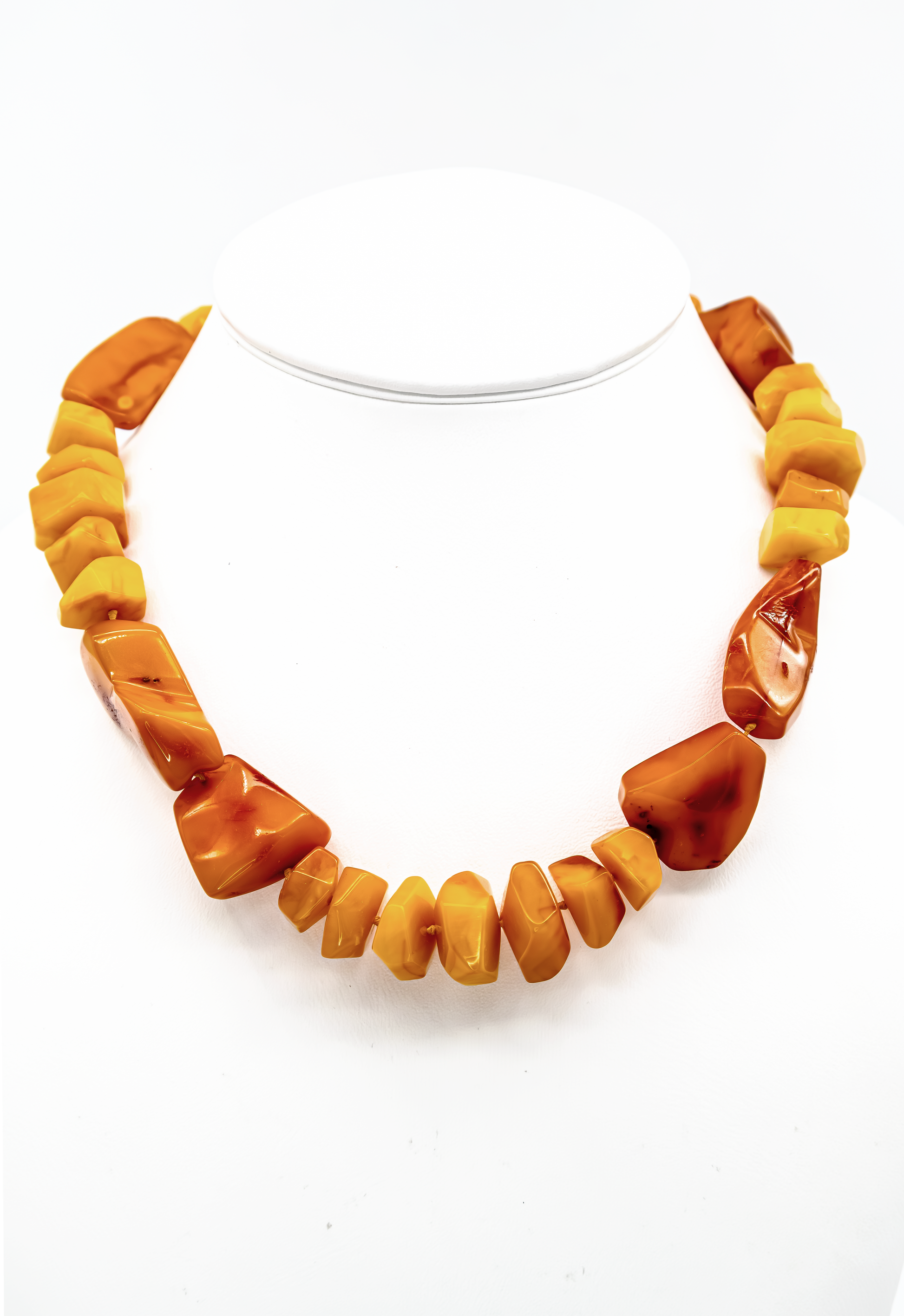 Diese außergewöhnliche Bernstein Halskette ist ein handgefertigtes Unikat, das durch seine kräftigen Farbtöne und seine markante Form sofort begeistert. Die großen, unterschiedlich geformten Bernsteine in warmen Nuancen von Honiggelb bis Karamellbraun verleihen der Kette eine natürliche und zugleich luxuriöse Ausstrahlung.