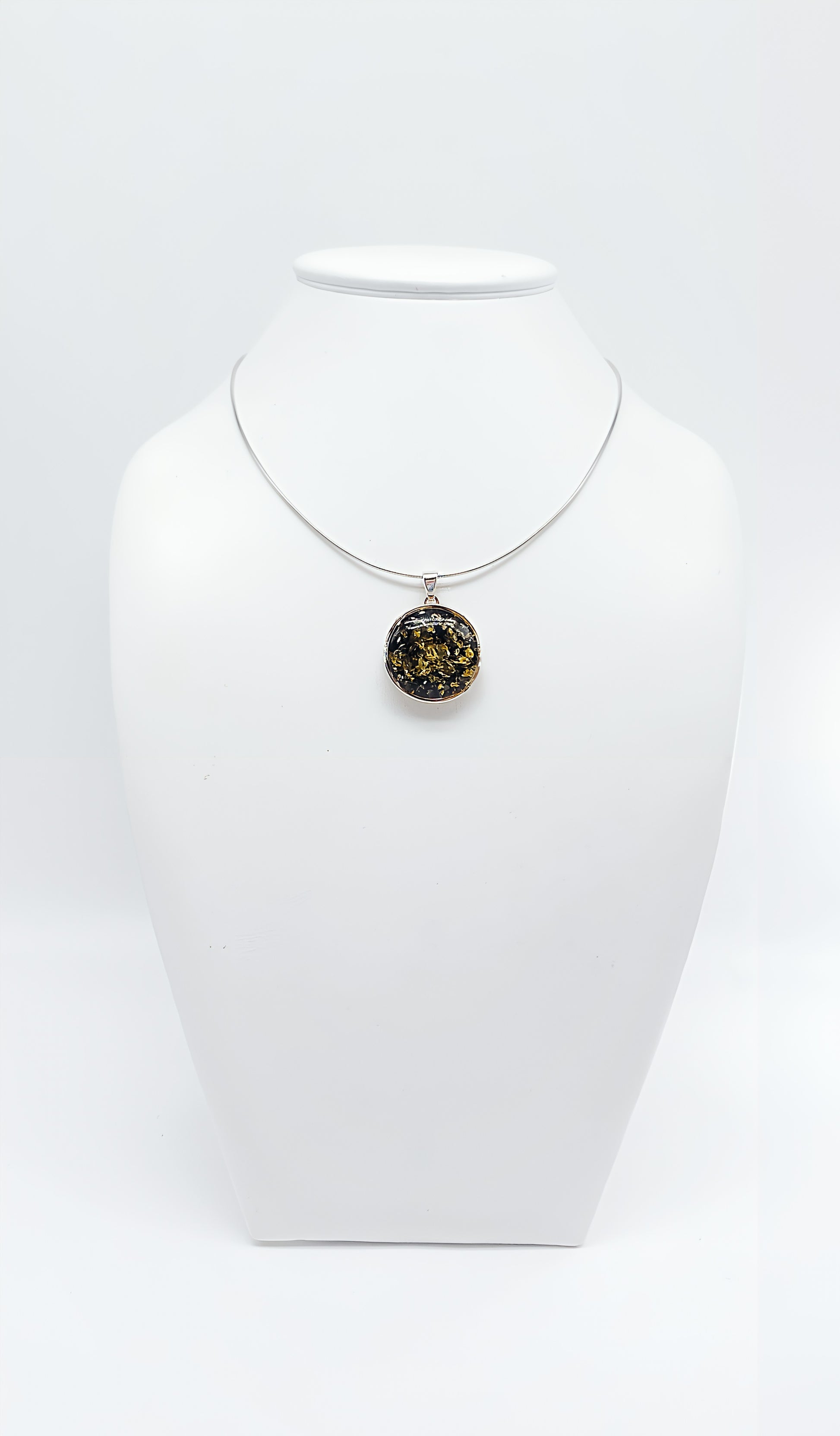 Dieser Anhänger fängt die Faszination des Universums ein, indem er tiefen, dunklen Bernstein in einem runden 925er Sterlingsilberrahmen präsentiert. Die natürlichen Muster im Bernstein ähneln einem sternenklaren Himmel, was diesem Stück eine geheimnisvolle und bezaubernde Aura verleiht. Perfekt für Liebhaber von Schmuckstücken, die sowohl raffiniert als auch einzigartig sind und eine Geschichte erzählen.