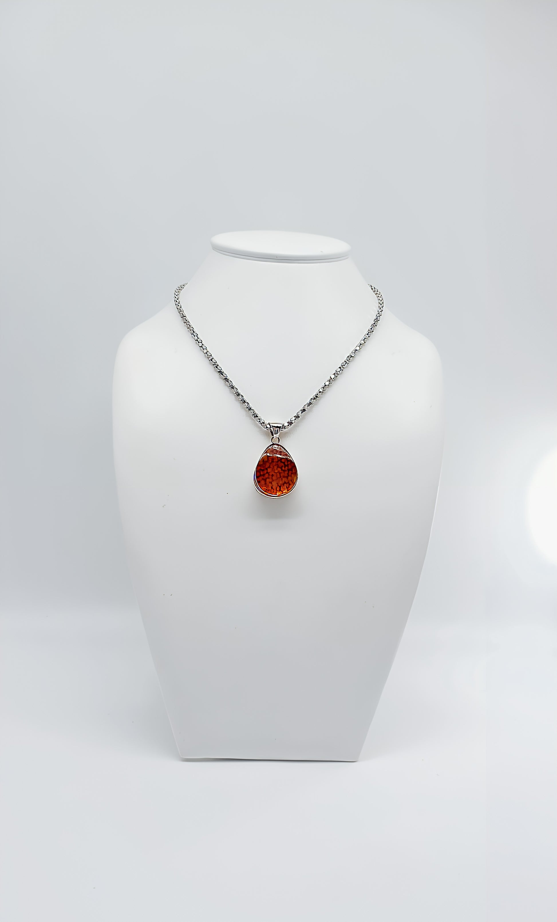 Dieser Anhänger präsentiert einen außergewöhnlichen Bernstein in intensivem Rot, der kunstvoll in 925er Sterlingsilber eingefasst ist. Der leuchtende Stein, bekannt für seine fesselnden Farben und natürlichen Muster, strahlt Wärme und Leidenschaft aus. Dieses Schmuckstück kombiniert traditionelle Eleganz mit modernem Design und ist perfekt für diejenigen, die einen Blickfang suchen, der sowohl tagsüber als auch abends glänzt.