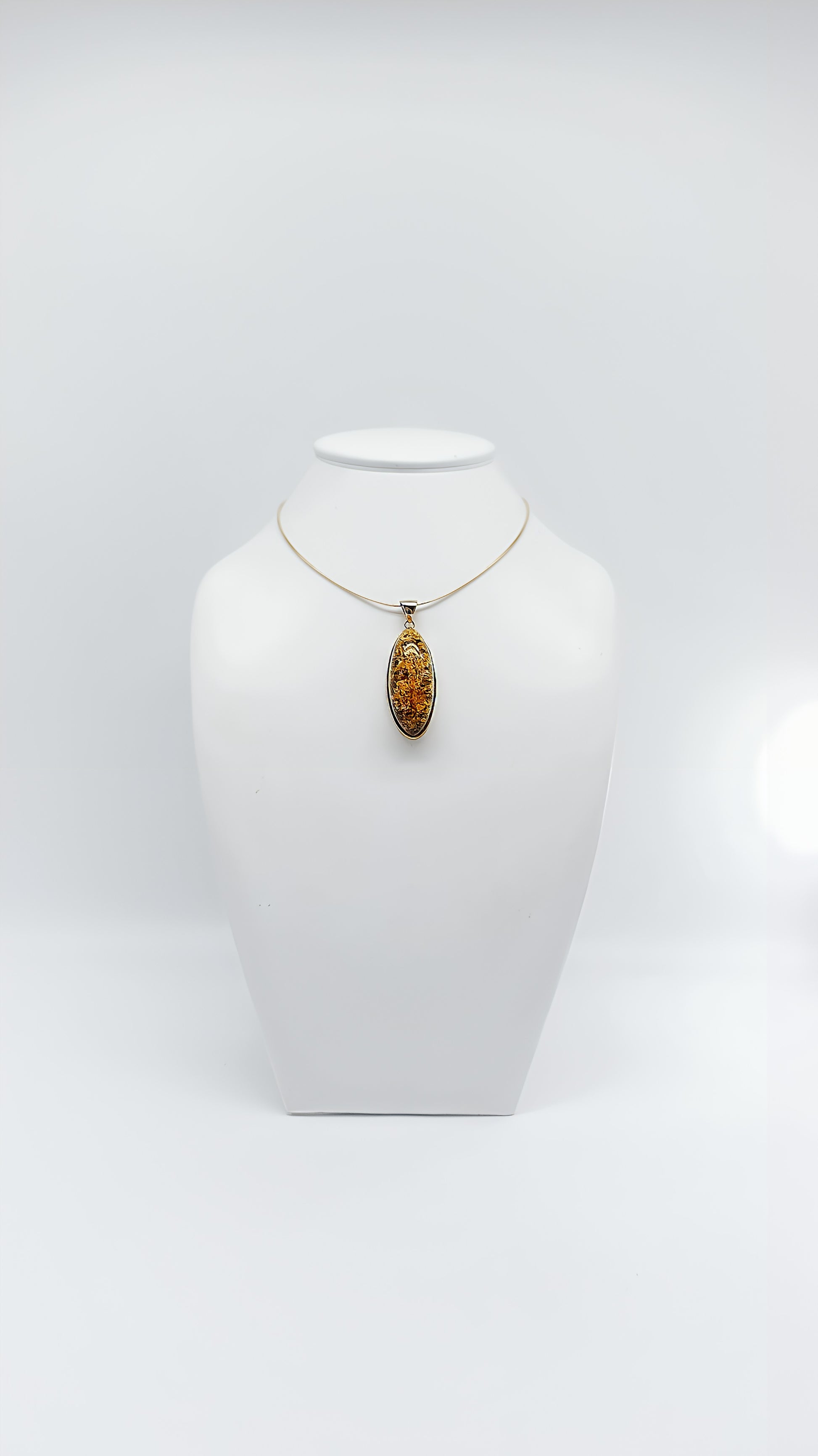 Dieser exquisite Anhänger kombiniert die natürliche Schönheit des Bernsteins mit der Pracht vergoldeten 925er Sterlingsilbers. Der Bernstein, reich an warmen Farben und organischen Mustern, ist in einer eleganten, ovalen Form gefasst, die seine Leuchtkraft betont. Die Vergoldung verleiht dem Schmuckstück zusätzlichen Glanz und macht es zu einem perfekten Accessoire für besondere Anlässe oder als edles Geschenk.