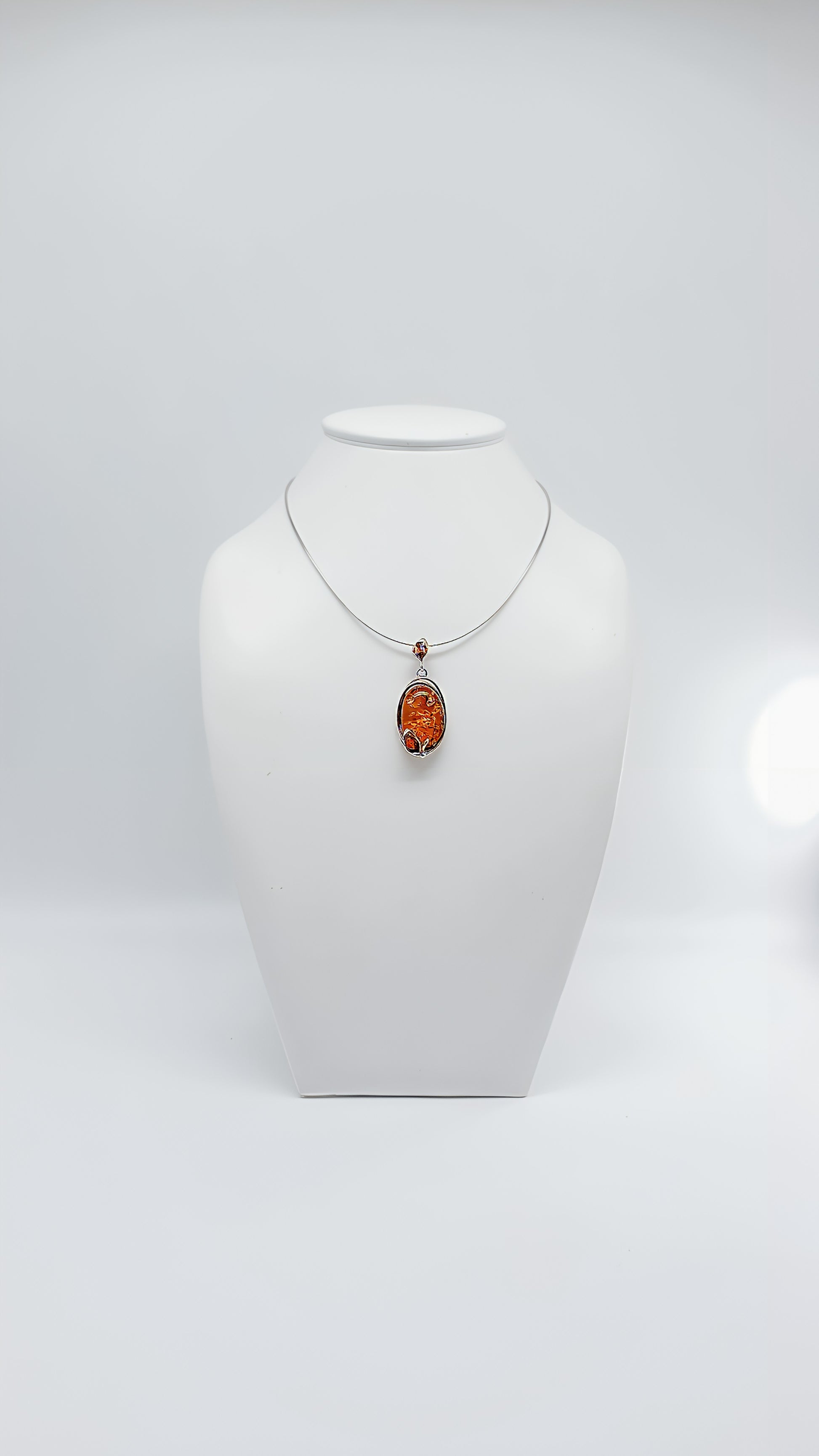 Dieser exquisite Anhänger aus 925er Sterlingsilber, verziert mit einem leuchtend orangen Bernstein, ist ein echtes Kunstwerk. Das elegante Design kombiniert moderne und traditionelle Elemente, die den tiefen, warmen Farbton des Bernsteins betonen. Jedes Schmuckstück ist ein Unikat, das die Faszination und Wärme dieses besonderen Steins widerspiegelt. Dieser Anhänger ist ideal für alle, die Schmuck mit Charakter und einer Geschichte schätzen.