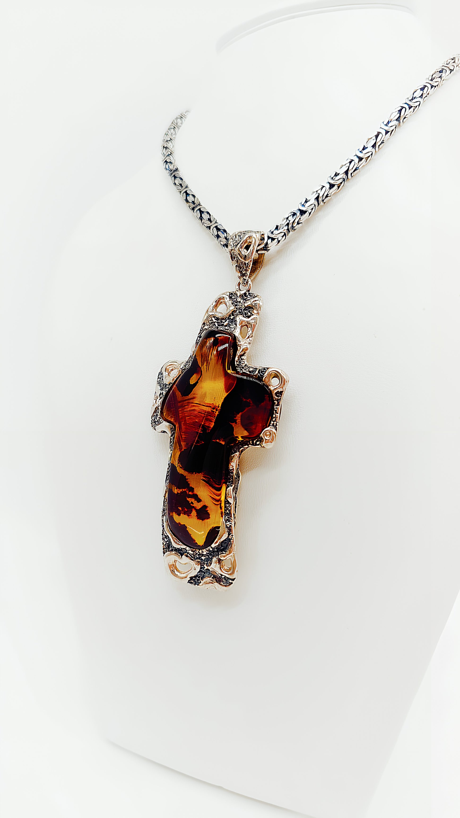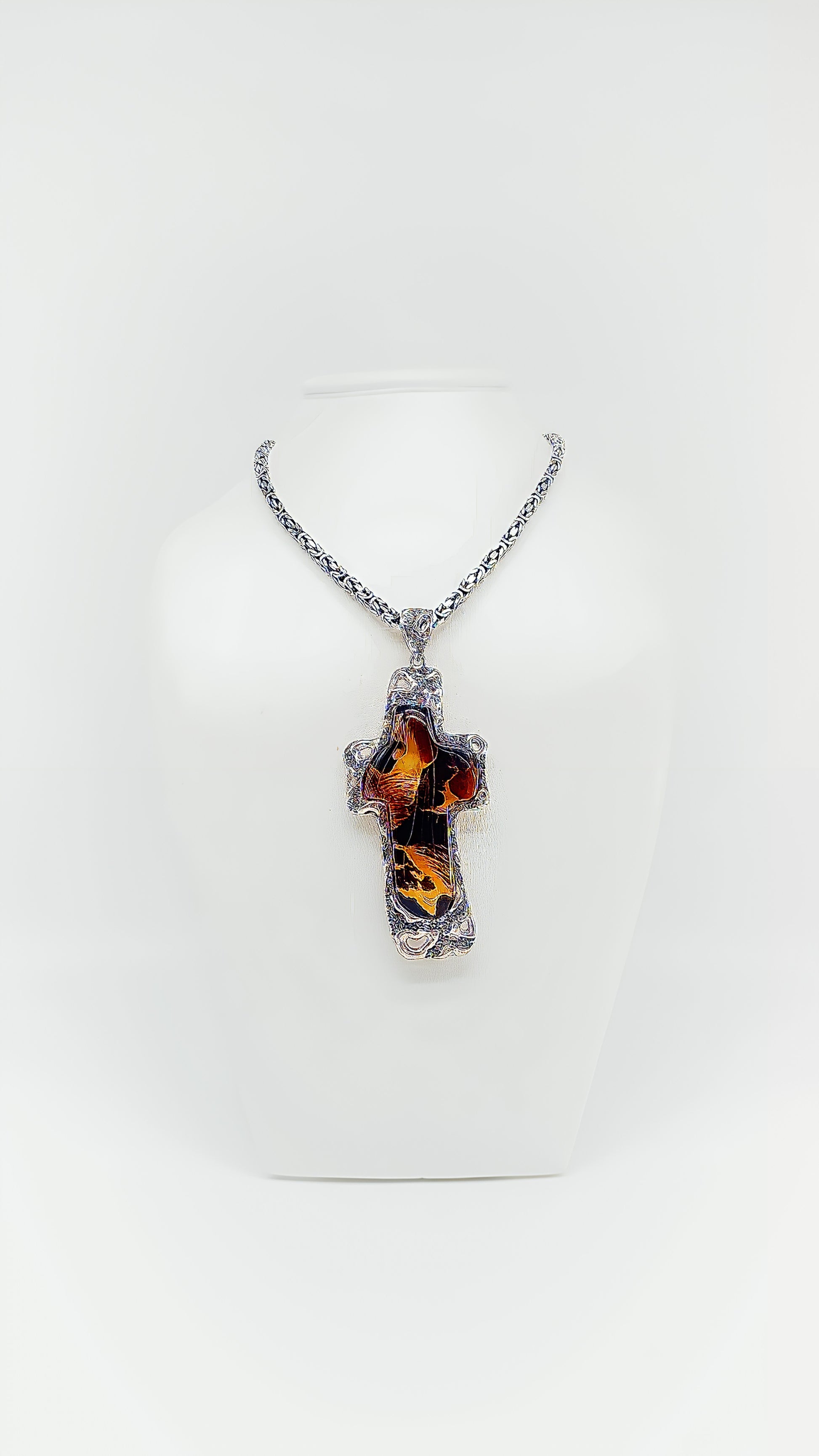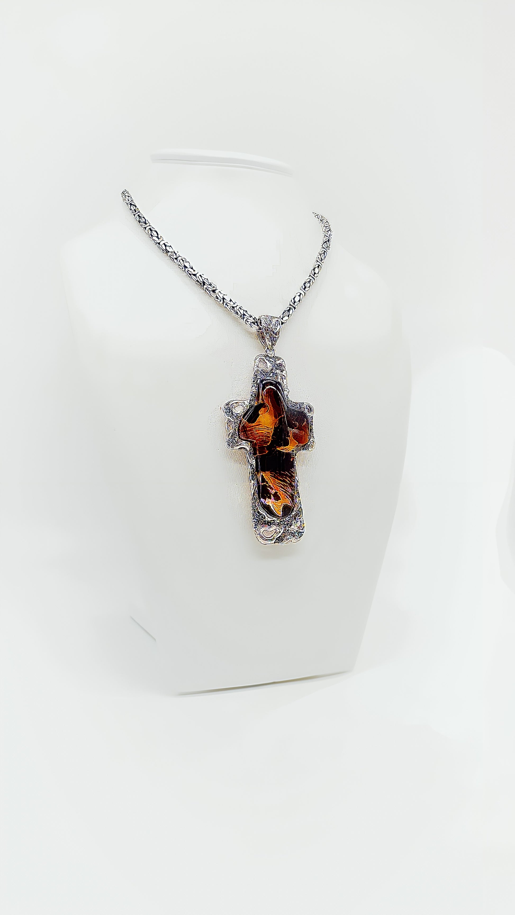 Dieser außergewöhnliche Kreuzanhänger vereint spirituelle Symbolik mit der Schönheit der Natur. Gefertigt aus 925er Sterlingsilber, umrahmt dieses Schmuckstück einen einzigartigen Bernsteineinsatz, der in warmen, erdigen Tönen schimmert. Jeder Anhänger ist ein Unikat, das nicht nur als Schmuck, sondern auch als spiritueller Begleiter getragen werden kann. Perfekt für alle, die ein Stück Natur und Glauben stets bei sich tragen möchten.