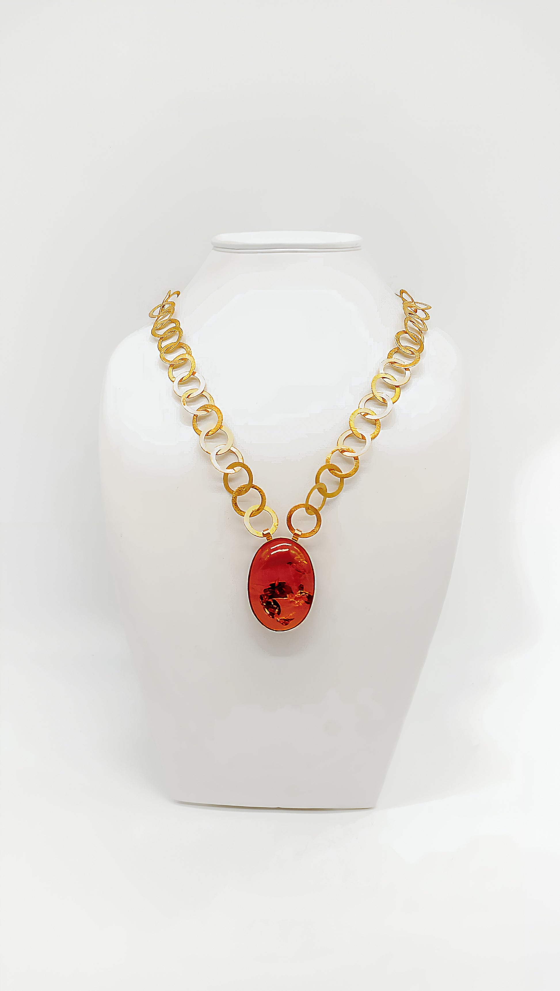 Diese außergewöhnliche Kette aus vergoldetem 925er Sterlingsilber ist ein wahres Meisterwerk der Schmuckkunst. Der großzügige Bernstein-Anhänger, der sanft in das goldene Geflecht der Kette eingefasst ist, strahlt eine unvergleichliche Wärme und Eleganz aus. Jedes Detail dieses Schmuckstücks wurde sorgfältig gestaltet, um eine harmonische Verbindung von Luxus und Natur zu schaffen. Dieses Unikat ist perfekt für diejenigen, die auf der Suche nach einem besonderen Schmuckstück sind, das sowohl im Alltag als auch zu besonderen Anlässen alle Blicke auf sich zieht.