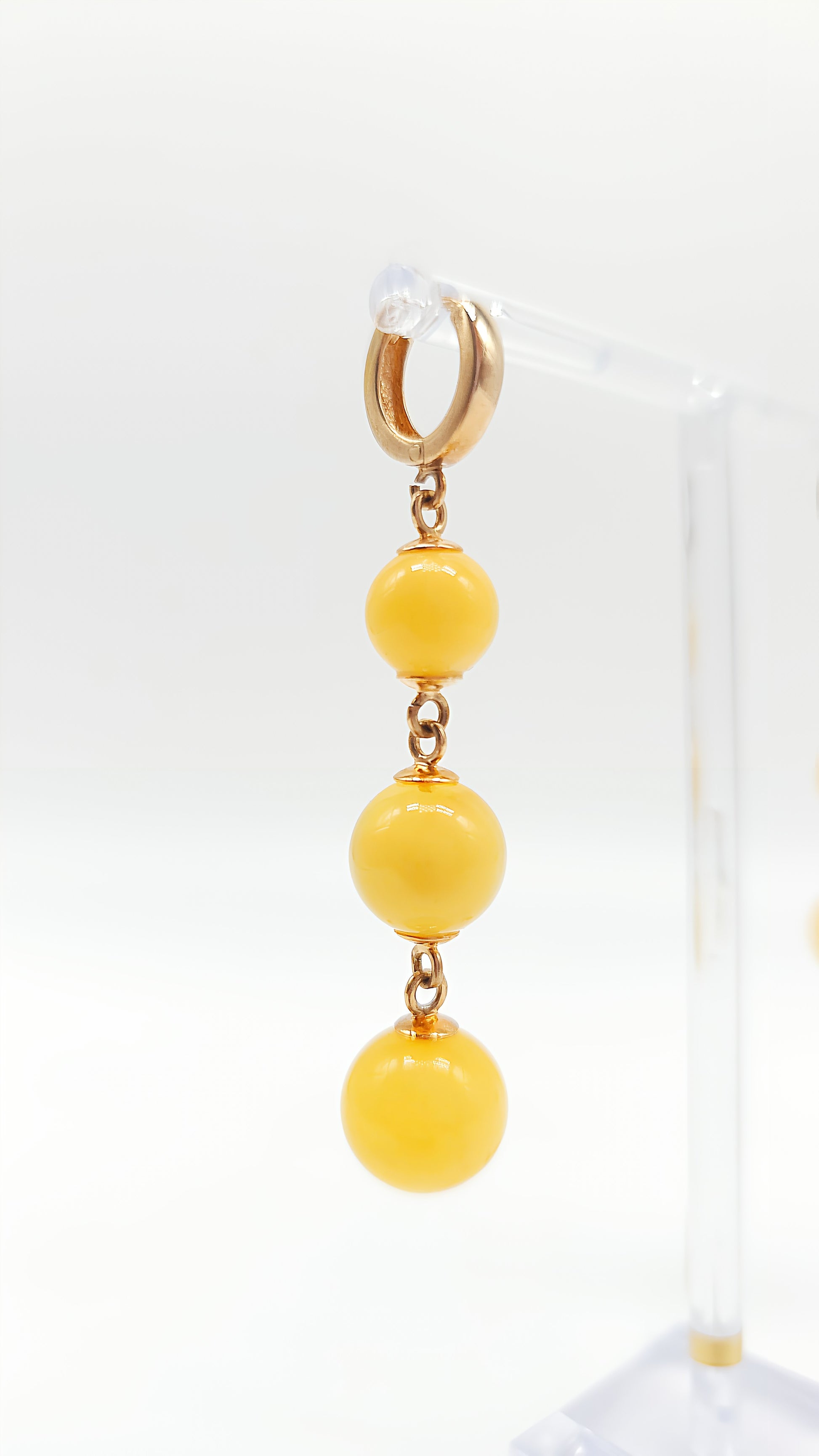 Diese eleganten Ohrhänger vereinen den warmen, goldenen Glanz von Bernstein mit der luxuriösen Note von vergoldetem 925er Sterlingsilber. Die drei perfekt geformten Bernsteinperlen fangen das Licht auf eine sanfte und faszinierende Weise ein, während die feinen Goldelemente dem Design eine zeitlose Eleganz verleihen. Diese handgefertigten Ohrringe sind ideal für besondere Anlässe oder als tägliches Accessoire für Damen, die auf der Suche nach einem Hauch von Luxus und Naturverbundenheit sind. Ein unverzichtbares Schmuckstück für jede Schmuckliebhaberin.