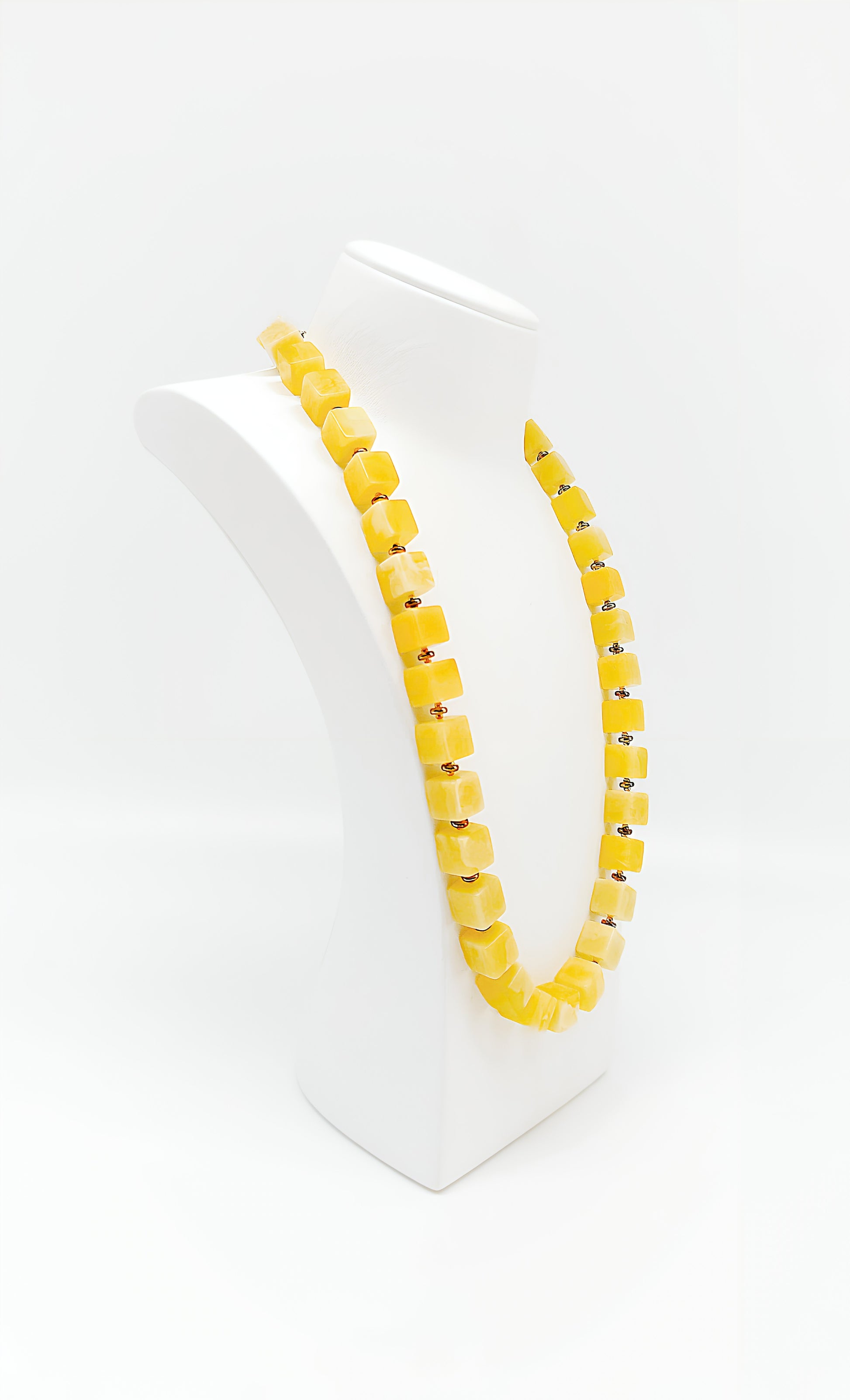 Dieses handgefertigte Unikat besticht durch seine strahlend gelben Bernsteinsteine, die das Licht in warmen, goldenen Tönen reflektieren. Die eckigen, kunstvoll geschliffenen Steine verleihen der Kette eine einzigartige Struktur und machen sie zu einem absoluten Hingucker. Der natürliche Glanz des Bernsteins zieht alle Blicke auf sich und passt sowohl zu eleganten Anlässen als auch als stilvolles Accessoire im Alltag. Ein wahres Meisterwerk der Natur, das die Persönlichkeit seiner Trägerin perfekt unterstreicht.
